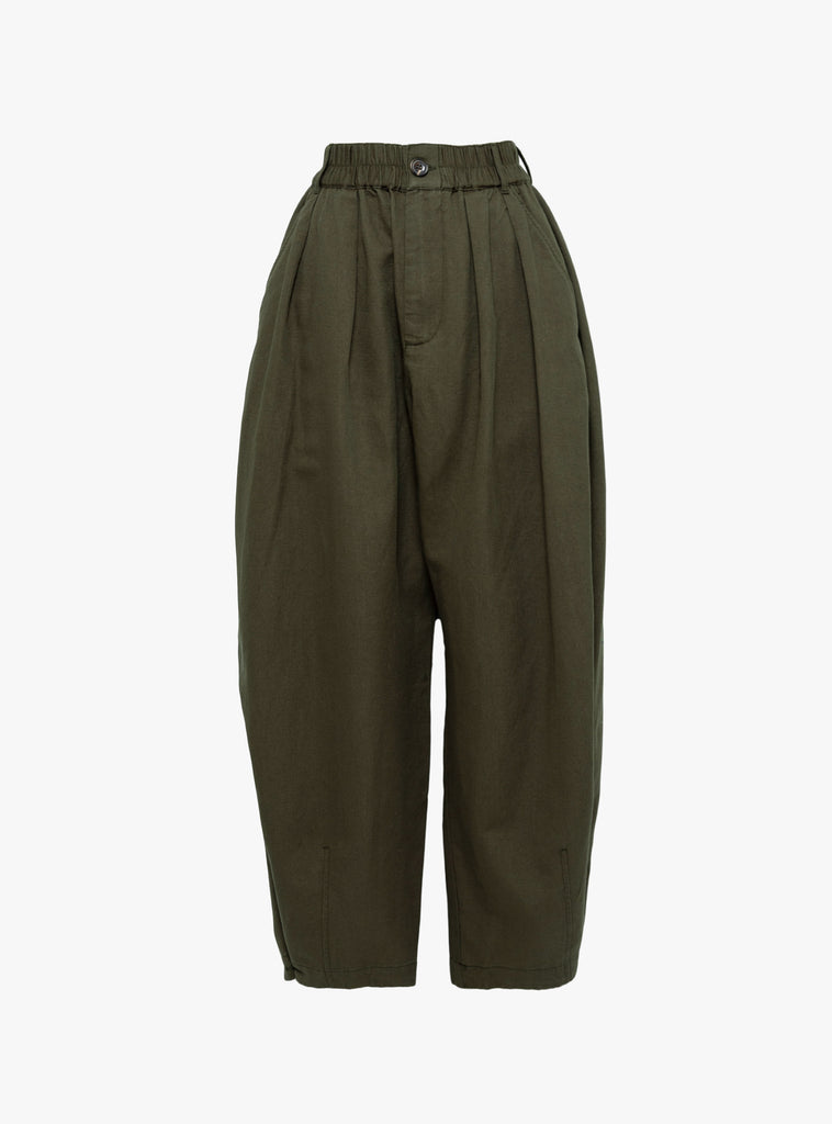 Enhance its proportions with a loose-fitting linen shirt either tucked into the front or left to hang over its high waistline.