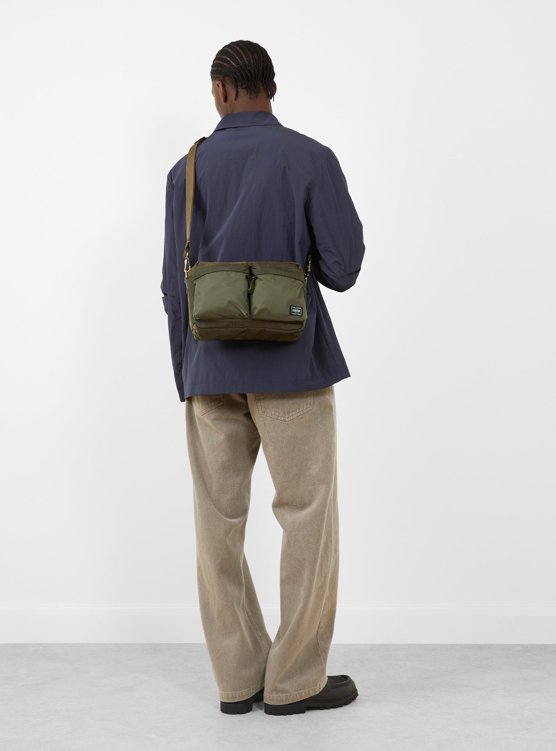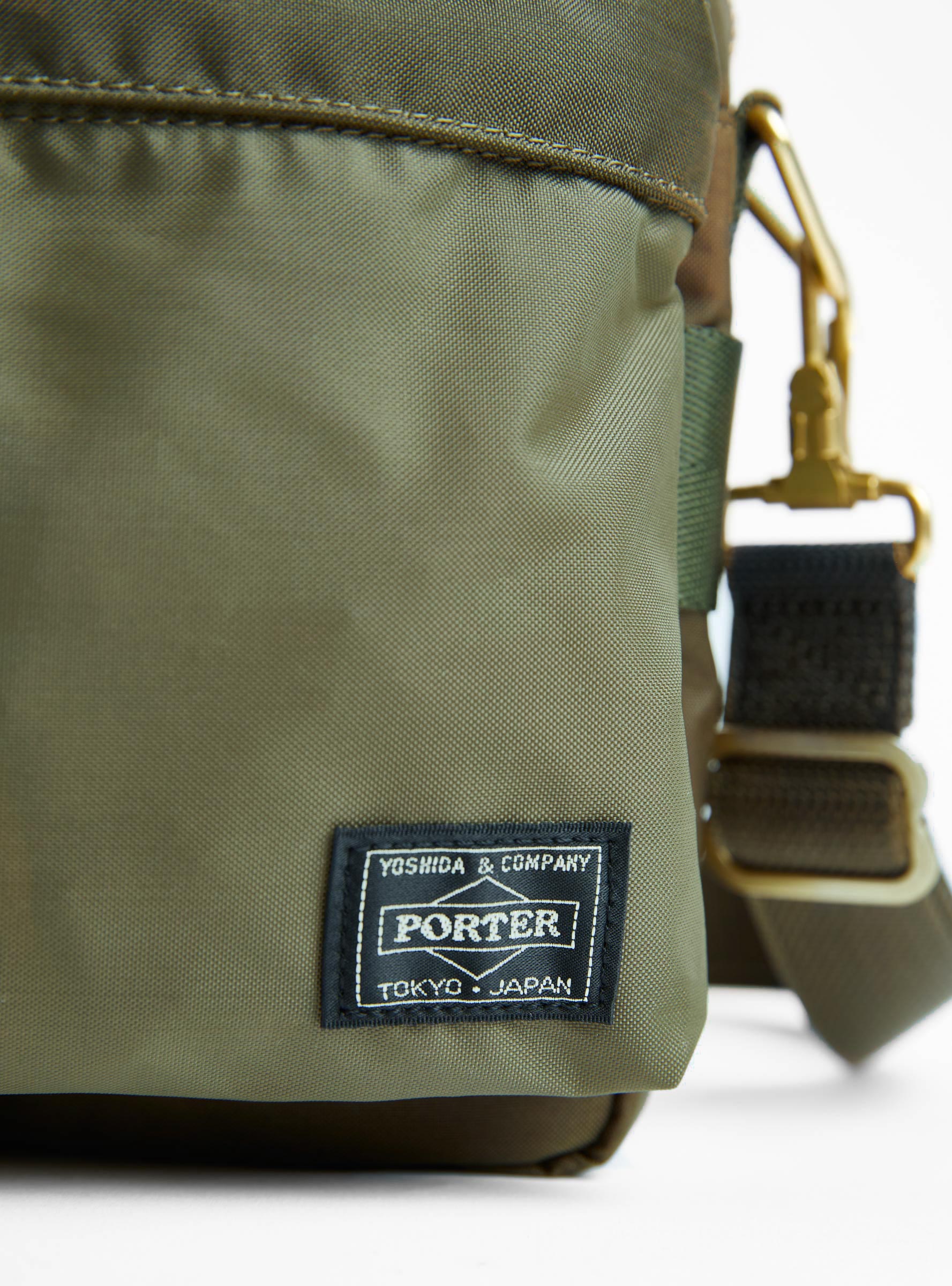 The FORCE Shoulder Bag (S) in Olive Drab from Porter Yoshida & Co. is defined by a subtle contrast in fabric tone between the main body and the front pocket, creating a layered effect. The outer is crafted from durable industrial-grade 210 denier nylon, while the interior features quilted ripstop nylon in a bold emergency orange, a detail inspired by military jacket linings.