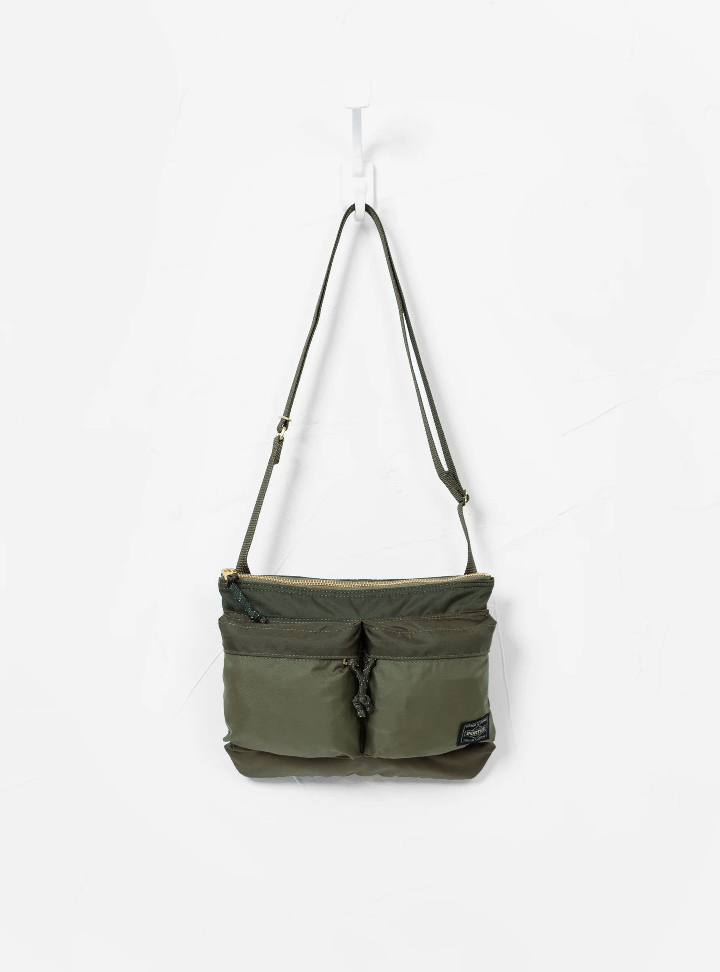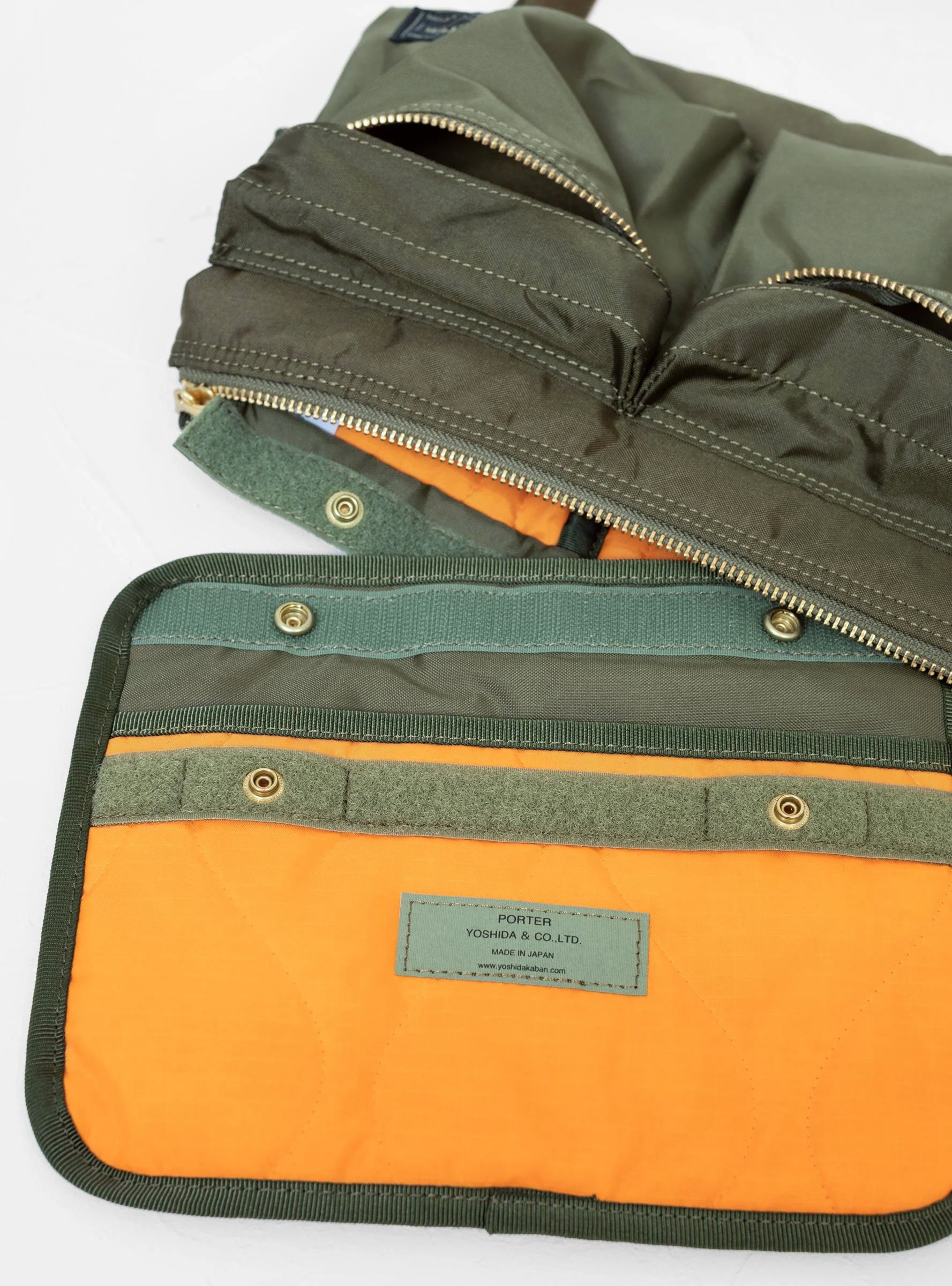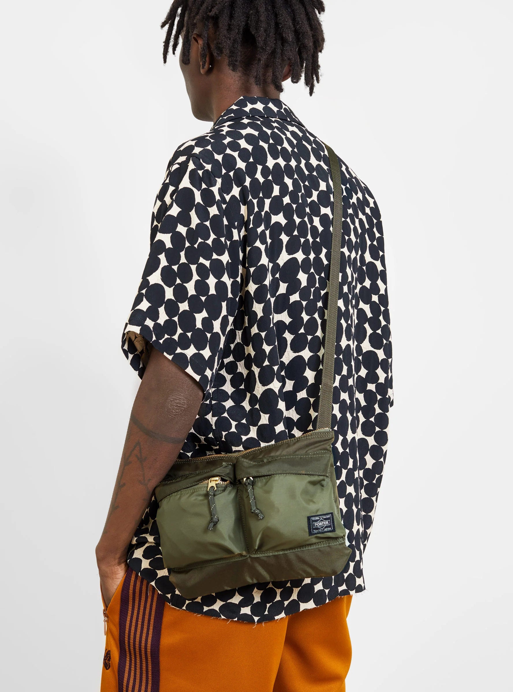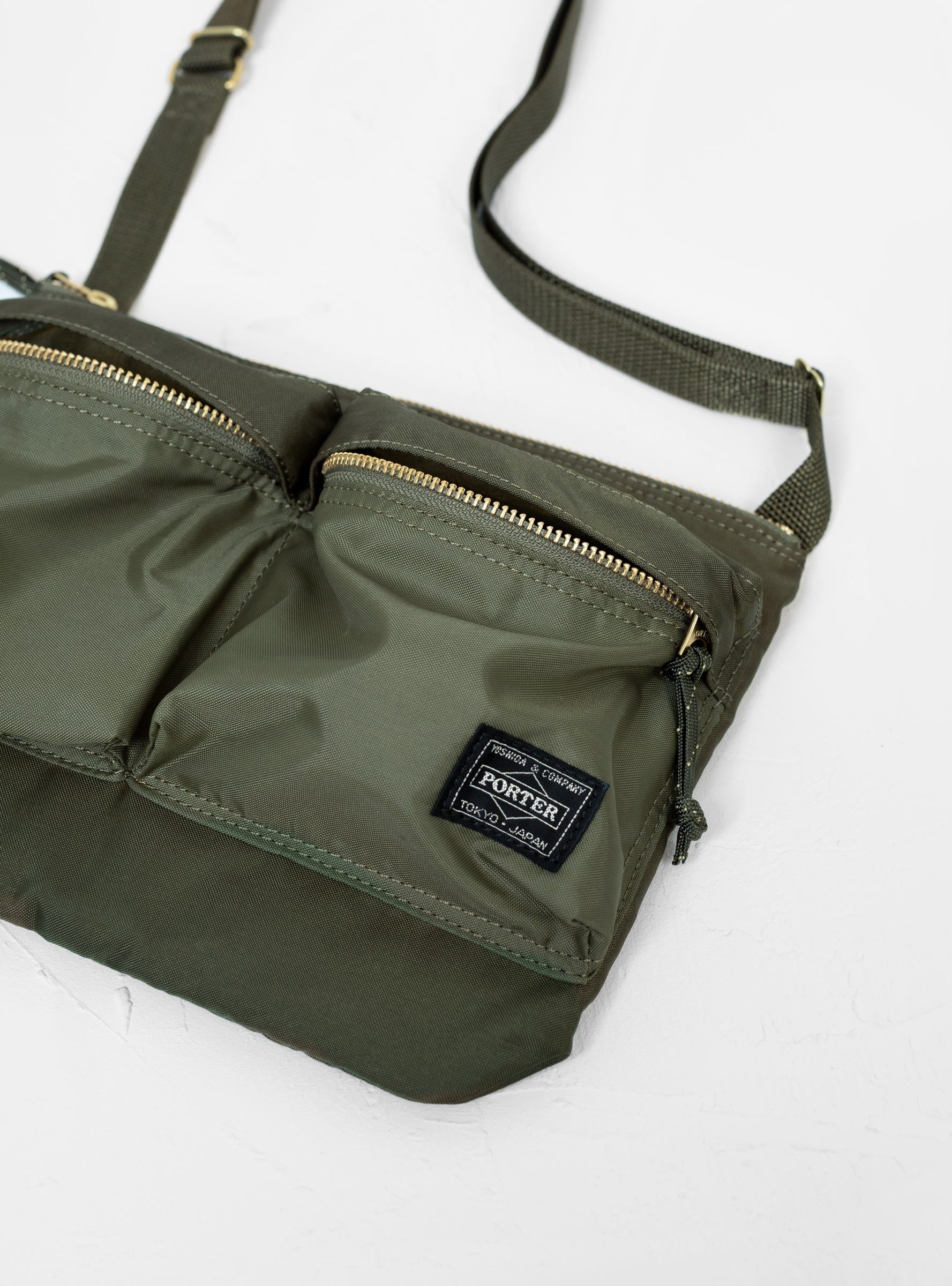 The FORCE Shoulder Bag by Porter Yoshida & Co. is a military-inspired piece crafted from nylon oxford knit with acrylic coating for durability. The main compartment opens with a dual zip closure, to reveal two internal patch pockets, one internal zip pocket and a removable, internal snap flap pocket. The outside features two 3D pockets allowing for easy access and is finished with an adjustable and detachable nylon tape strap.
