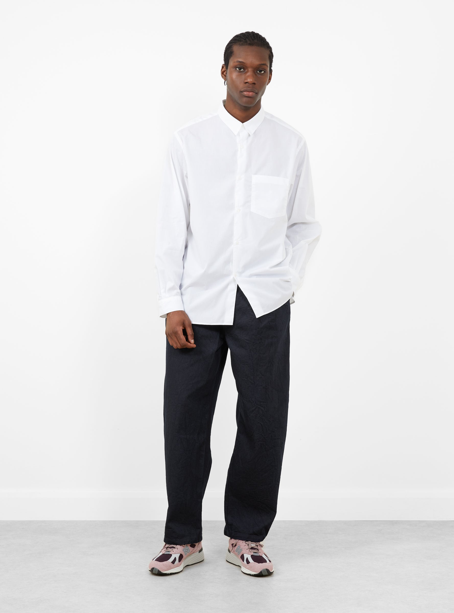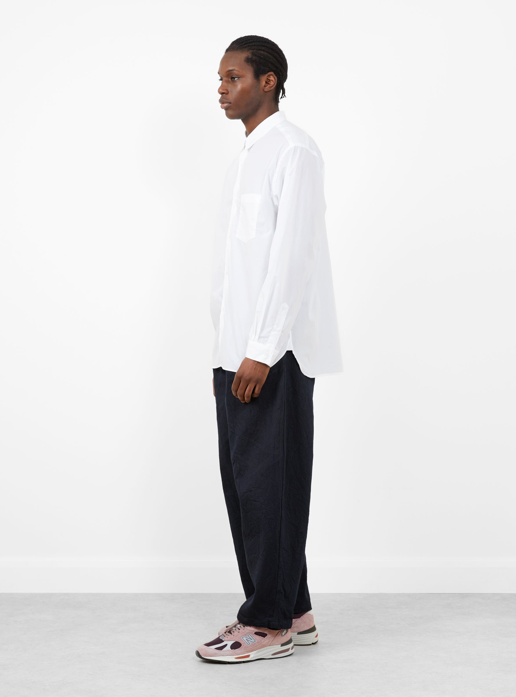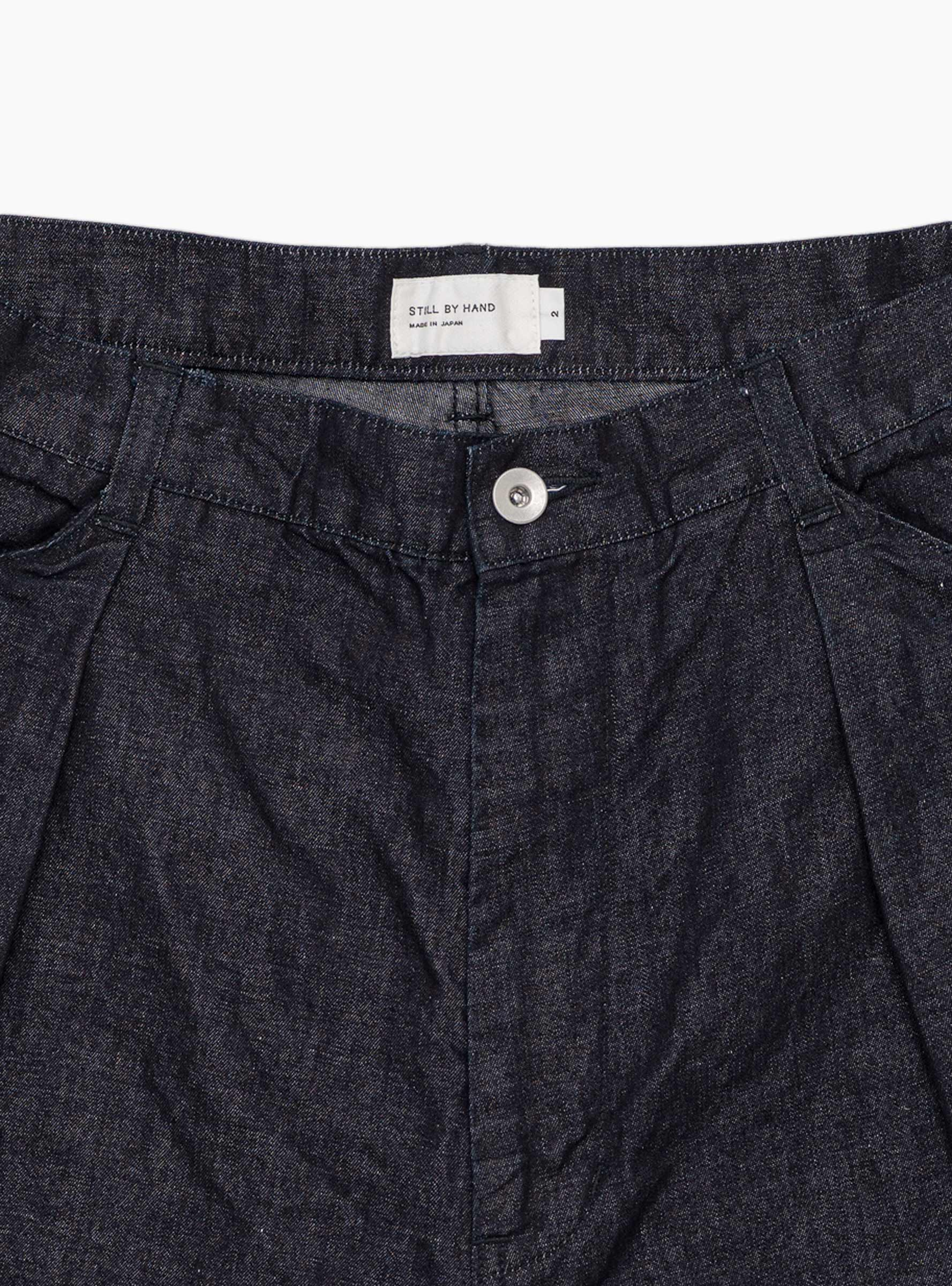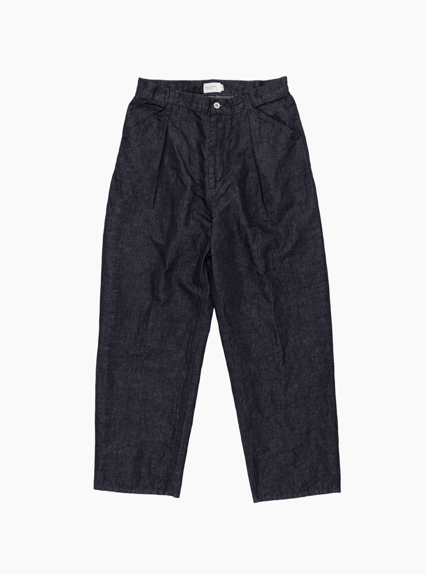 The 11.5 Oz Deep Tuck Denim Pants come in Dark Navy from Still By Hand and are made in Japan from 100% cotton 11.5oz denim. Cut with a single pleat and a wide, tapered leg, they are roomy through the thigh with curved outseams that shape the silhouette. Slanted side pockets and two welt back pockets complete the design.