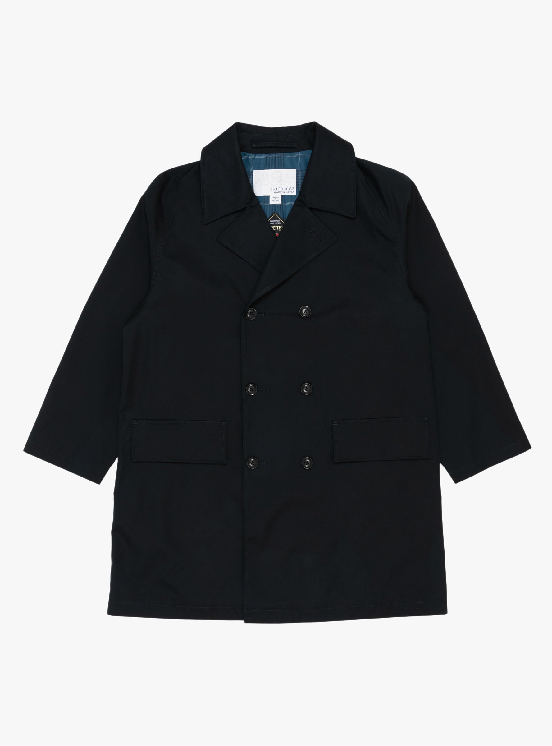 Made in Japan, The 2L Cotton GORE-TEX Balmacaan Coat from nanamica comes in in Navy and falls to a relaxed A-line silhouette. It's crafted from yarn-dyed cotton gabardine with GORE-TEX fabric for waterproof, breathable protection. Fully seam-taped and lined with house-check organic cotton and COOLMAX®, it features raglan sleeves and two inner zip pockets with waterproof linings.