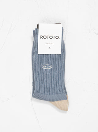Made in Japan from a cotton-blend yarn, these Smoke Blue 90s Logo Crew socks from ROTOTO embody nostalgic 90s sock styles and are constructed using vintage knitting machinery.