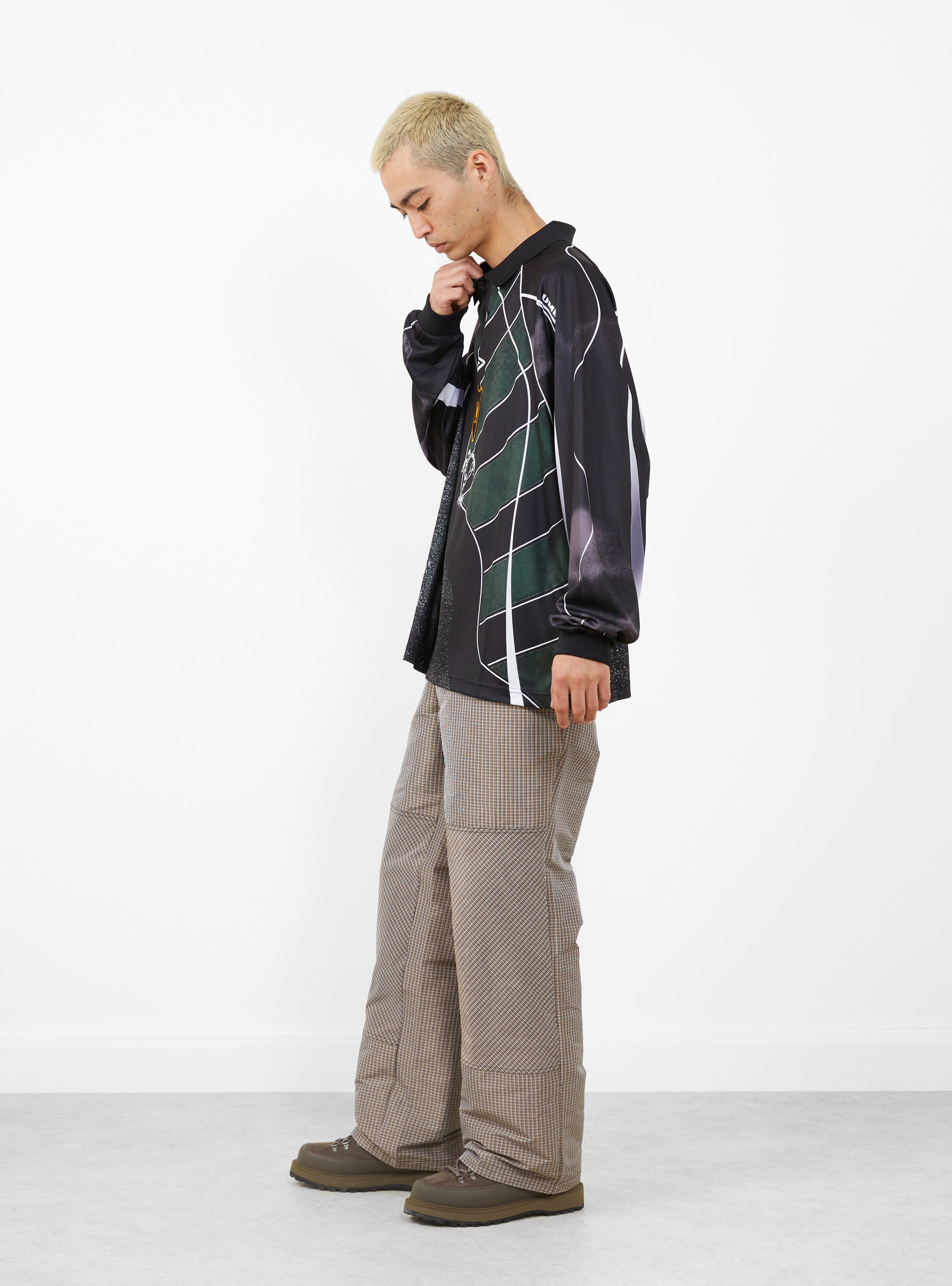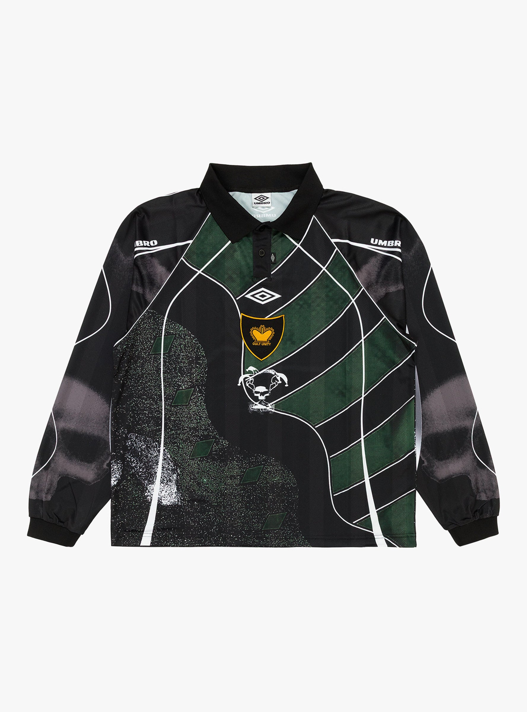 The 95/96 Long Sleeve Polo in Dark Green from Umbro by Slam Jam is made in Portugal and inspired by vintage football polos. Designed with a spread collar and ribbed cuffs, it features a button closure and an all-over printed graphic, finished with a woven logo patch at the front.
