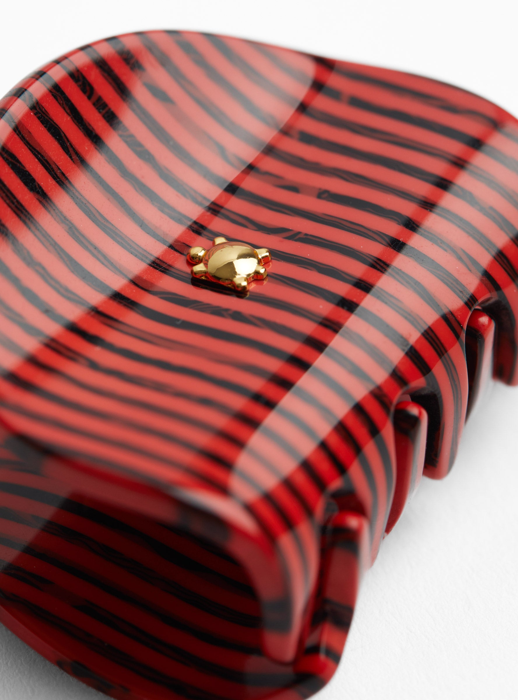 The Adorable Claw Clip Pencil Stripes Red from Turtle Story comes in a stripe pattern and is handmade from Italian cellulose acetate. The small rounded clip features a hand inserted Turtle Story logo and a polished finish.