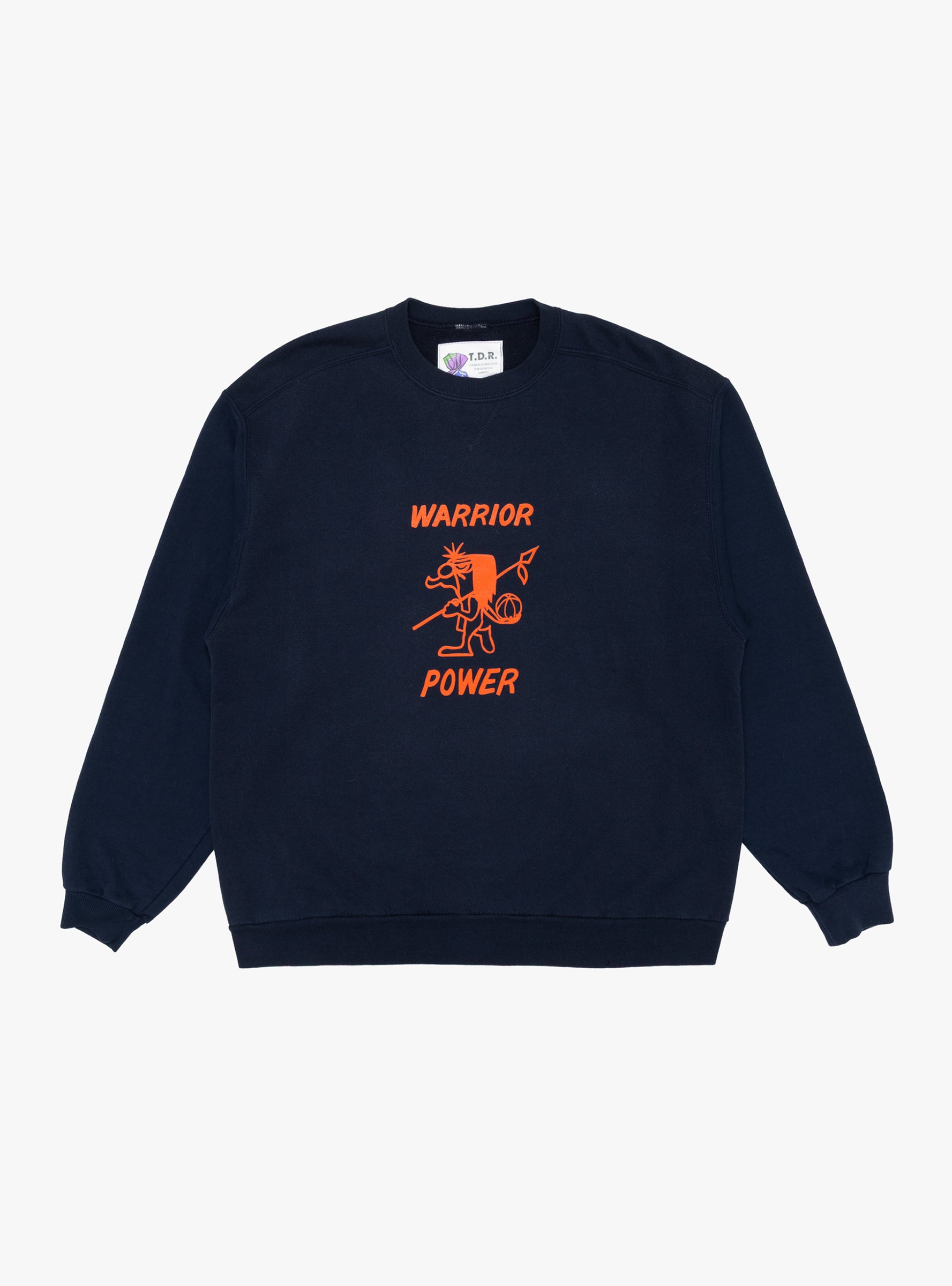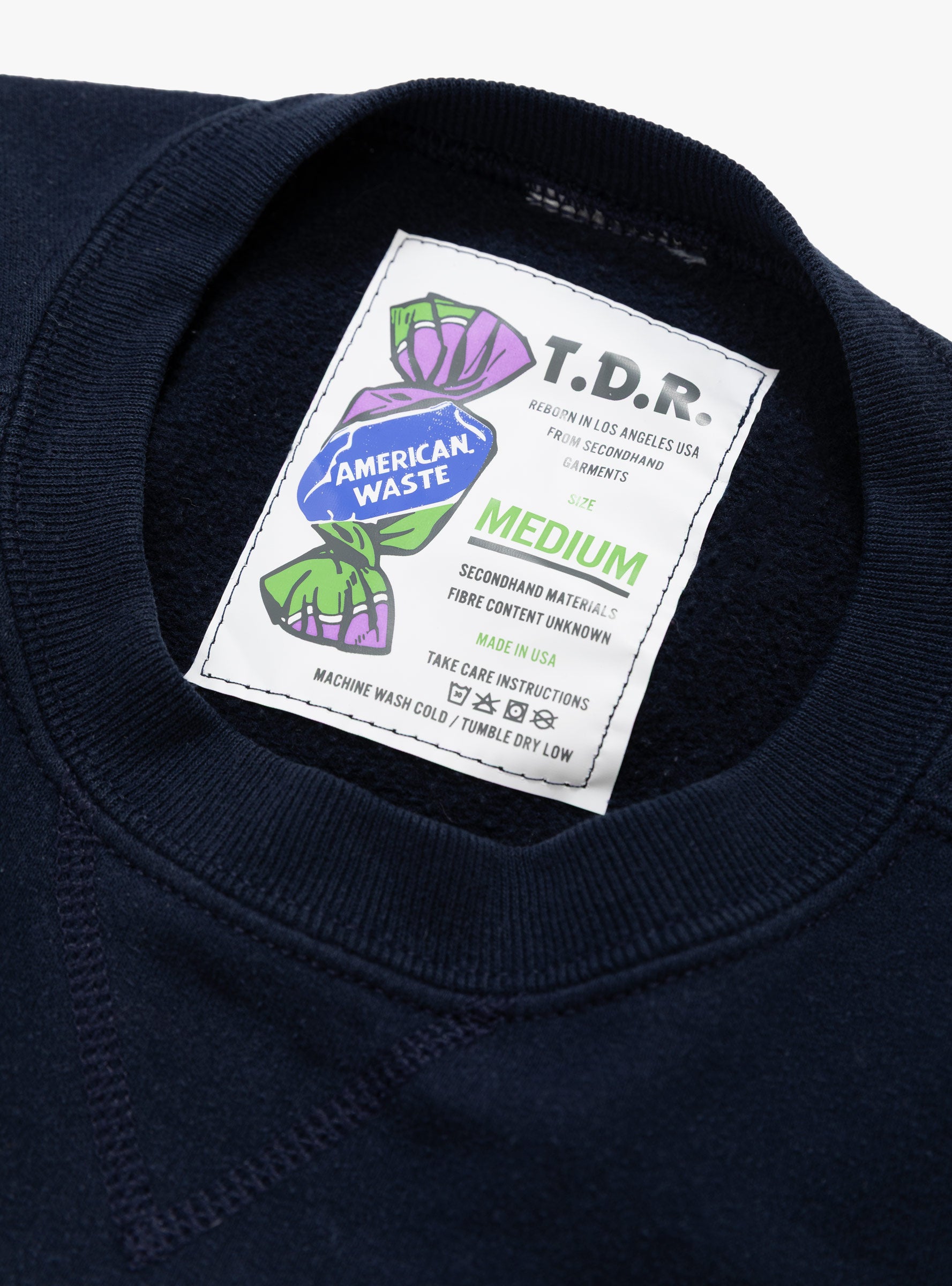 The American Waste Sweatshirt from TDR comes in Navy and is made using deadstock vintage American sweats. Each piece is individually stripped of its original colour and re-dyed, resulting in natural variation in shade and size across the range. Finished with custom TDR graphics, every sweatshirt is screen printed in the UK, giving reclaimed garments a new life. Due to the vintage and individual nature of the sweats, fibre composition varies.