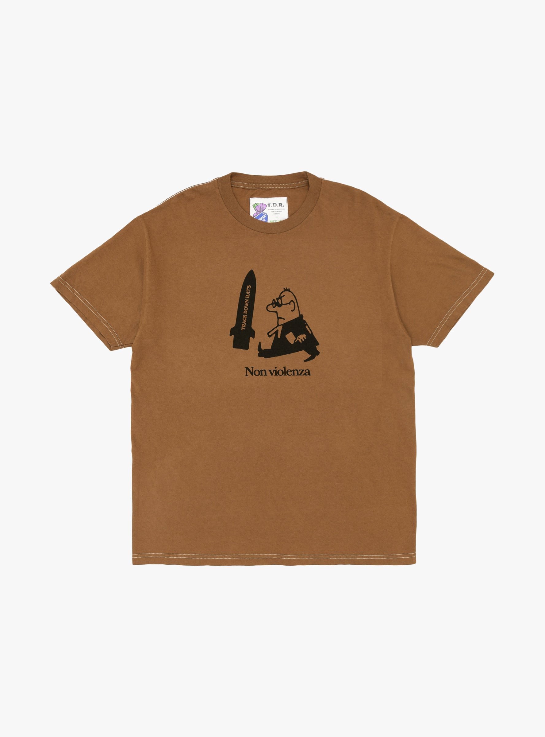 The American Waste T-Shirt from TDR comes in Army Brown and is made using deadstock vintage American tees. Each piece is individually stripped of its original colour and re-dyed, giving every t-shirt a slightly different shade and size. Finished with custom TDR graphics, each style is screen printed in the UK, giving new life to reclaimed garments. Due to the vintage nature of the tees, fabric composition varies.