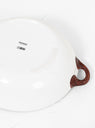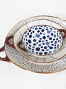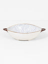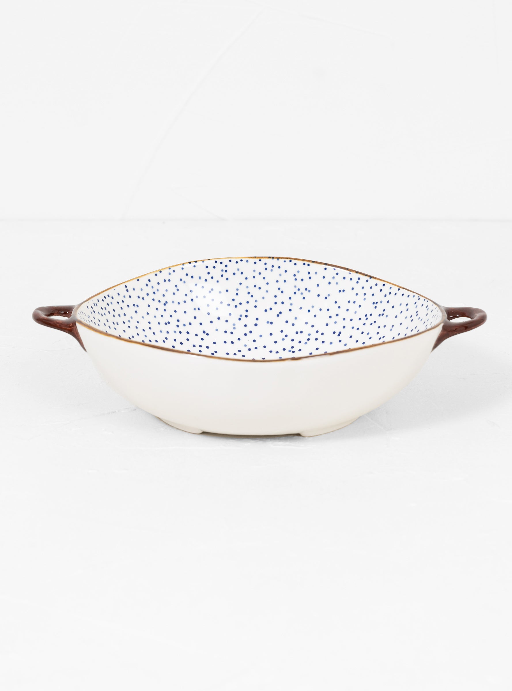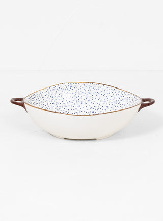 The Anafi Soup Bowl from Pomax comes in a white and blue colourway. The porcelain bowl is finished with a brown trim, brown handles and fine, blue spot detailing throughout the centre of the glazed bowl.