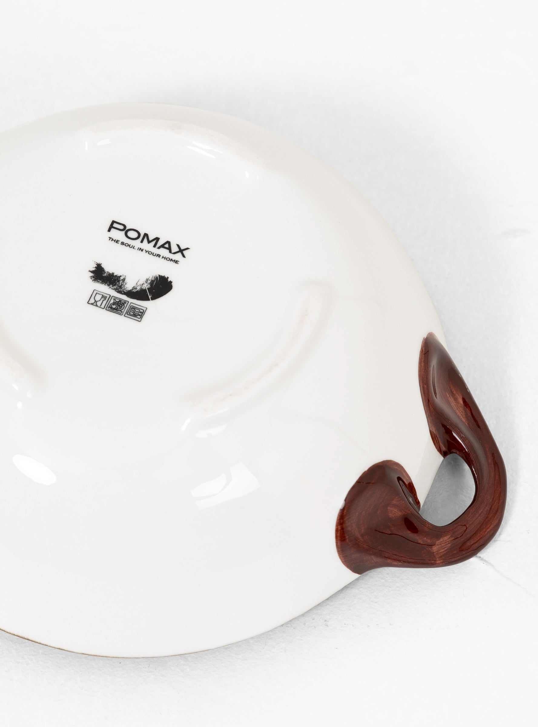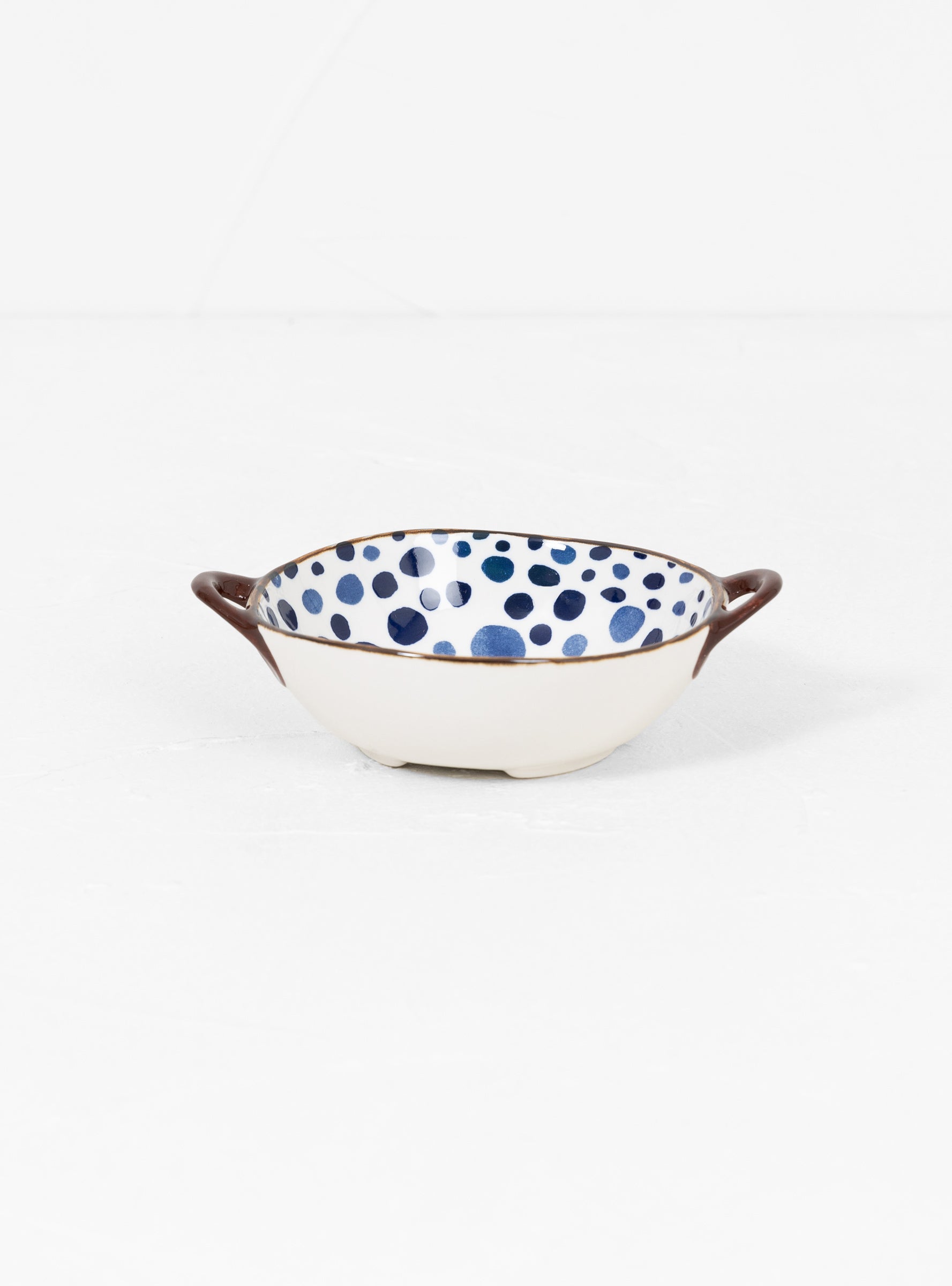 The Anafi Soup Bowl from Pomax comes in a white and blue colourway. The porcelain bowl is finished with a brown trim, brown handles and a blue spot detailing throughout the centre of the glazed bowl.