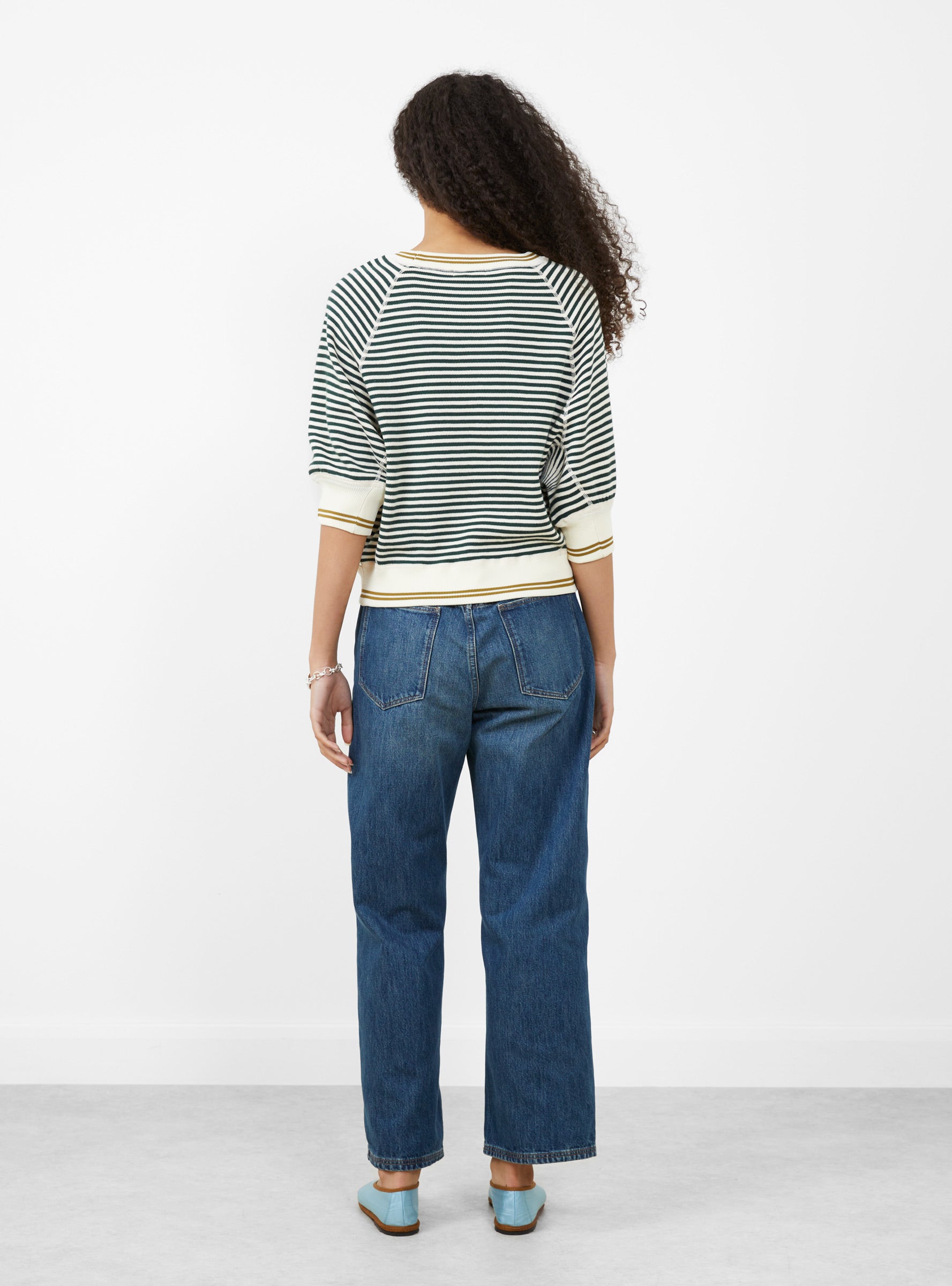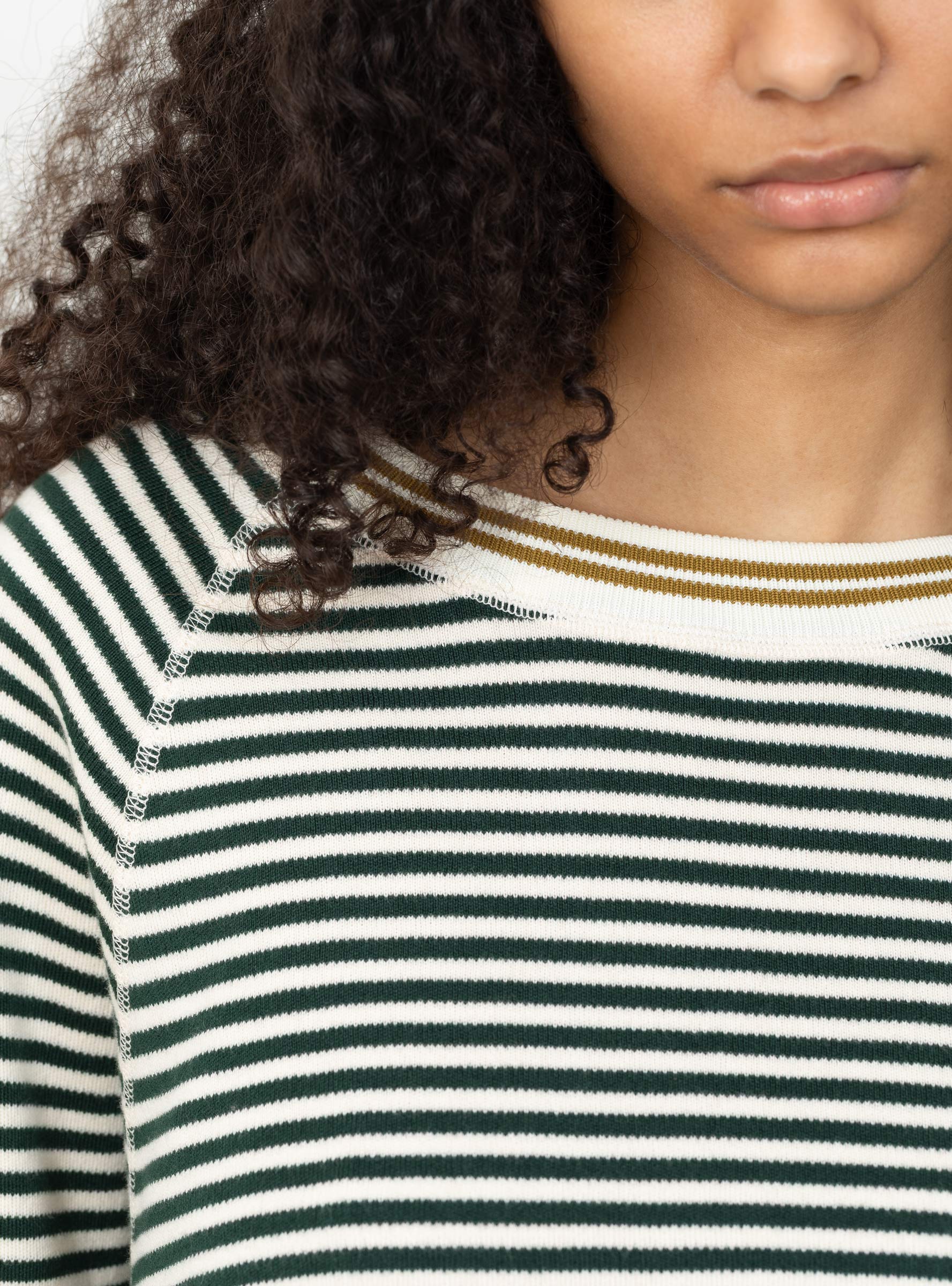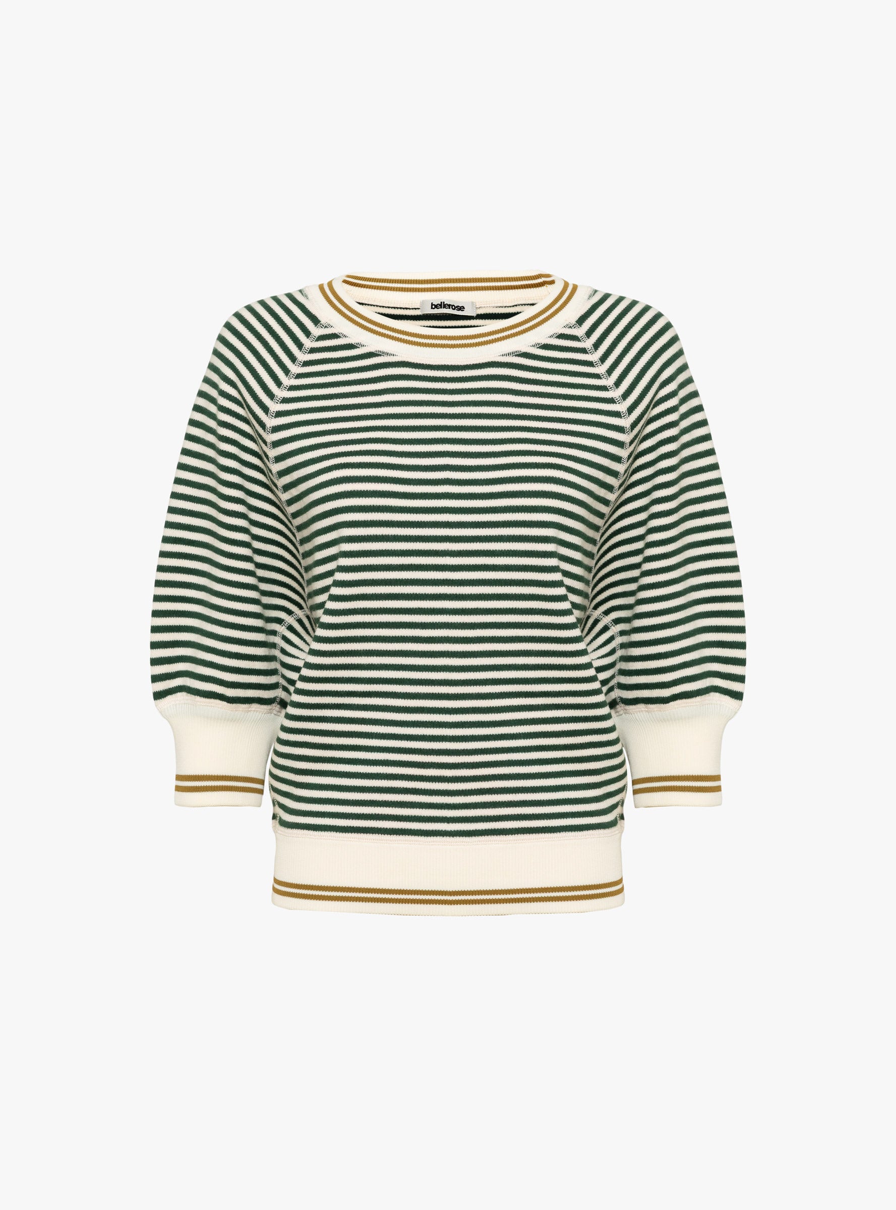 The Anglet Knit from Bellerose comes in Botanica, Milkyway, and Mustard. Made from a soft cotton blend, this oversized crewneck sweater features 3/4 raglan sleeves, fine bottle green stripes on an ecru base, and contrast mustard detailing at the collar and hem. Ribbed edges and a double rib crewneck add structure, while the fully fashioned construction and fine gauge knit ensure a polished yet relaxed silhouette.