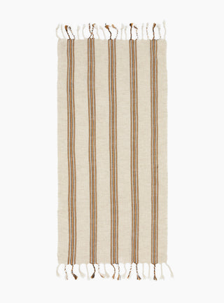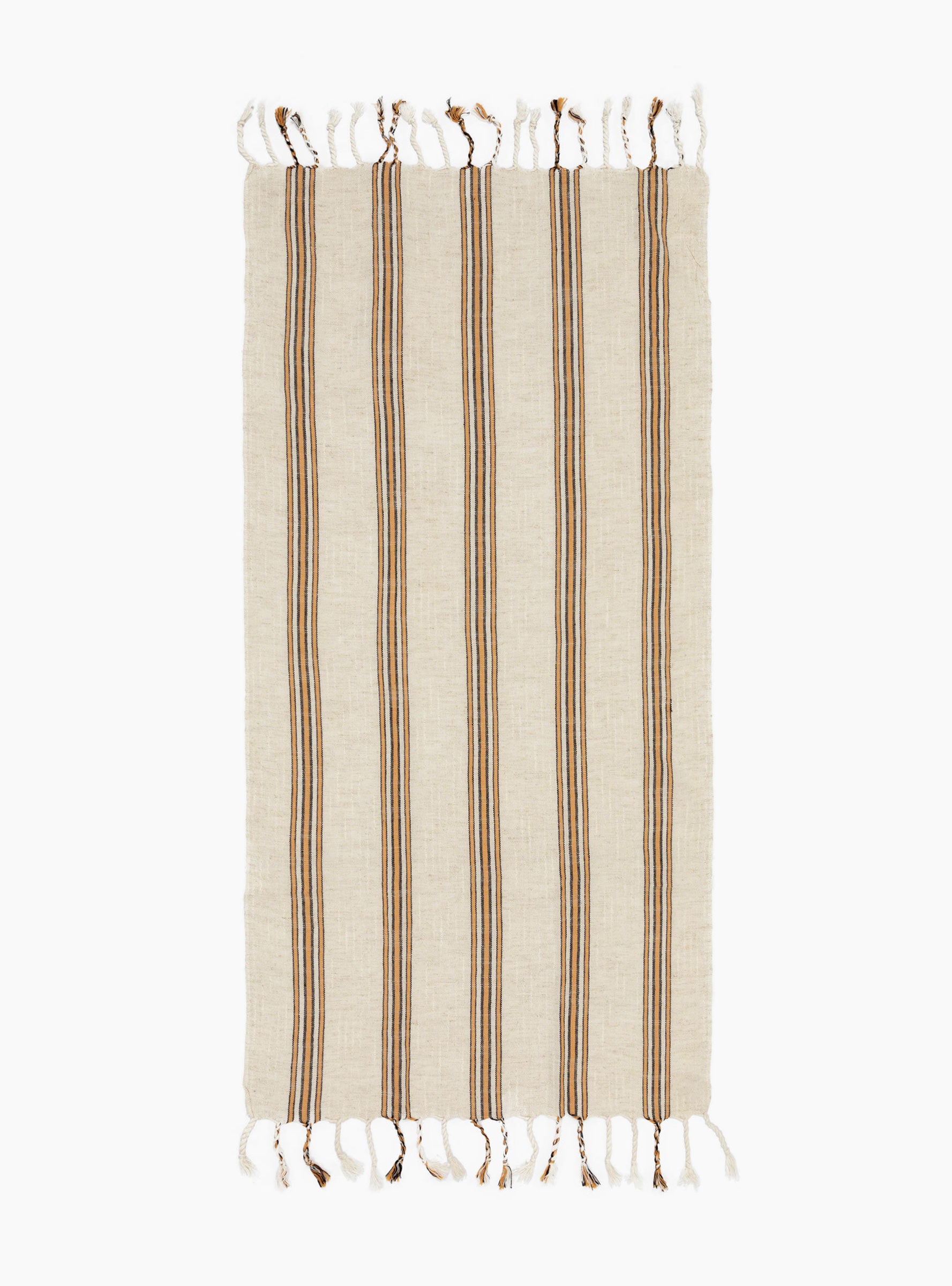 Featuring apricot-coloured stripes, this hand towel from Mizar & Alcor is inspired by the earthy textures found throughout the Mediterranean. It’s handwoven in Turkey on centuries-old looms using a quick-drying blend of linen and cotton and features braided tassel fringing trims the ends.