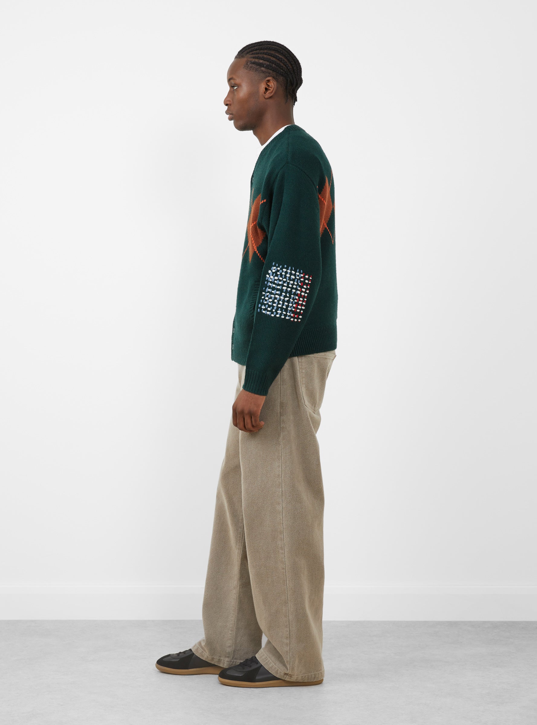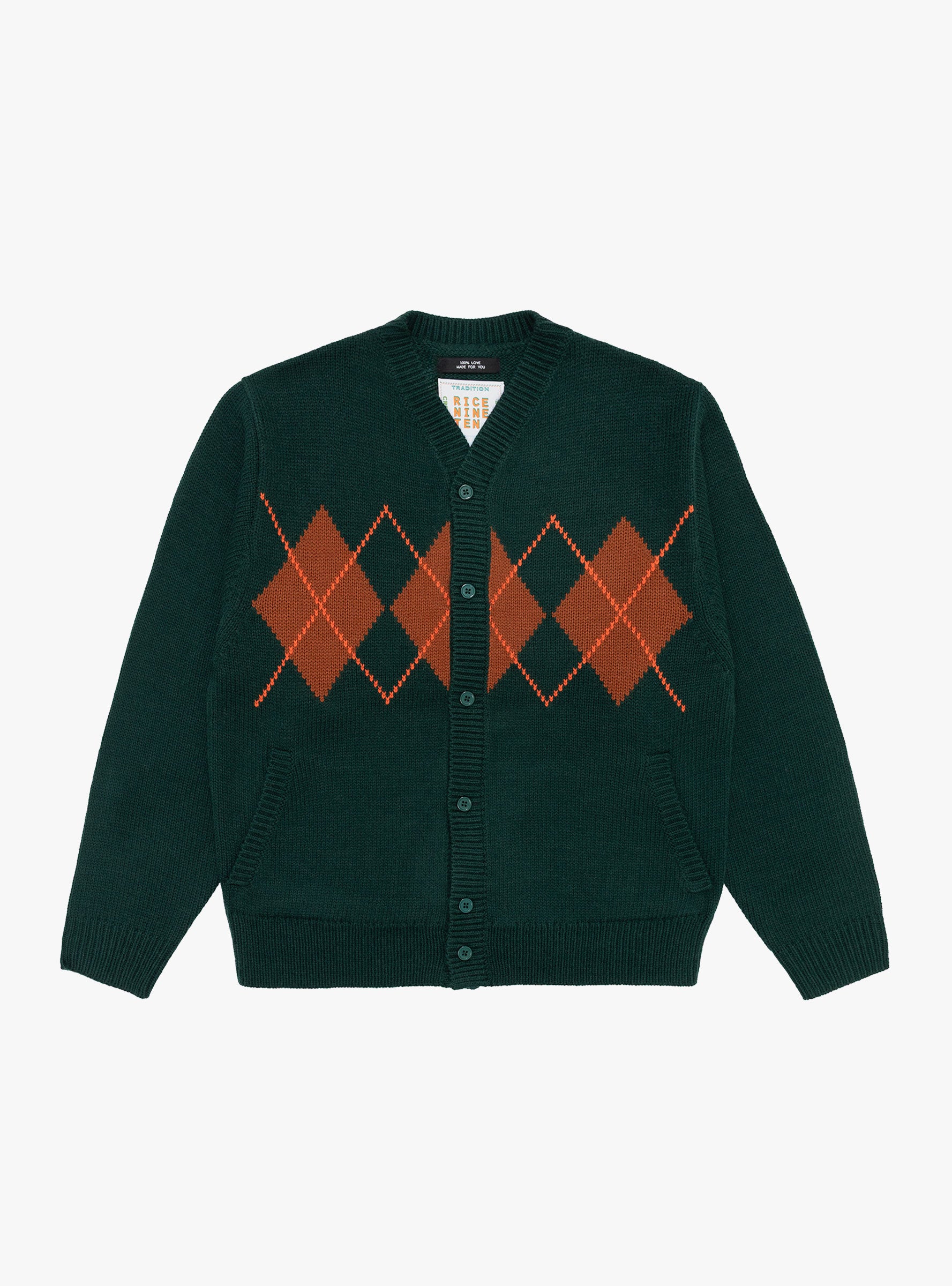 The Argyle Cardigan in Dark Green from Rice Nine Ten is crafted from a soft and supple wool blend yarn. Designed with a classic argyle pattern, it features hand-embroidered contrasting stitches at the elbows, resembling repair marks and adding a crafted detail. The cardigan is cut with a shallow V-neckline and finished with a button-down front for easy layering.