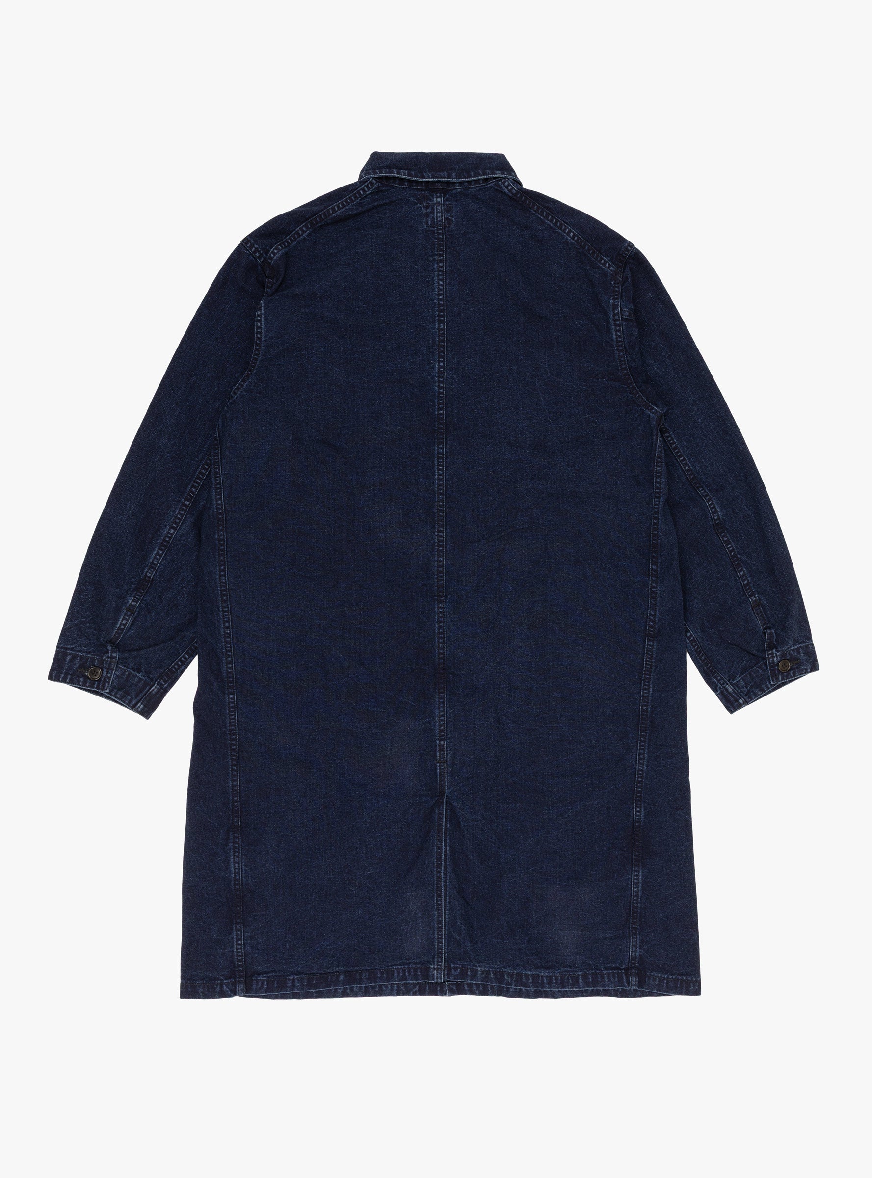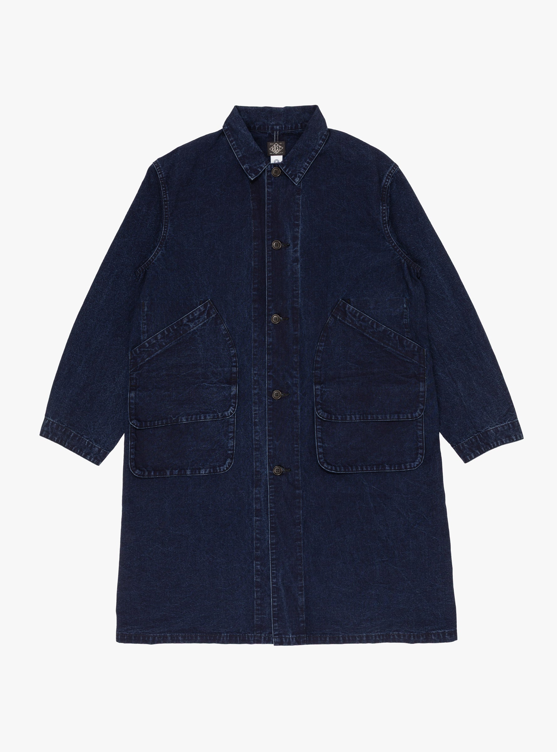 The Atelier DEE Vintage Canvas Jacket from Post O'Alls comes in Deep Washed Indigo and is made in Japan from deepwashed cotton. This relaxed shop coat features Post O'Alls’ signature swinging DEE pockets, creating a subtle contrast in tension and a dynamic silhouette throughout the jacket.