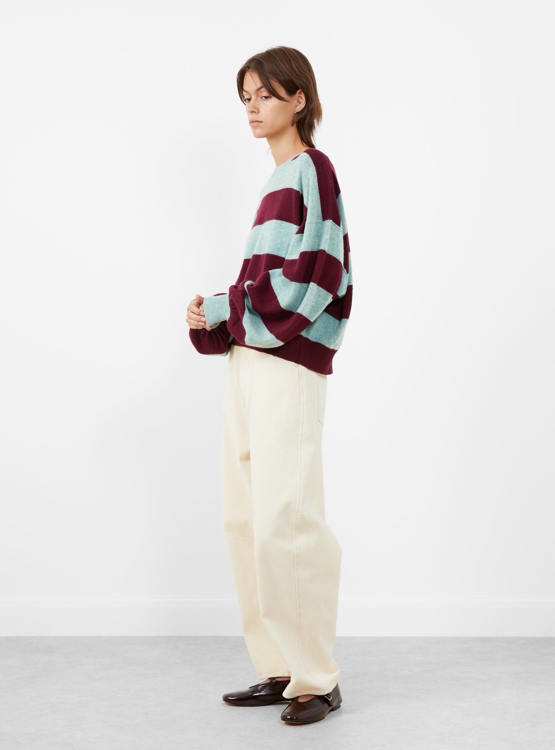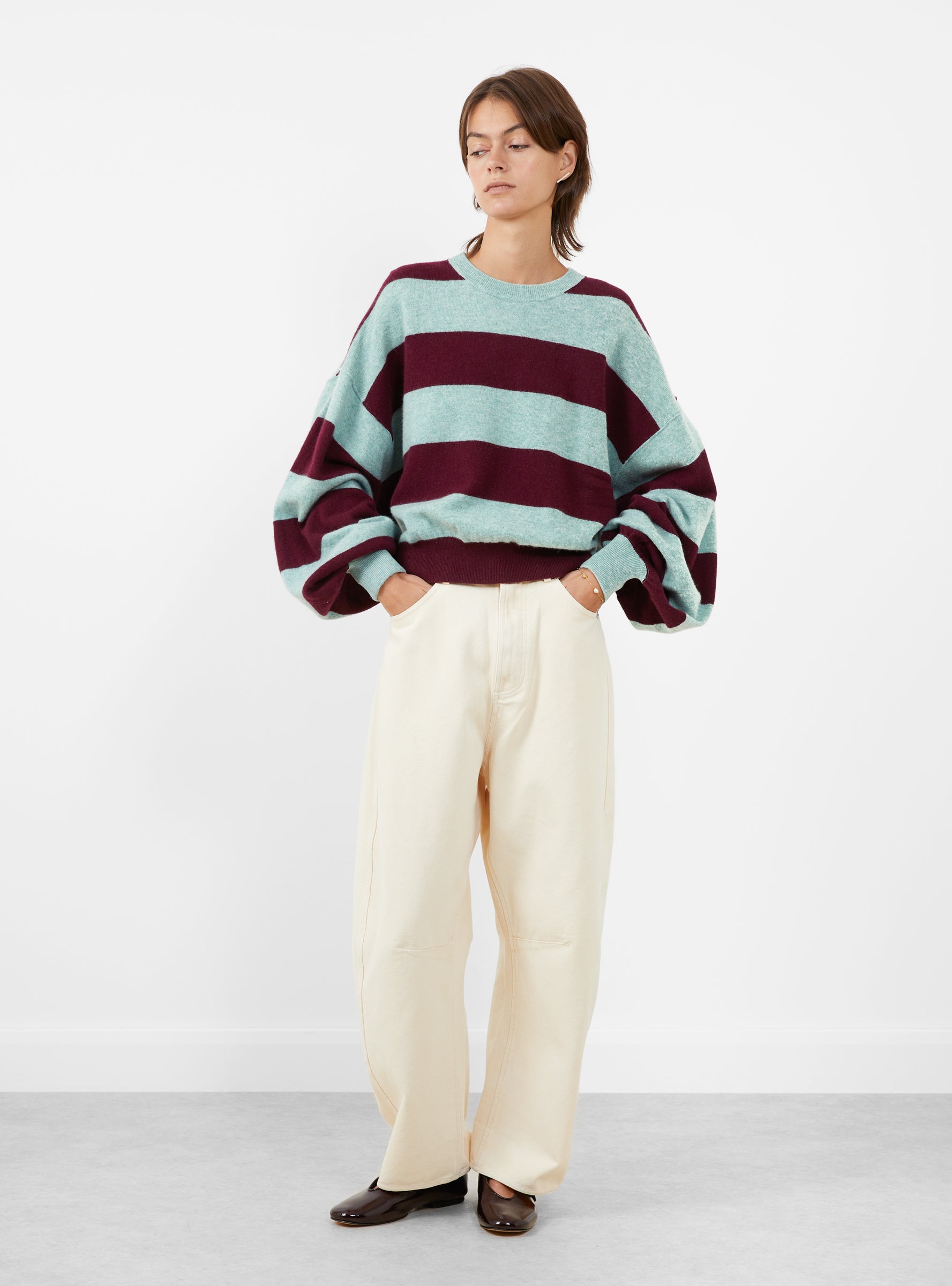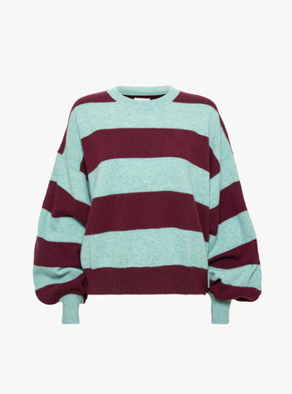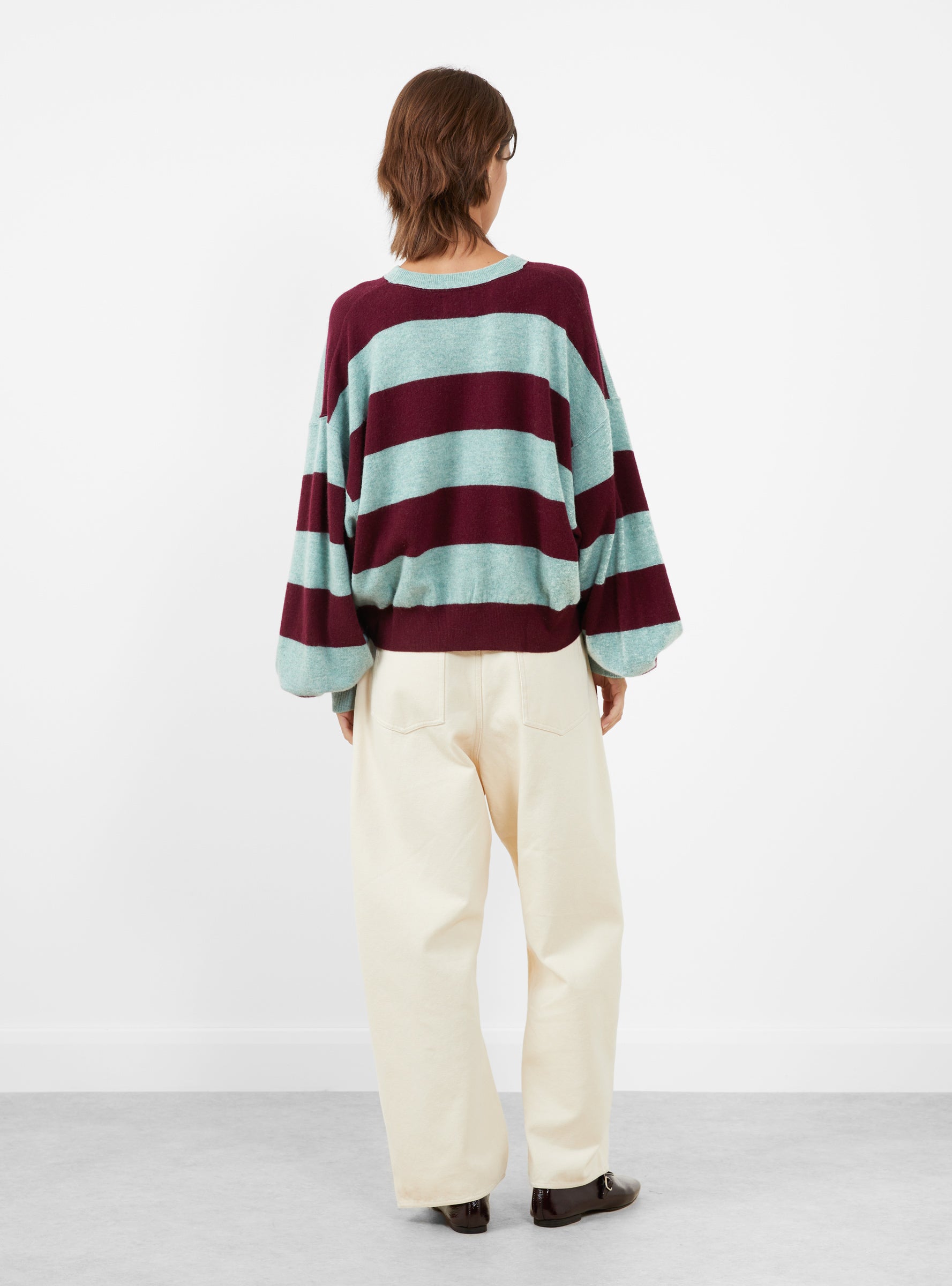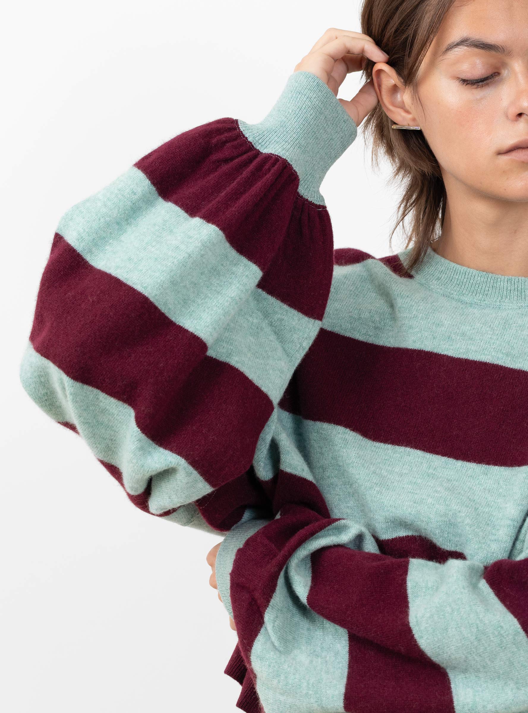 The Attus Knit Jumper from Bellerose arrives in Burgundy Stripe. This cropped, oversized knit features bold blue and burgundy stripes, dropped shoulders and voluminous balloon sleeves. Made from soft wool with ribbed trims, it brings playful structure to a cold-weather staple.