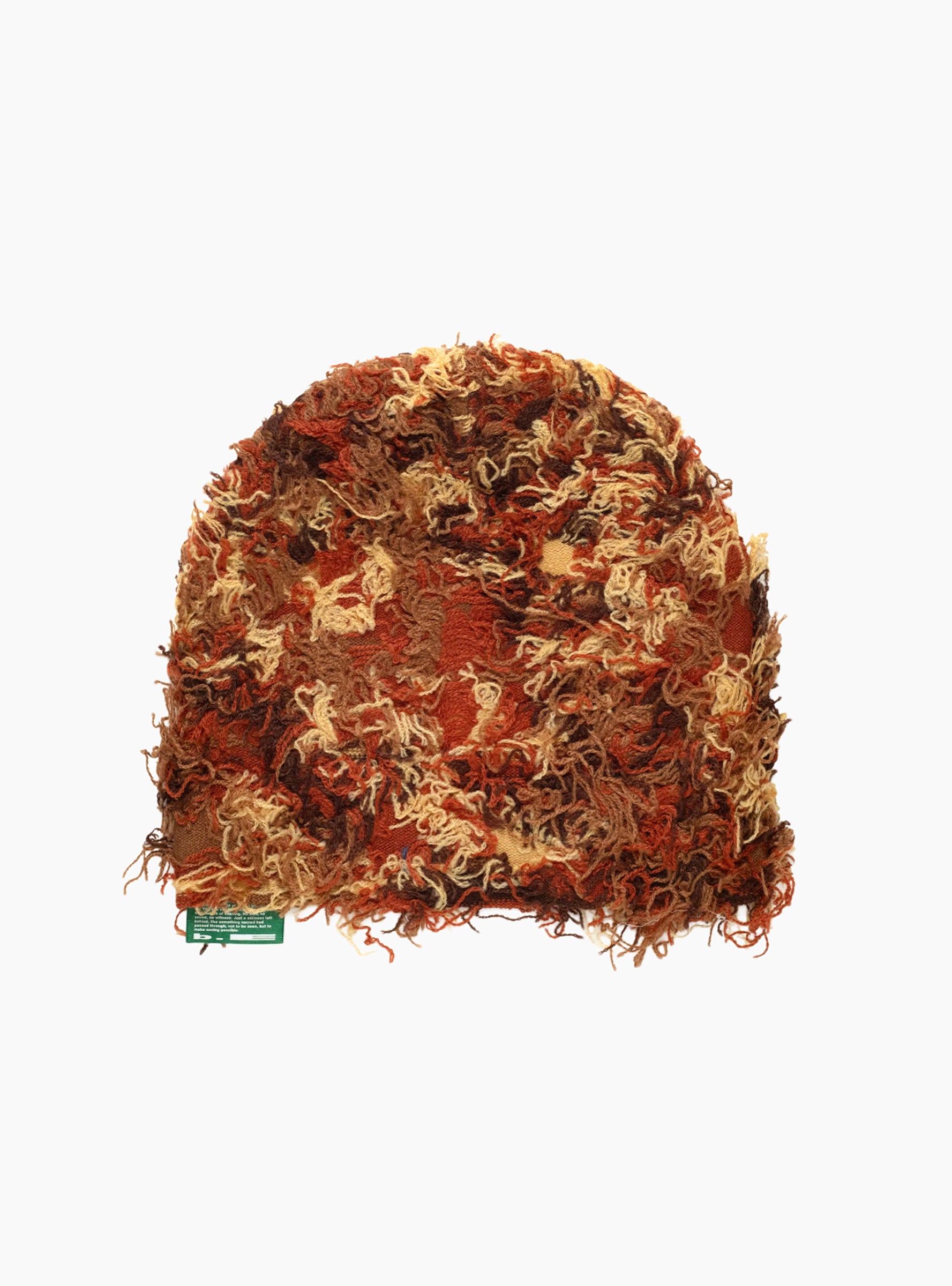 The b.E Camo Beanie in Sand and Brown from b.Eautiful is crafted from soft acrylic with a bold brown and orange camo design. Featuring graphic details on the front and back, it is finished with loose thread detailing on the inside for a textured look.