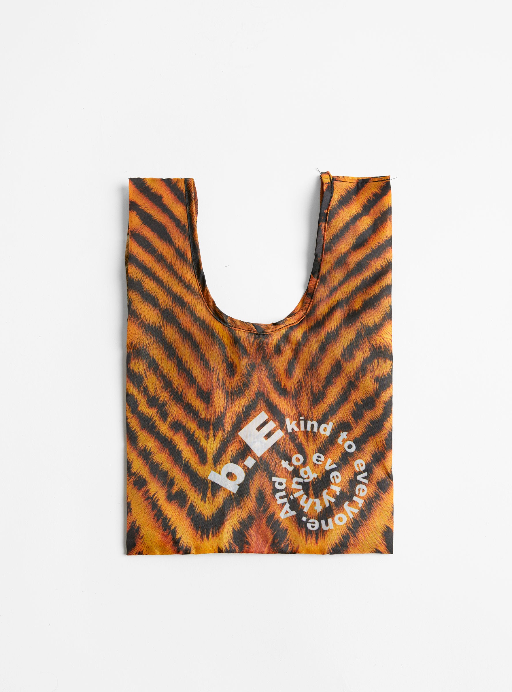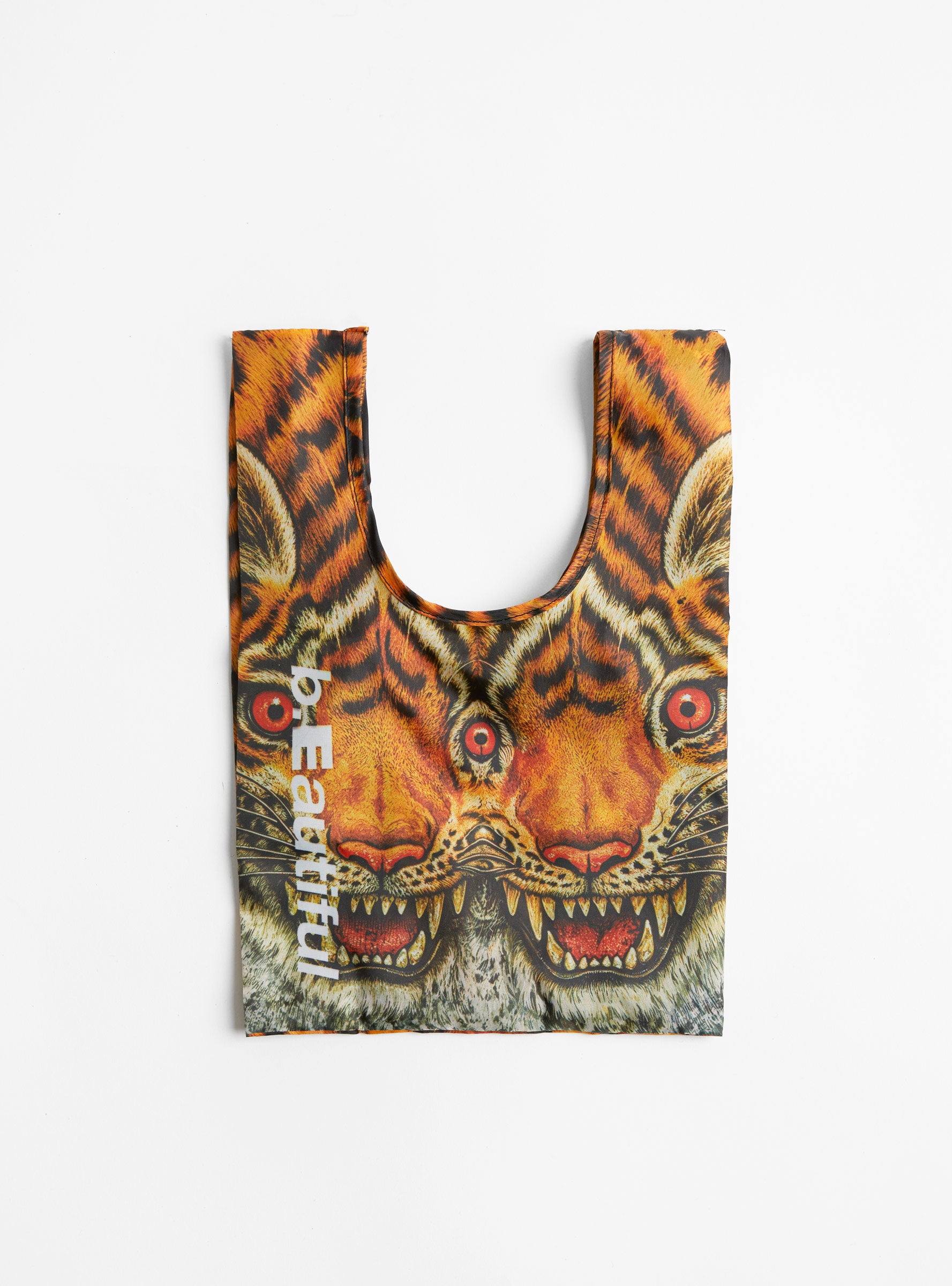 The Baby Tiger Reusable Bag Mini from b.Eautiful is made from recycled polyester. The mini tote folds into a 3 x 3 inch pouch, holds up to 50 lbs, and features a bold tiger graphic with logo details on the front and back.