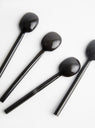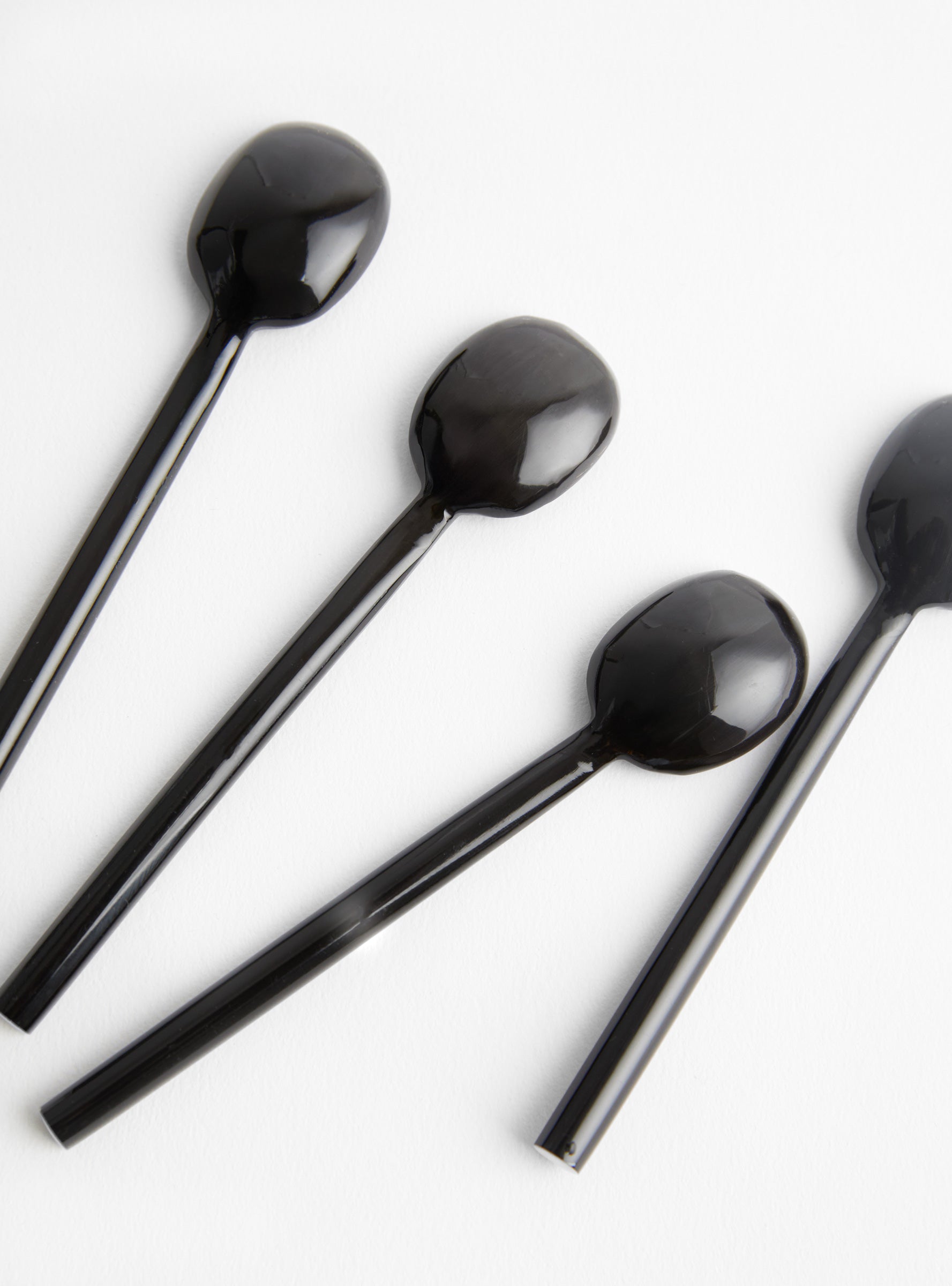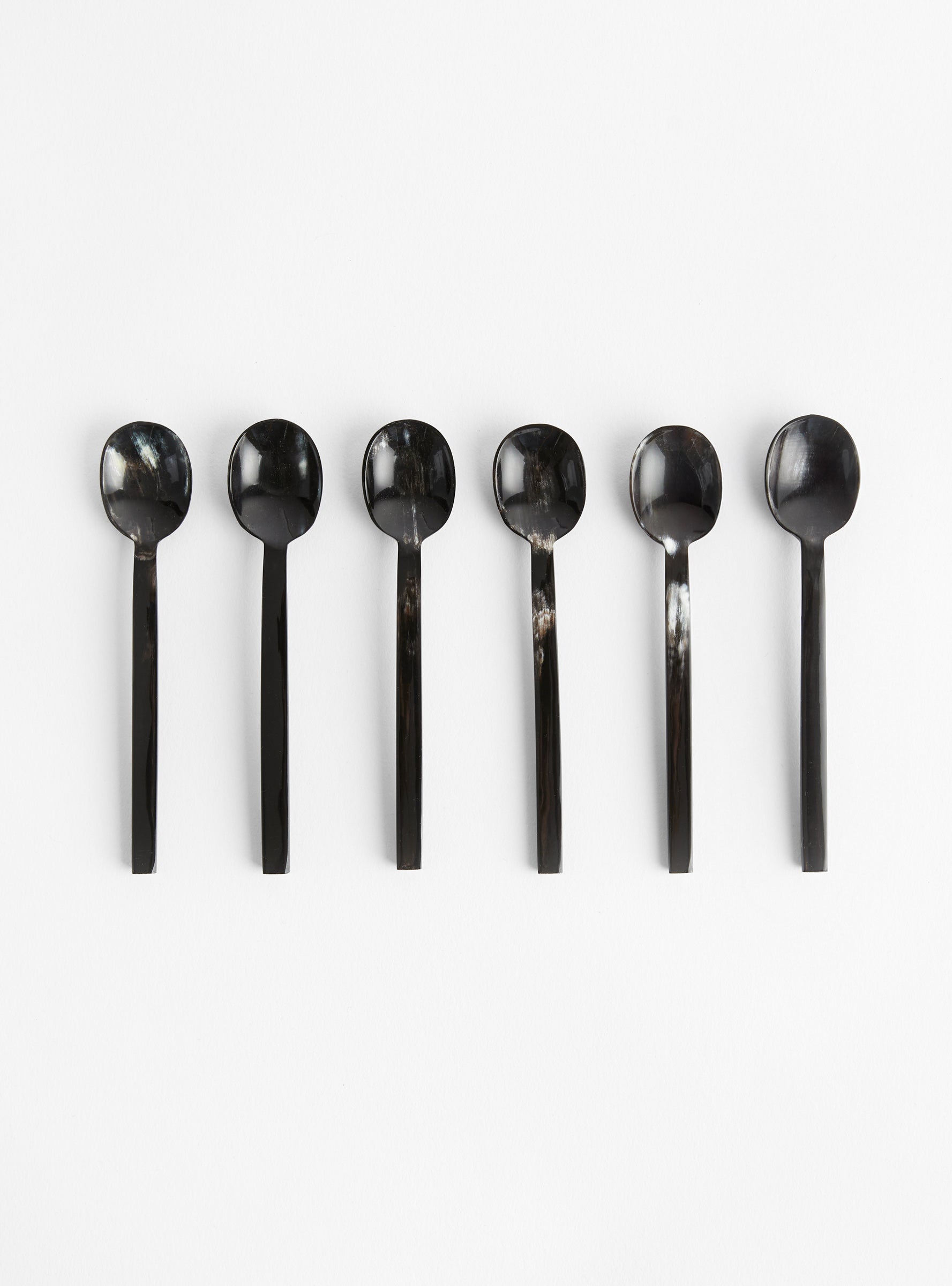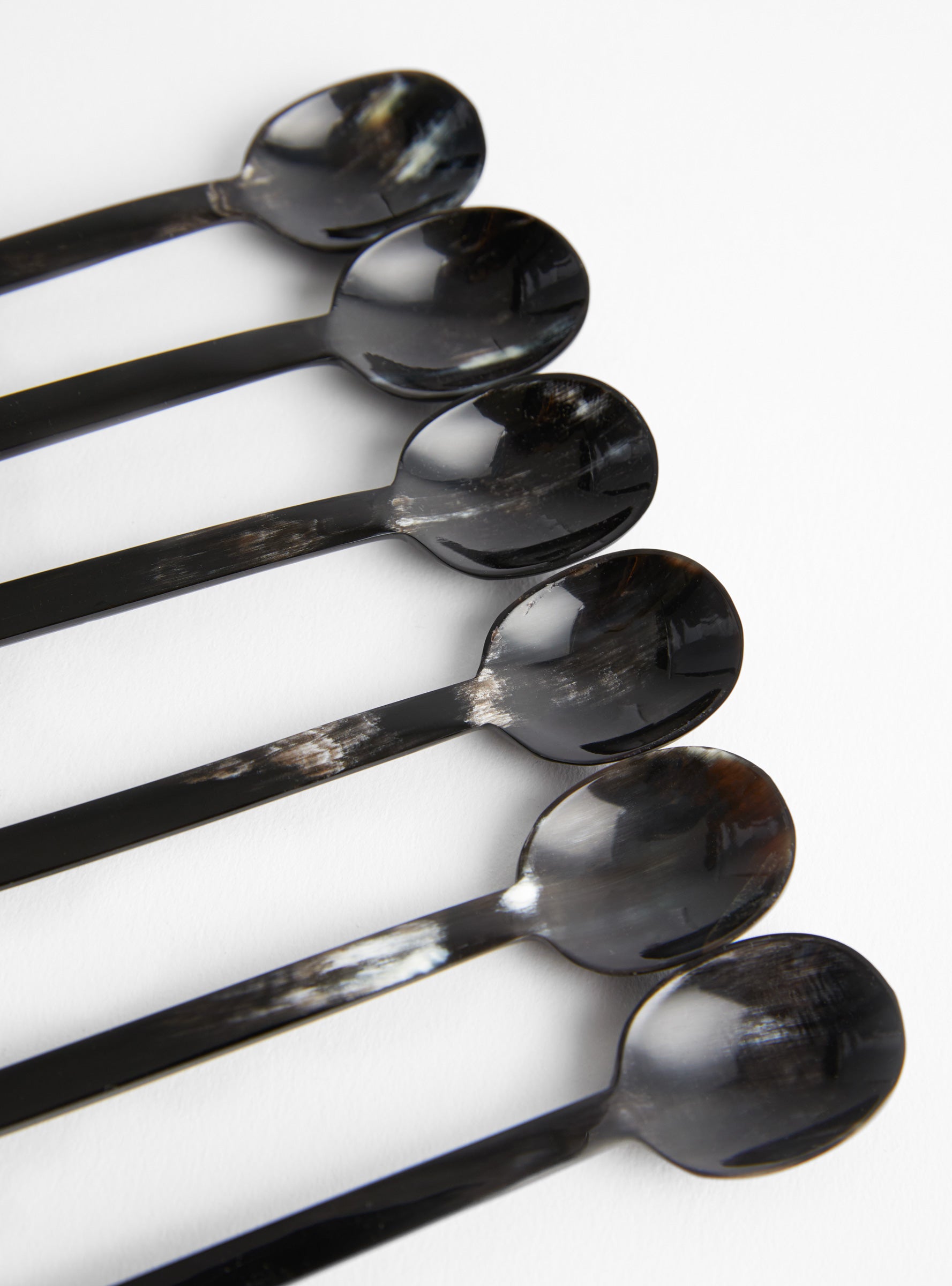 Made from marbled black horn, the set of six Baguette Dessert Spoons from L’indochineur feature a sleek design and distinctive marbling, making them an elegant and lasting addition to any table setting.