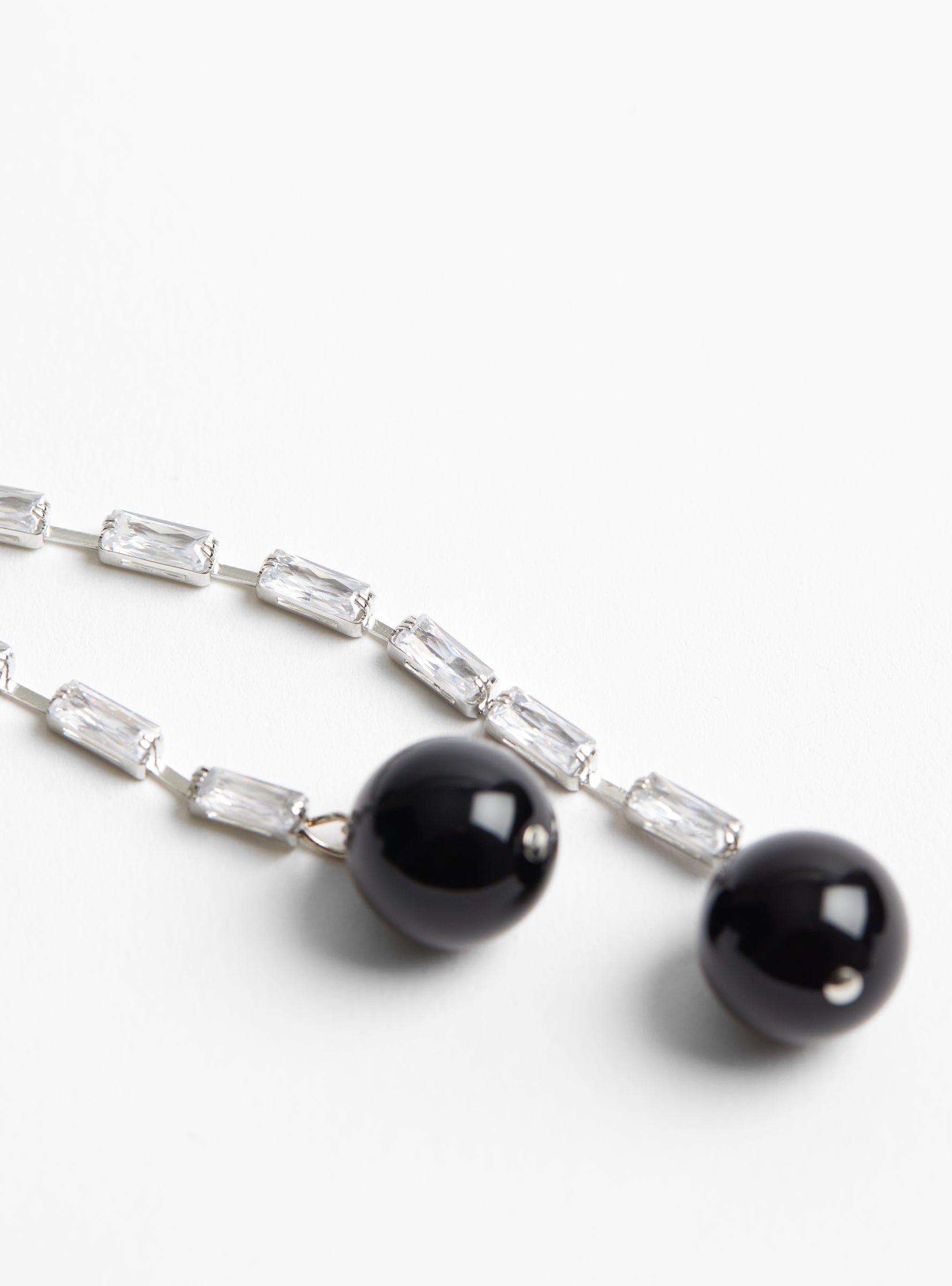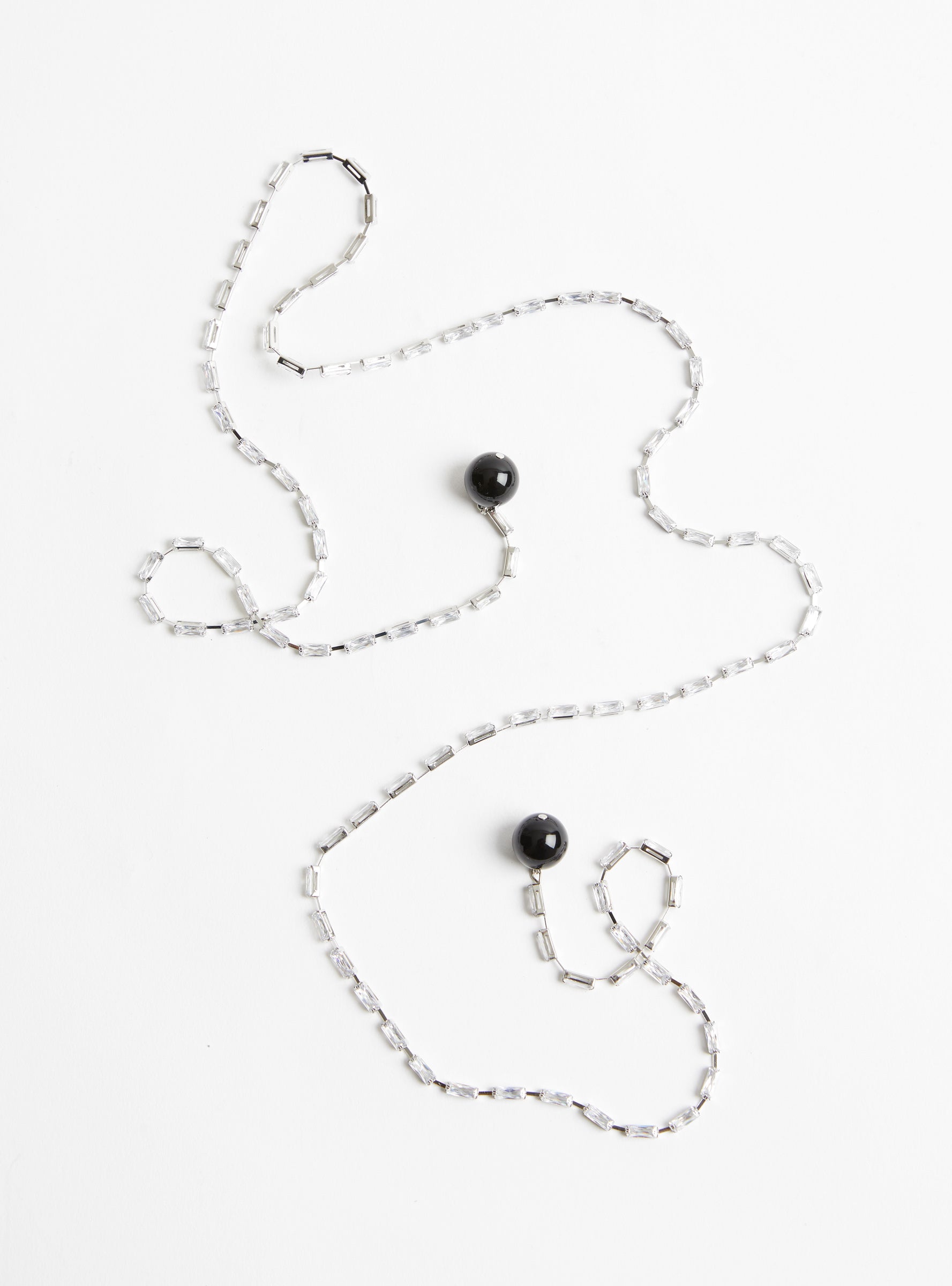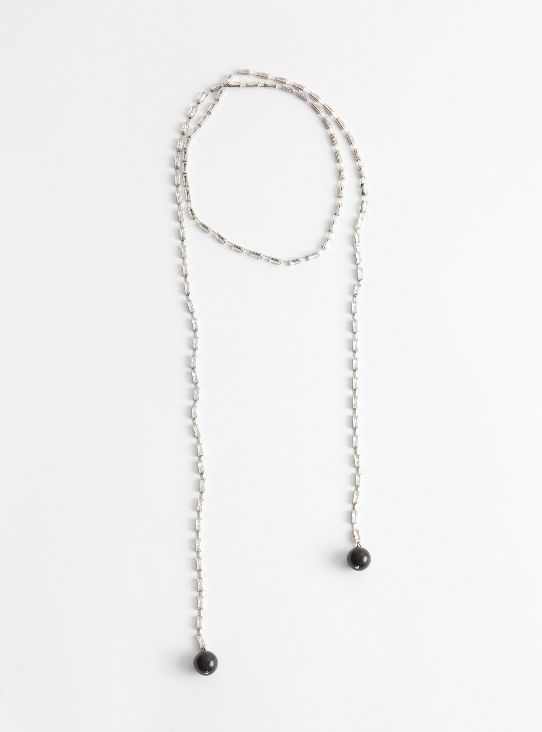 The Baguette Lariat Necklace in Black from Rachel Comey is a lightweight, versatile design featuring faceted rhinestone links and acrylic bead tips. It can be draped or wrapped as desired, offering multiple styling options.
