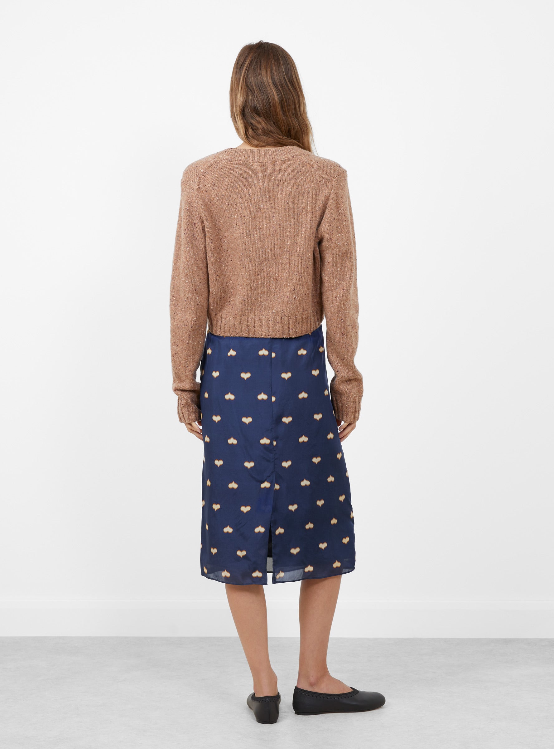 The Baldera Silk Skirt in Navy from Rachel Comey is a high-waisted pencil skirt, cut from pure silk with a playful printed heart design. This midi-length style is finished with a contrast stitch at the waist and a back vent for ease of movement.