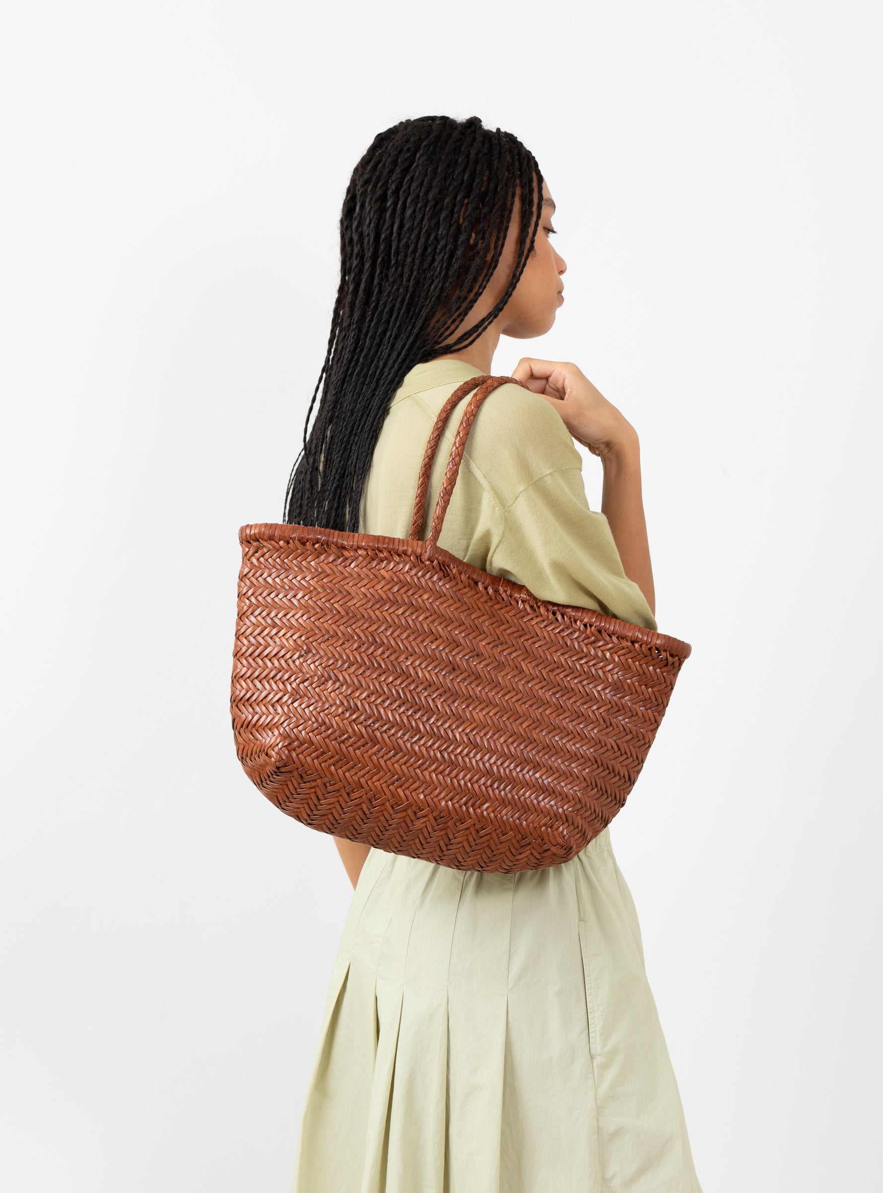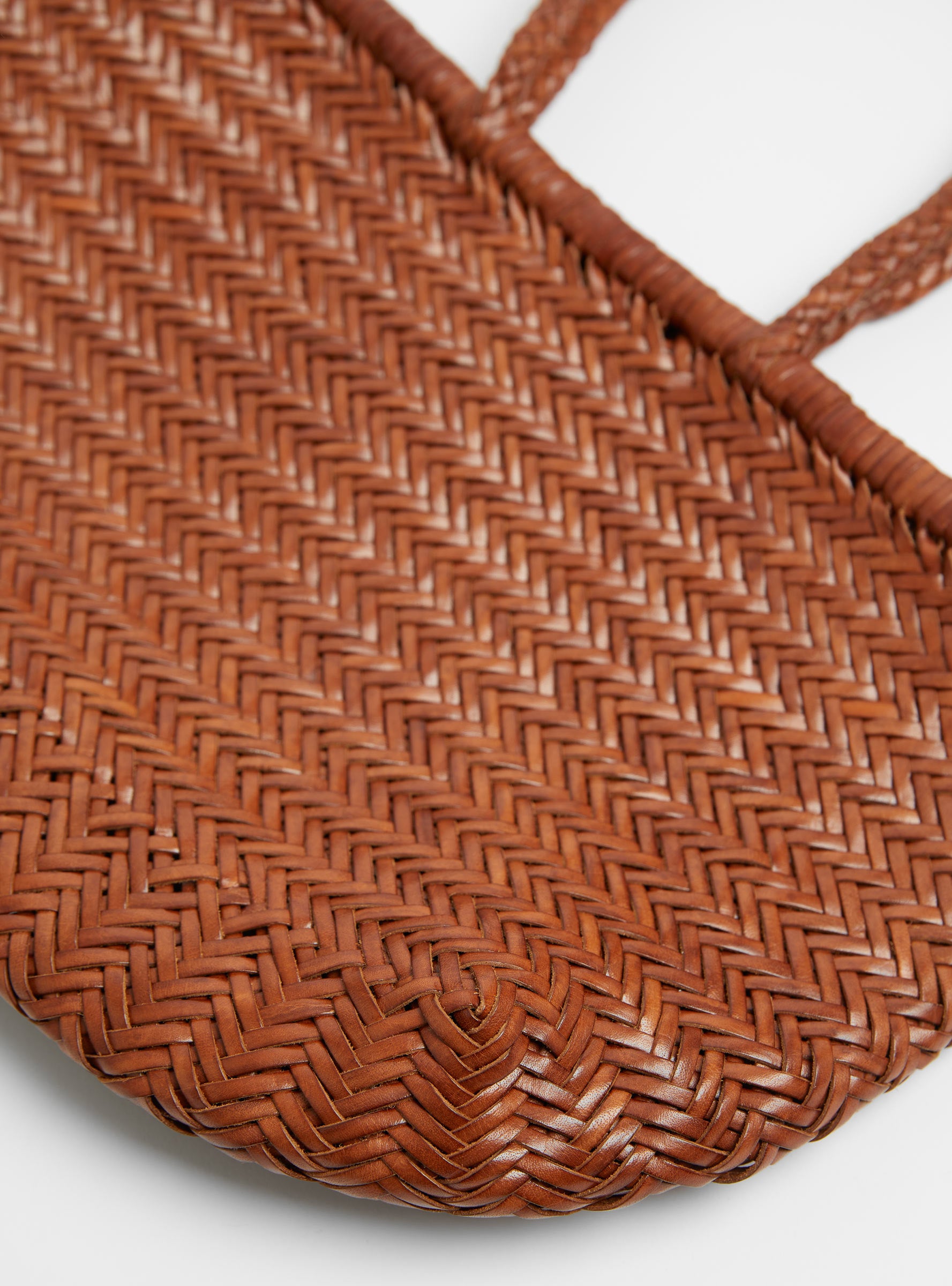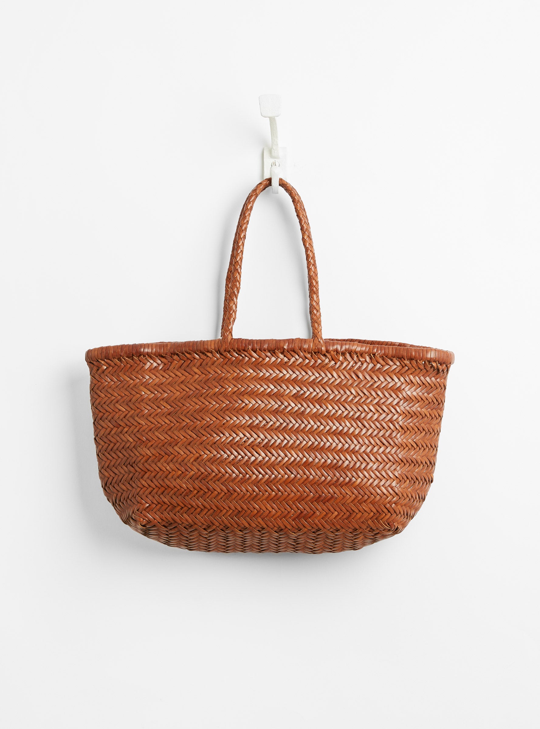 Handcrafted by artisan weavers from soft leather using natural vegetable dyes, the Bamboo Triple Jump Bag features a diagonal chevron weave. With braided handles and an open top, this spacious, unlined tote is built to last. The leather ages beautifully, while the signature St. Christopher charm adds a nostalgic touch.