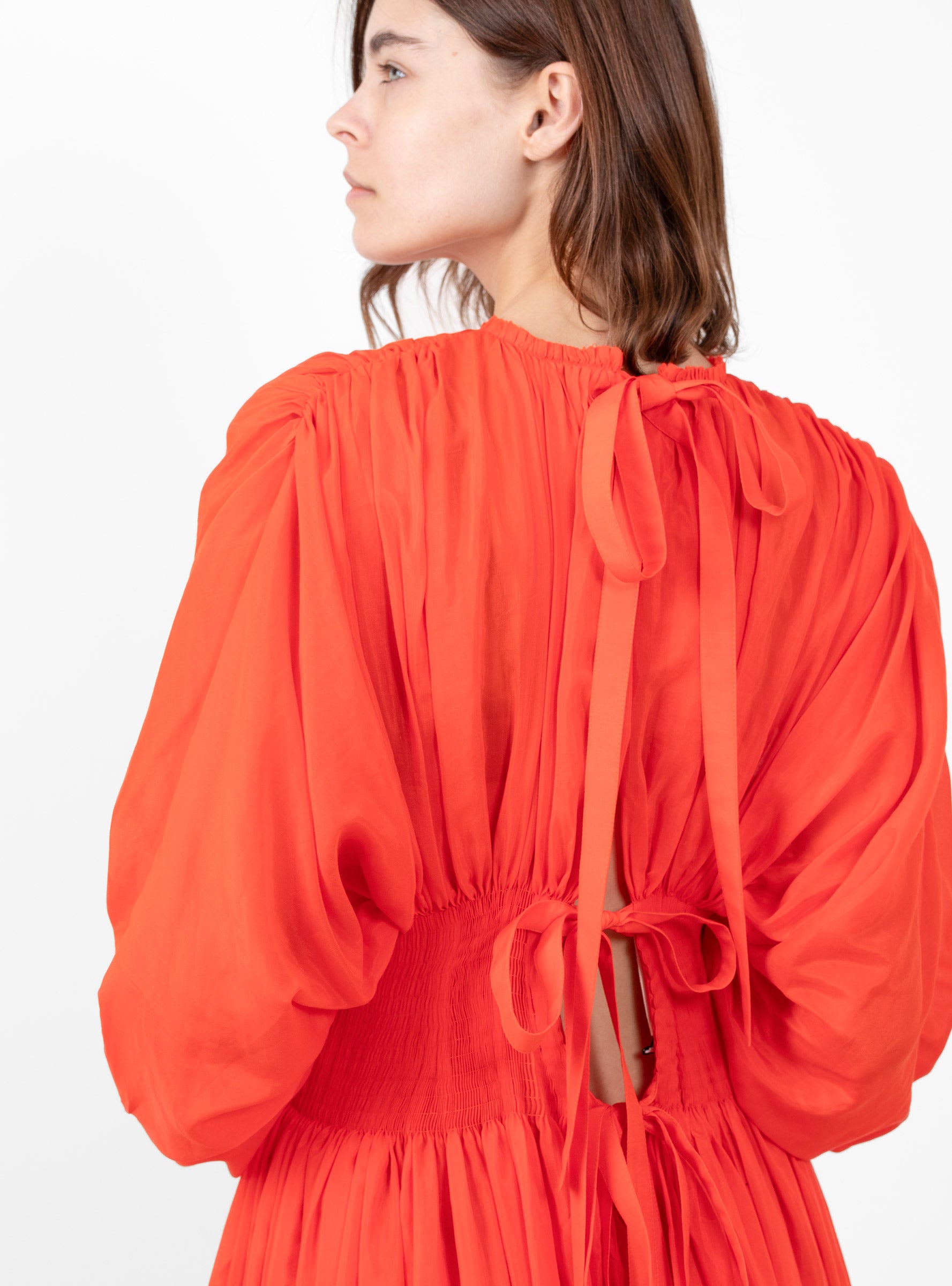The Bandoneon Dress from Renata Brenha comes in Blood Orange and is crafted in London. This signature dress features a hand-smocked waist that shapes the silhouette while allowing ease of movement. Voluminous sleeves add a sculptural element, and back strap detailing provides subtle structural interest. The cotton-silk blend fabric drapes softly, enhancing the relaxed yet considered shape.