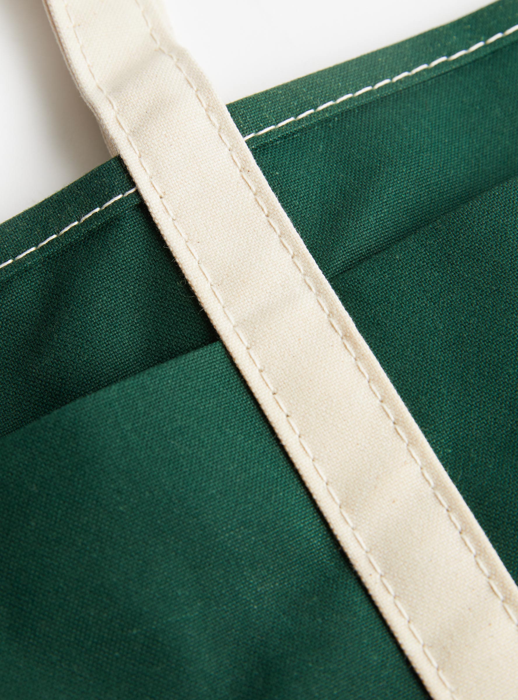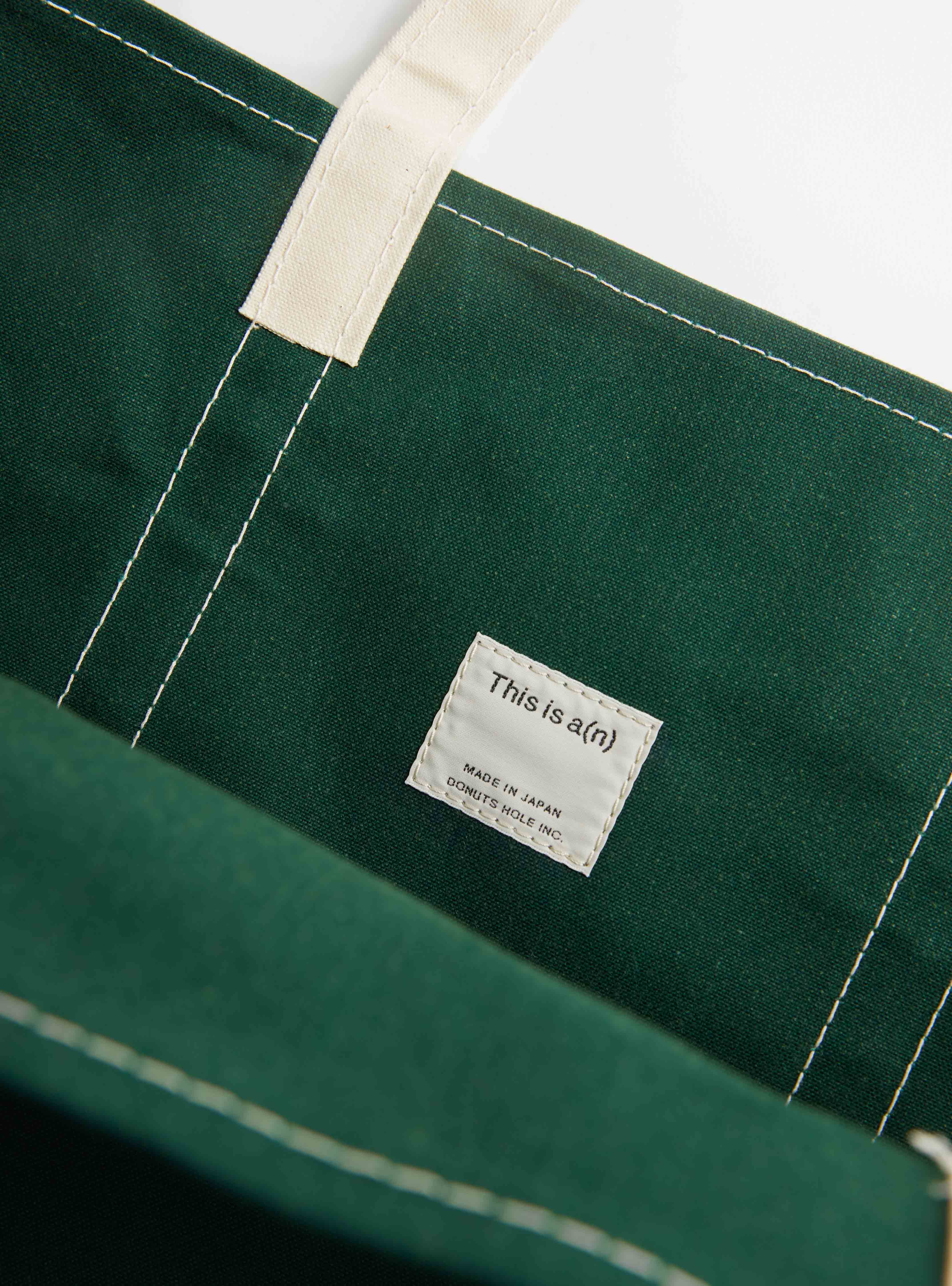 The Base Field Tote (L) from This is a(n) arrives in Forest Green and White. Made from 100% US Army Duck cotton canvas in Japan, this oversized tote features a double-bottom construction that allows it to stand independently. The handle is set to a length suitable for carrying over the shoulder or by hand, and three front pockets provide easy access to essentials, with a total of four internal and external pockets for organised storage.