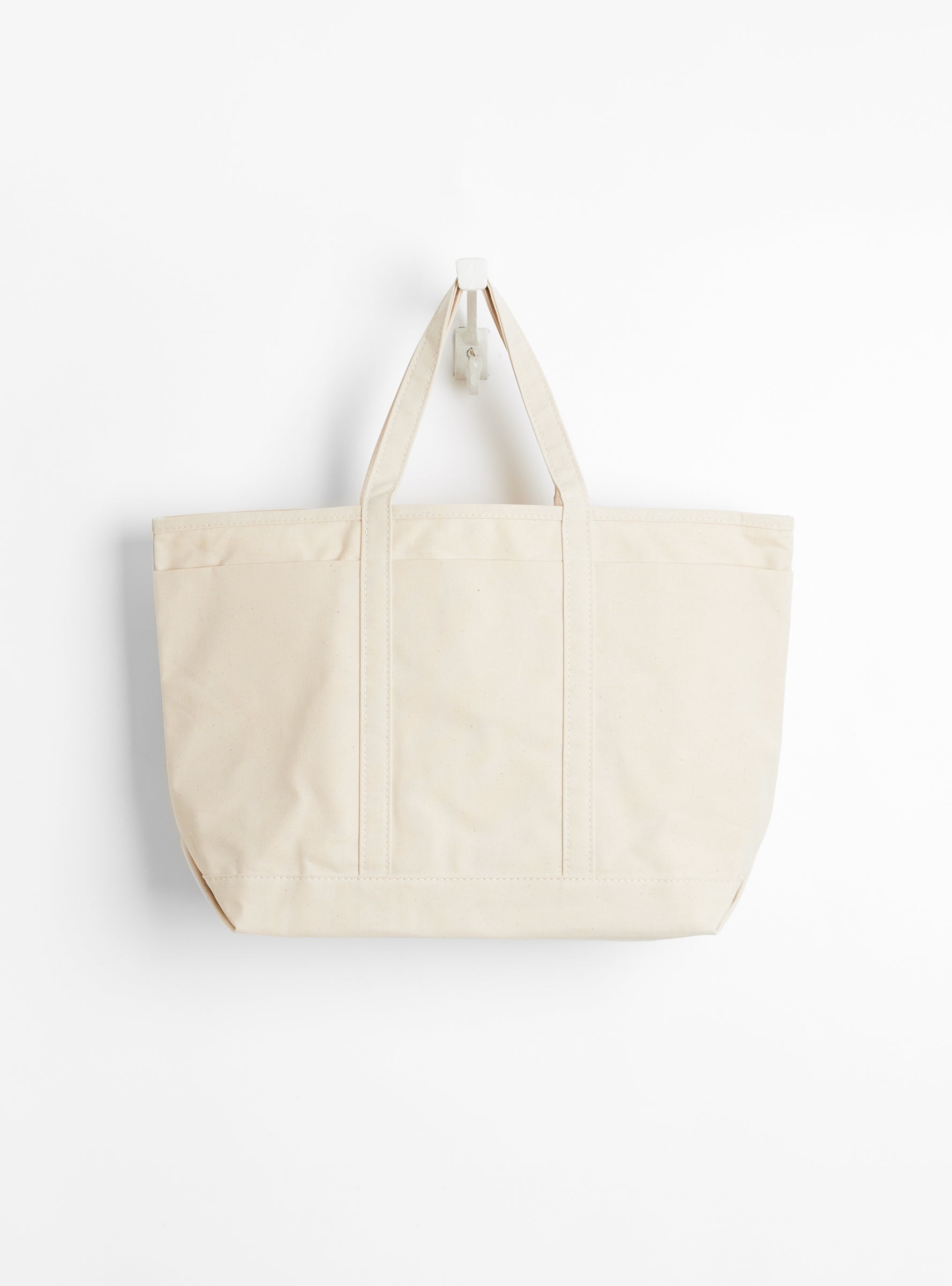 The Base Field Tote (L) from This is a(n) arrives in White. Made from 100% US Army Duck cotton canvas in Japan, this oversized tote features a double-bottom construction that allows it to stand independently. The handle is set to a length suitable for carrying over the shoulder or by hand, and three front pockets provide easy access to essentials, with a total of four internal and external pockets for organised storage.
