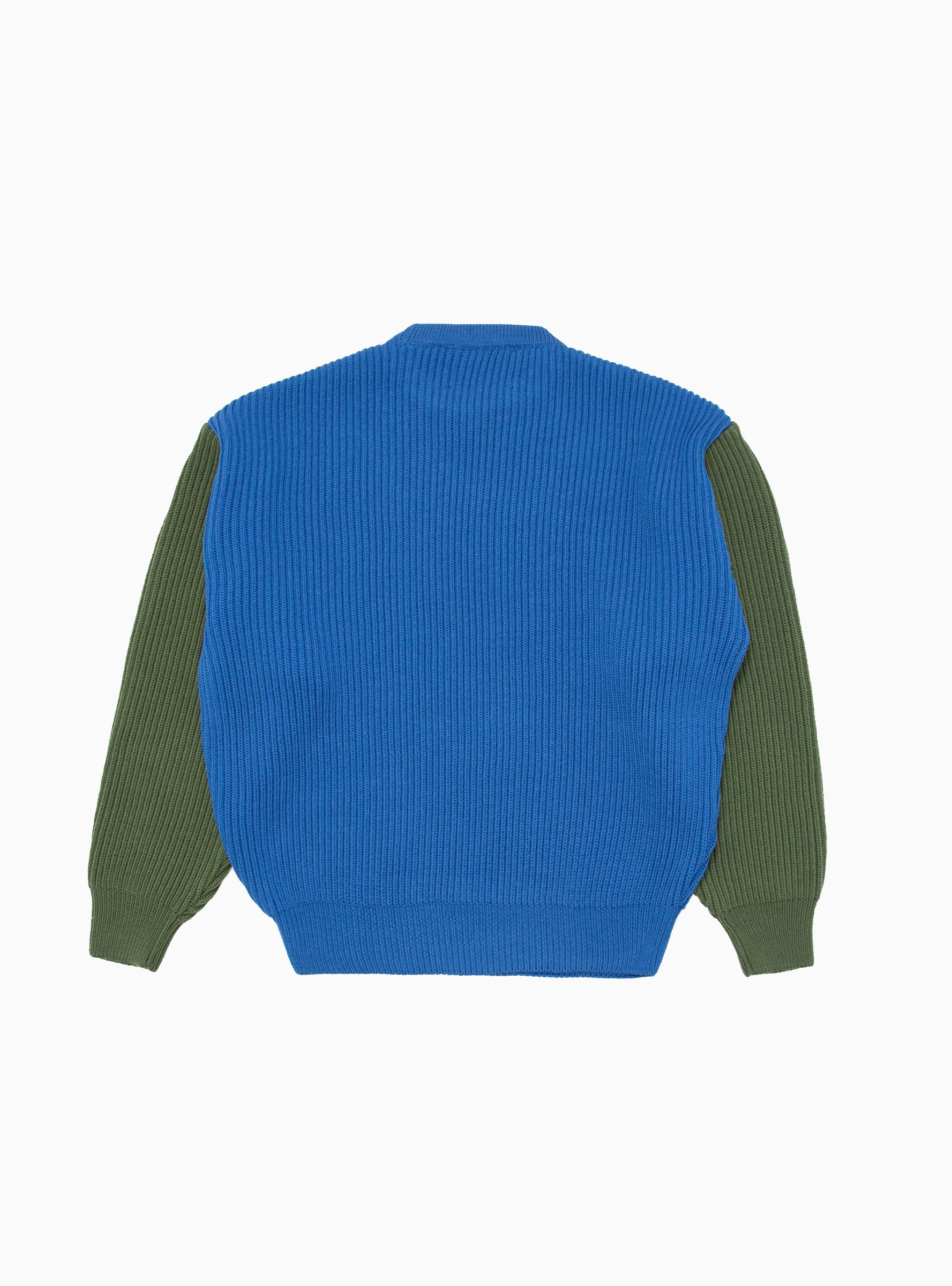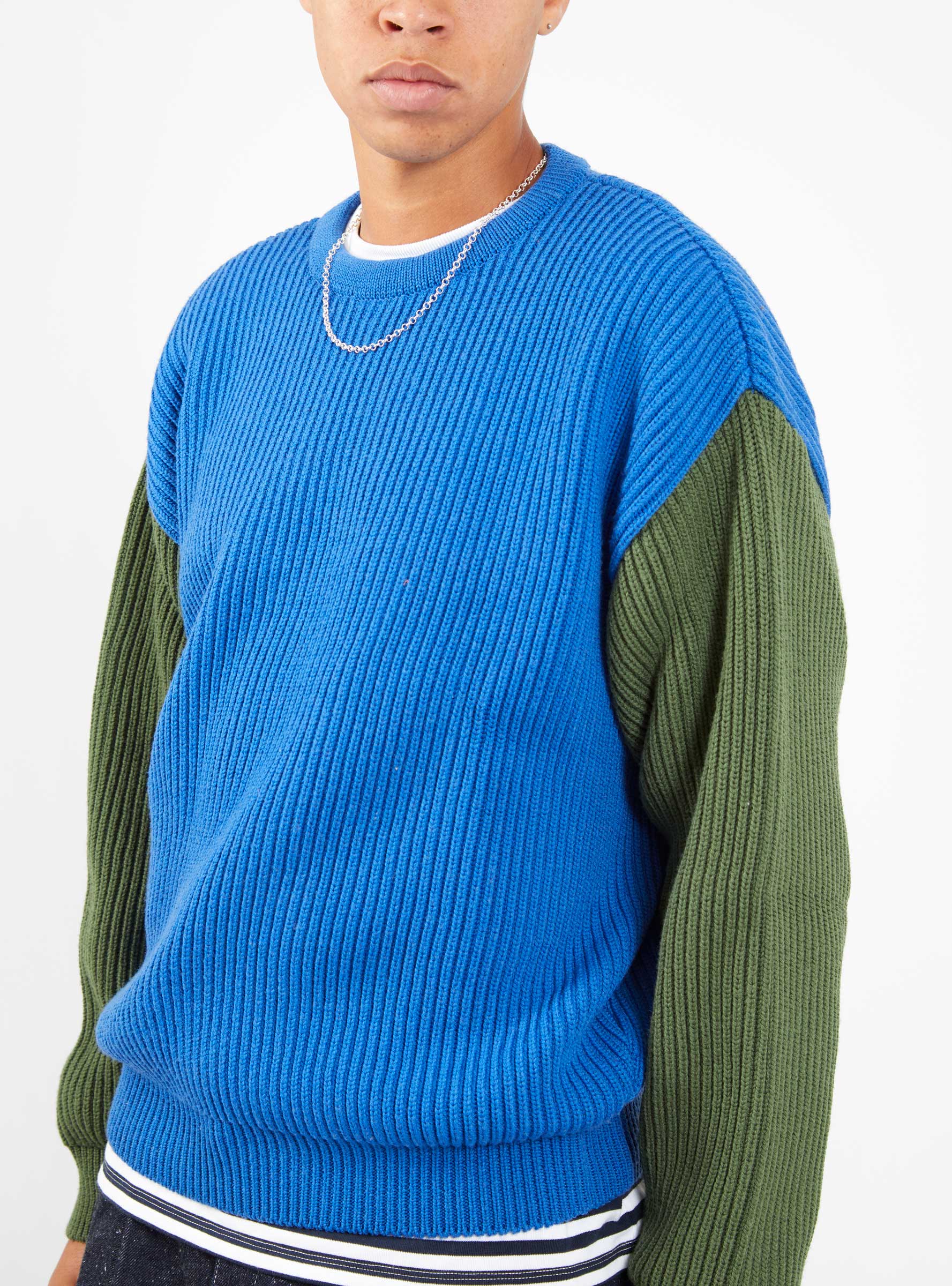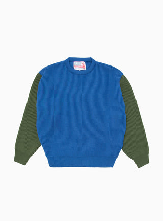 The Beacon Crew Sweater in Royal Blue & Olive Green is a chunky knit style from The English Difference taking inspiration from vintage military knitwear with a colourful, contemporary update. This piece has been knitted in the UK from premium Italian merino wool, known for its breathable and insulating qualities in a boxy fit with dropped shoulders and contrasting coloured sleeves.