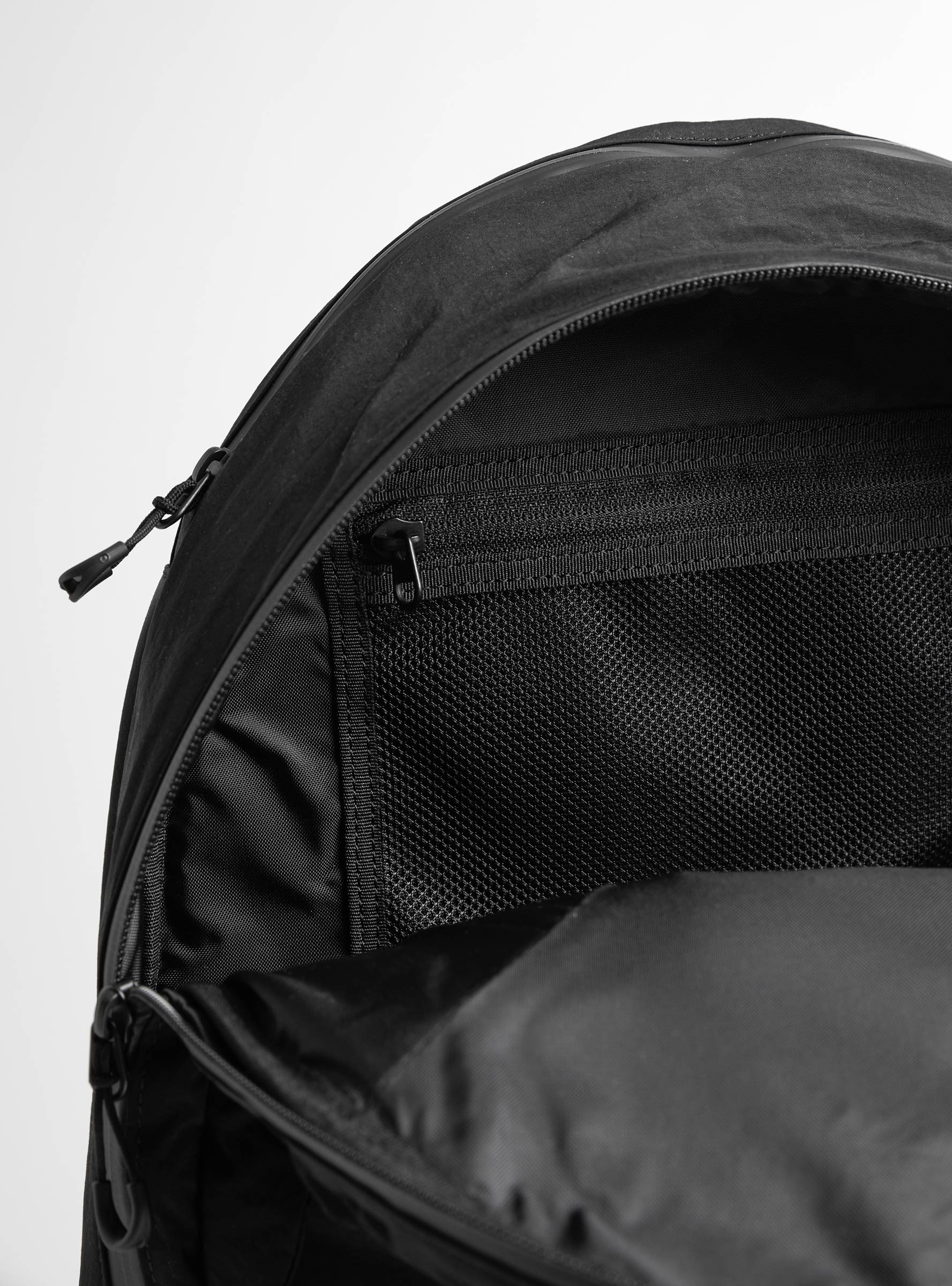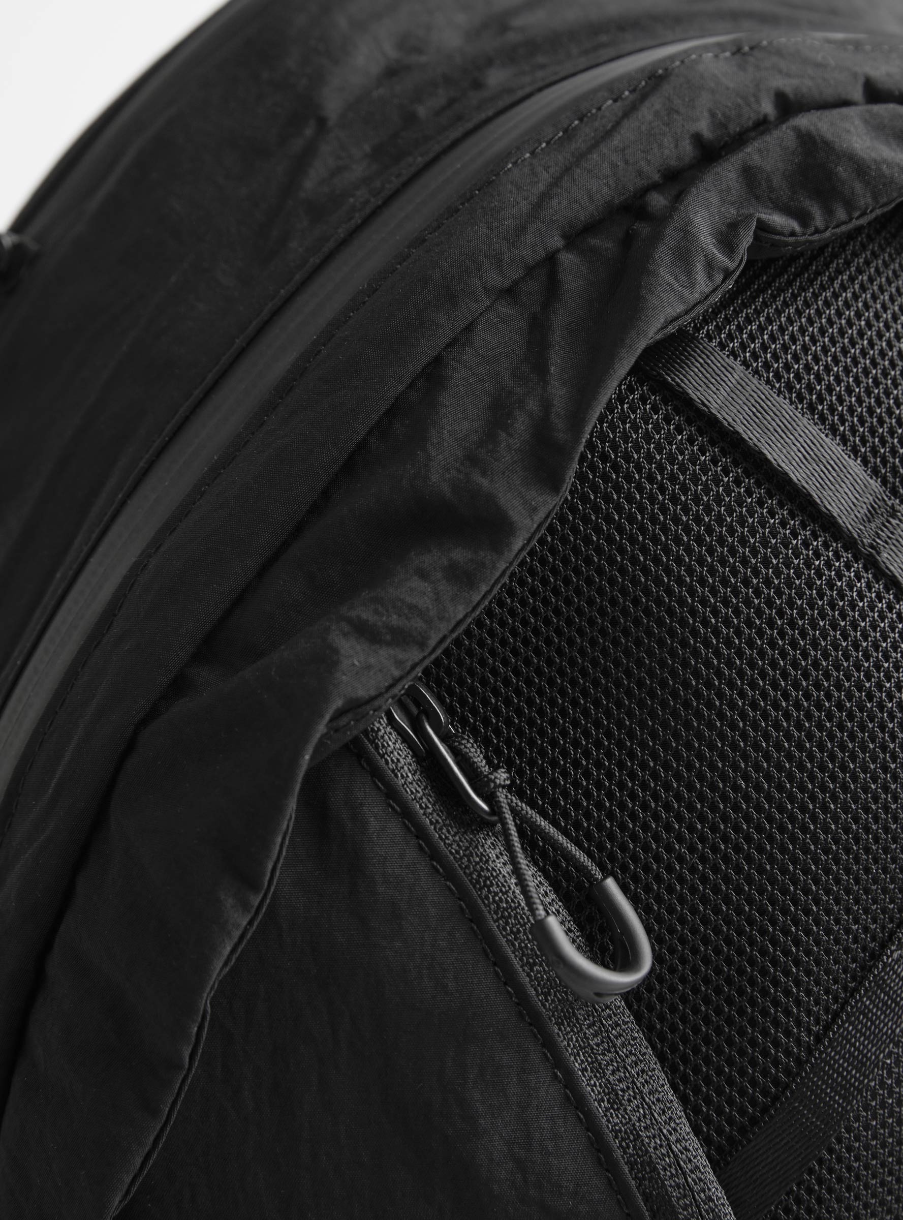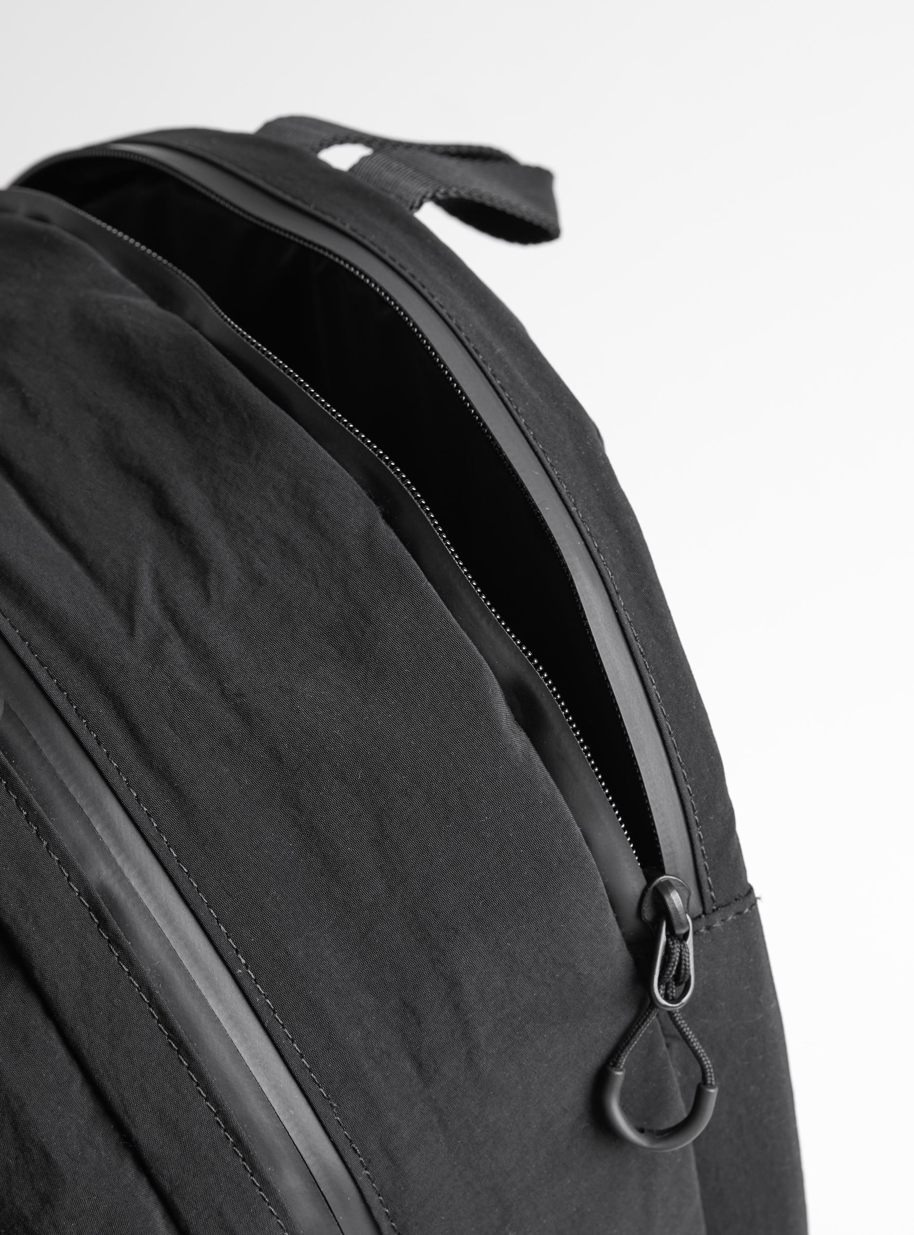 The Beetle Backpack by Found Pocket arrives in classic black with a symmetrical design and four zippered front pockets for easy access. An X-shaped webbing loop between the pockets allows for convenient attachment of small accessories, while a front string tunnel helps maintain the bag’s shape when fully packed. Inside, it features a spacious main compartment and a dedicated laptop sleeve that fits devices up to 17 inches, secured with waterproof zippers for added protection. Reinforced panels at the front and back of the laptop pocket offer extra durability. Finished with softly curved shoulder straps and a chest strap for added support, the Beetle Backpack is built for comfort and everyday function.