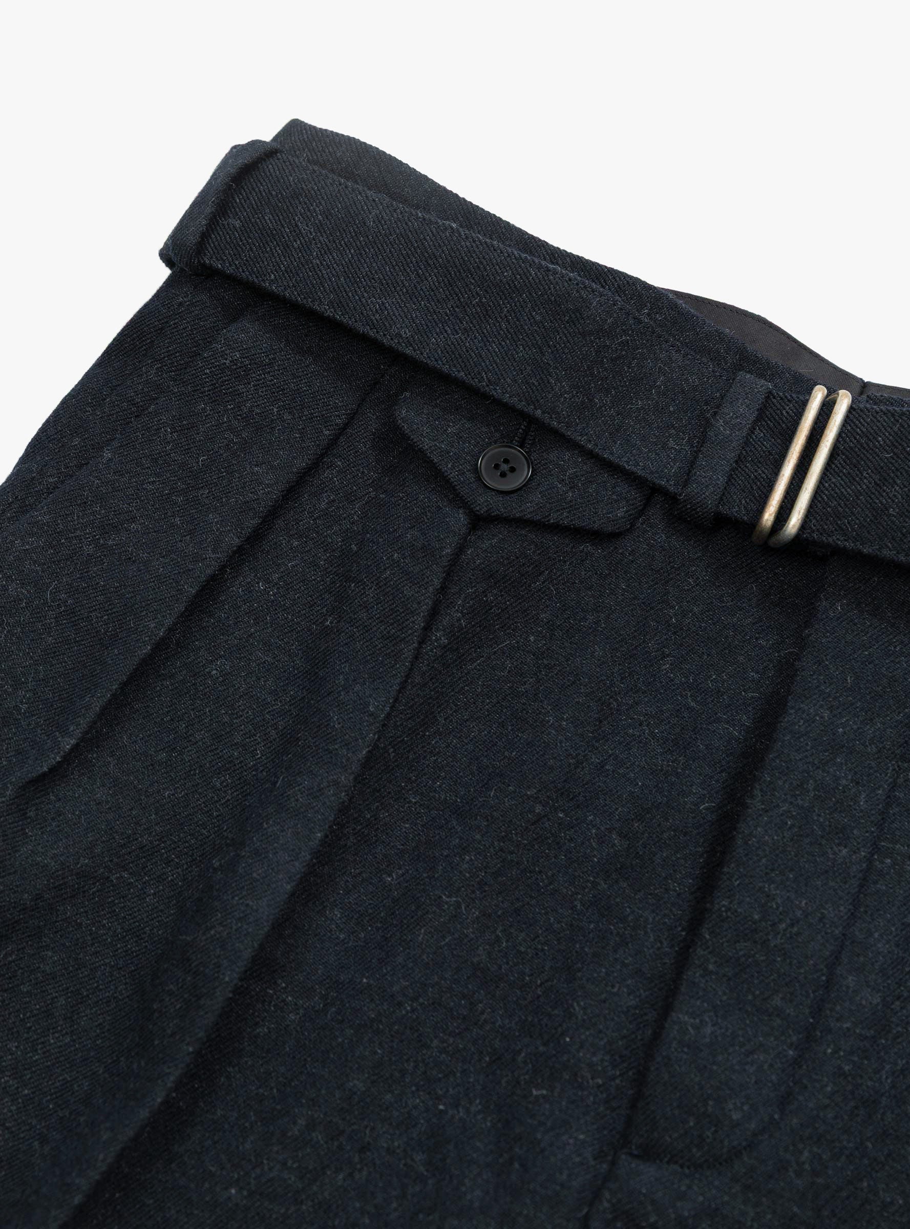 The Belted Riviera Pants from Kaptain Sunshine come in Navy and are crafted in Japan. Made from soft wool, these trousers feature a wide straight-leg silhouette with two front pleats for a refined, relaxed look. An integrated webbing belt with buckle closure and practical side and rear pockets combine functionality with considered design, making them versatile for both casual and tailored styling.