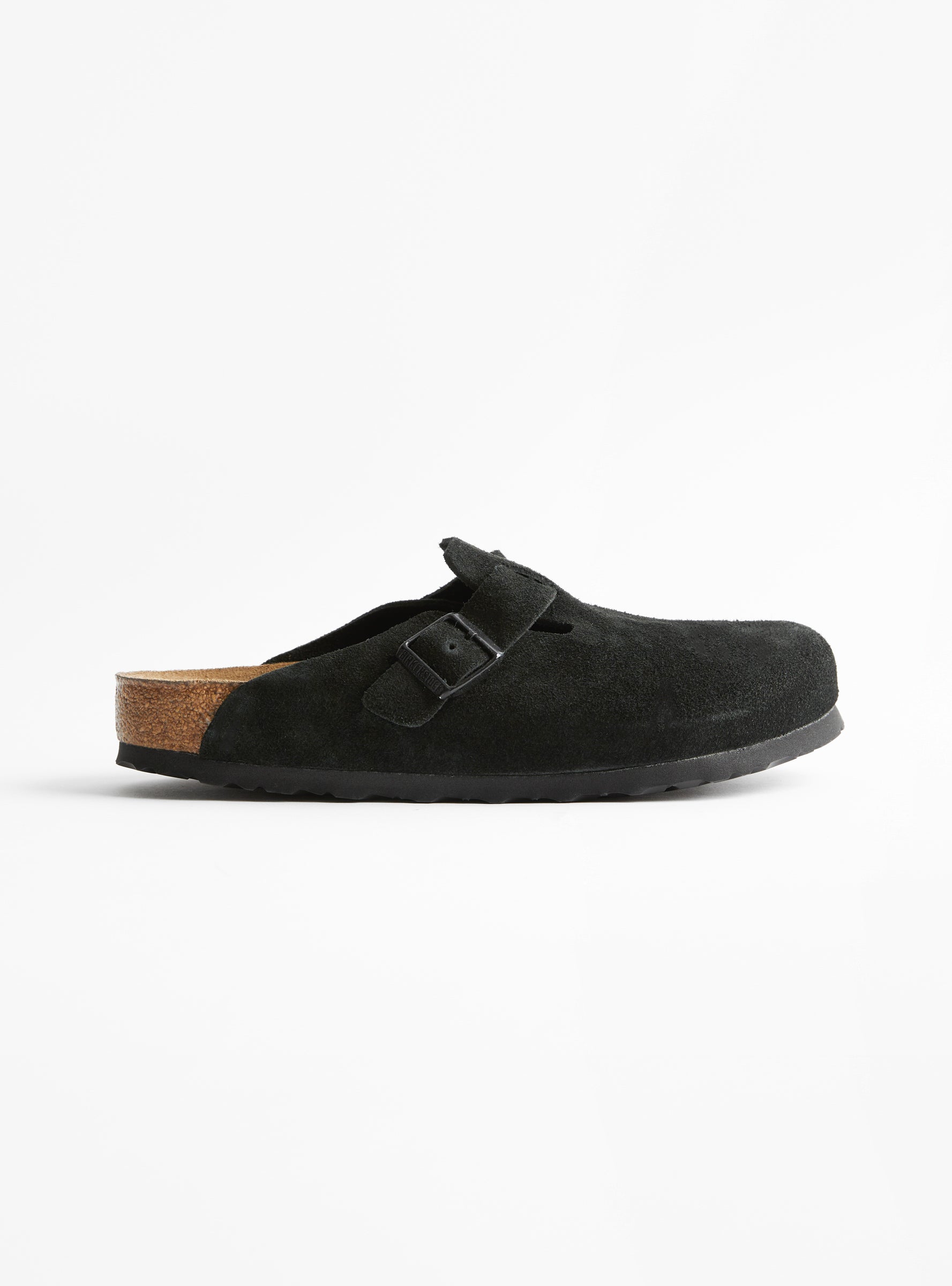The Boston Suede from Birkenstock comes in black and is crafted from a soft suede. Designed with Birkenstock’s anatomically shaped soft footbed, this classic clog features an added foam layer for increased comfort. Finished with a suede footbed lining, an EVA sole, and an adjustable strap with a metal pin buckle for a secure fit.