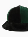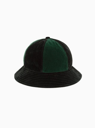 Made from short-pile velvet, this green and black bucket hat from Garbstore’s AW23 collection has a six-panel construction and taped internal seams.
