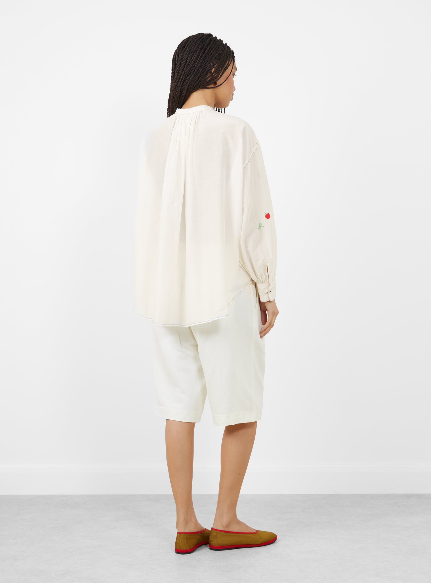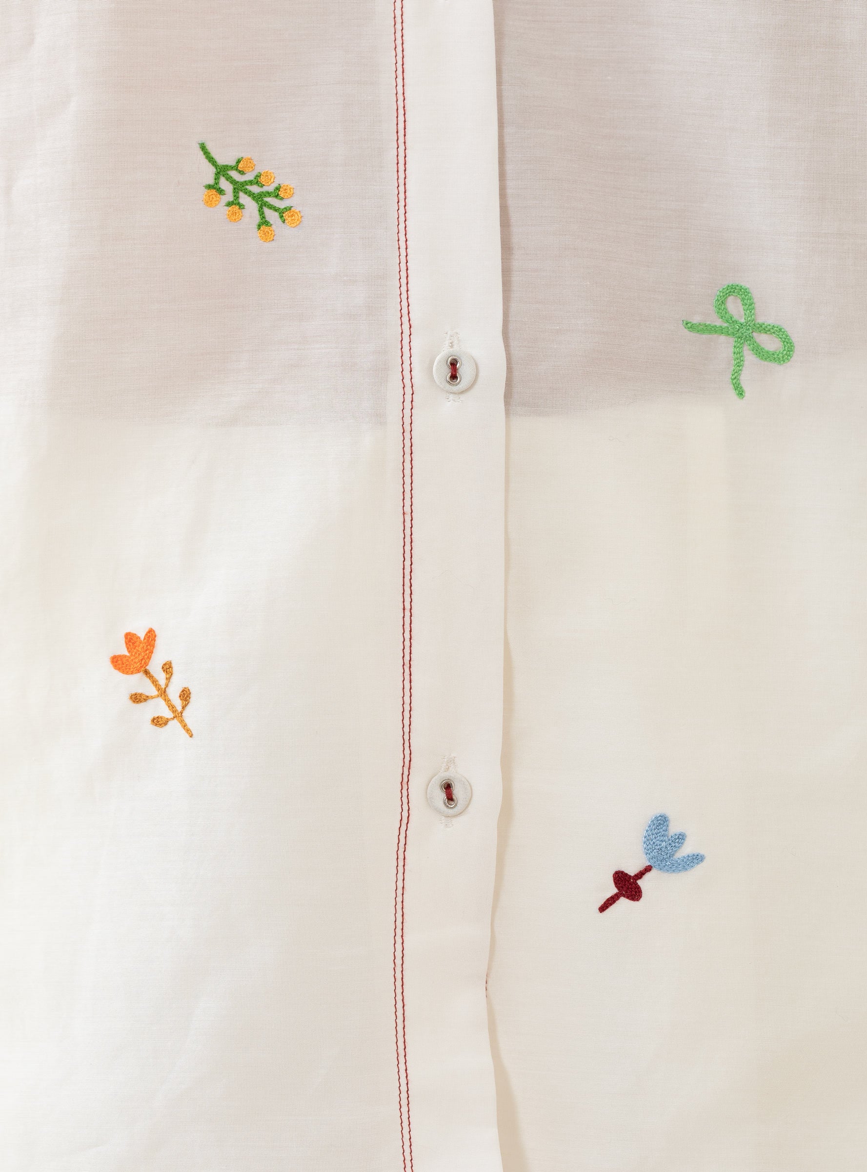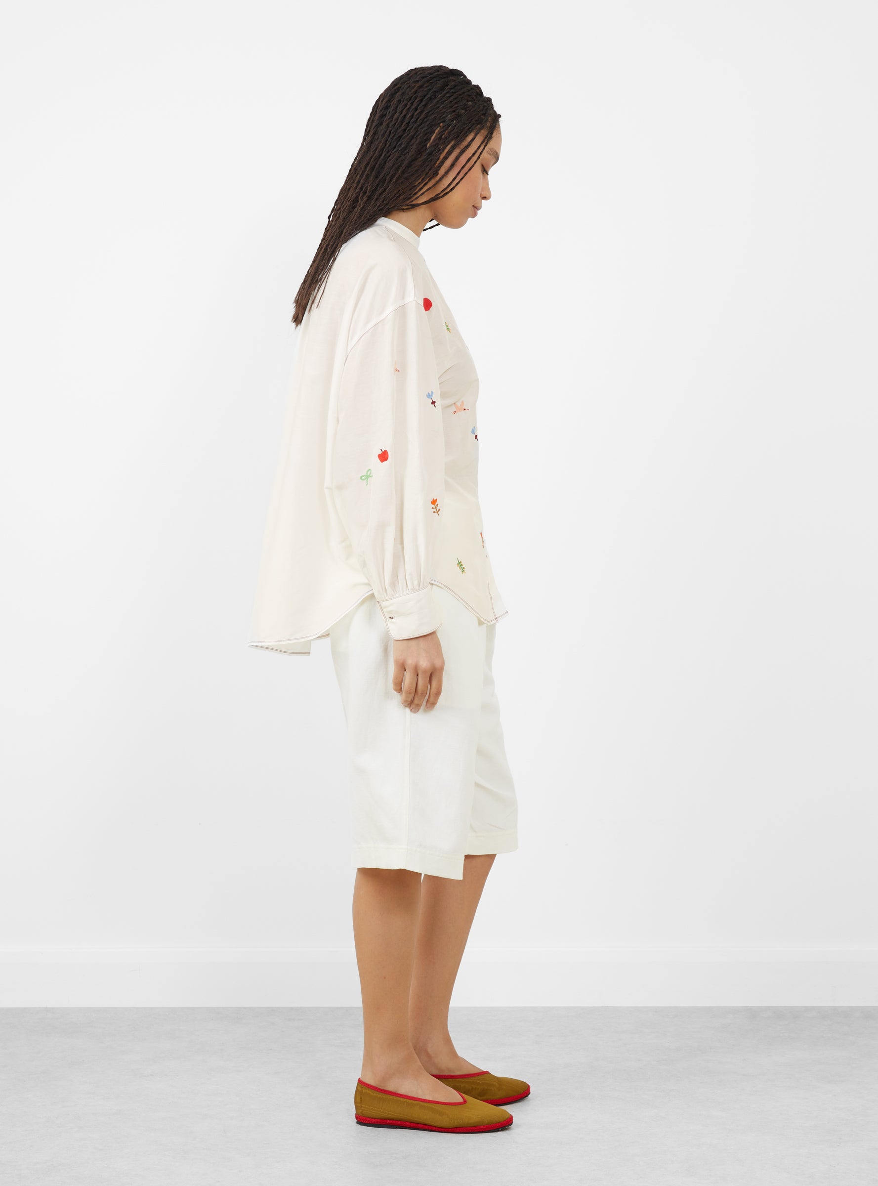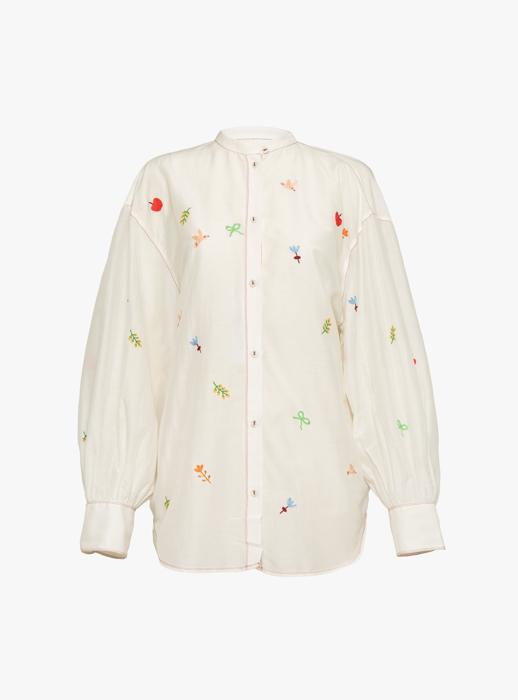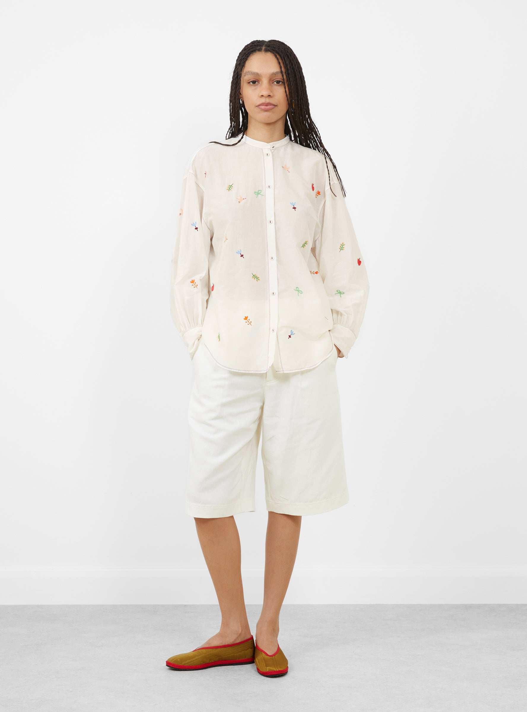 The Calm Lucky Charms Shirt comes in Chalk from Laite Works and is made in from crisp cotton. This relaxed shirt features dropped shoulders, a button-down front placket, and buttoned cuffs. Embroidered colourful motifs are scattered across the shirt, adding playful detailing to the design.