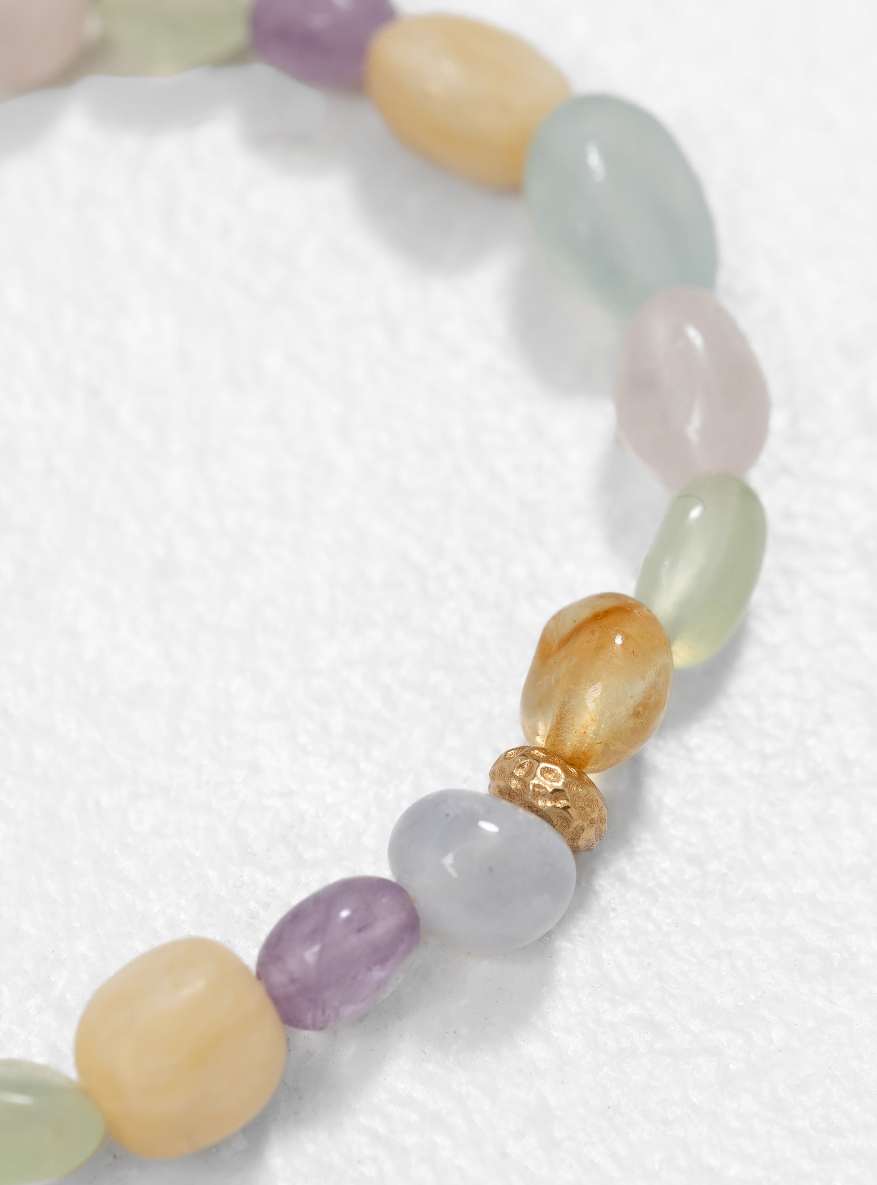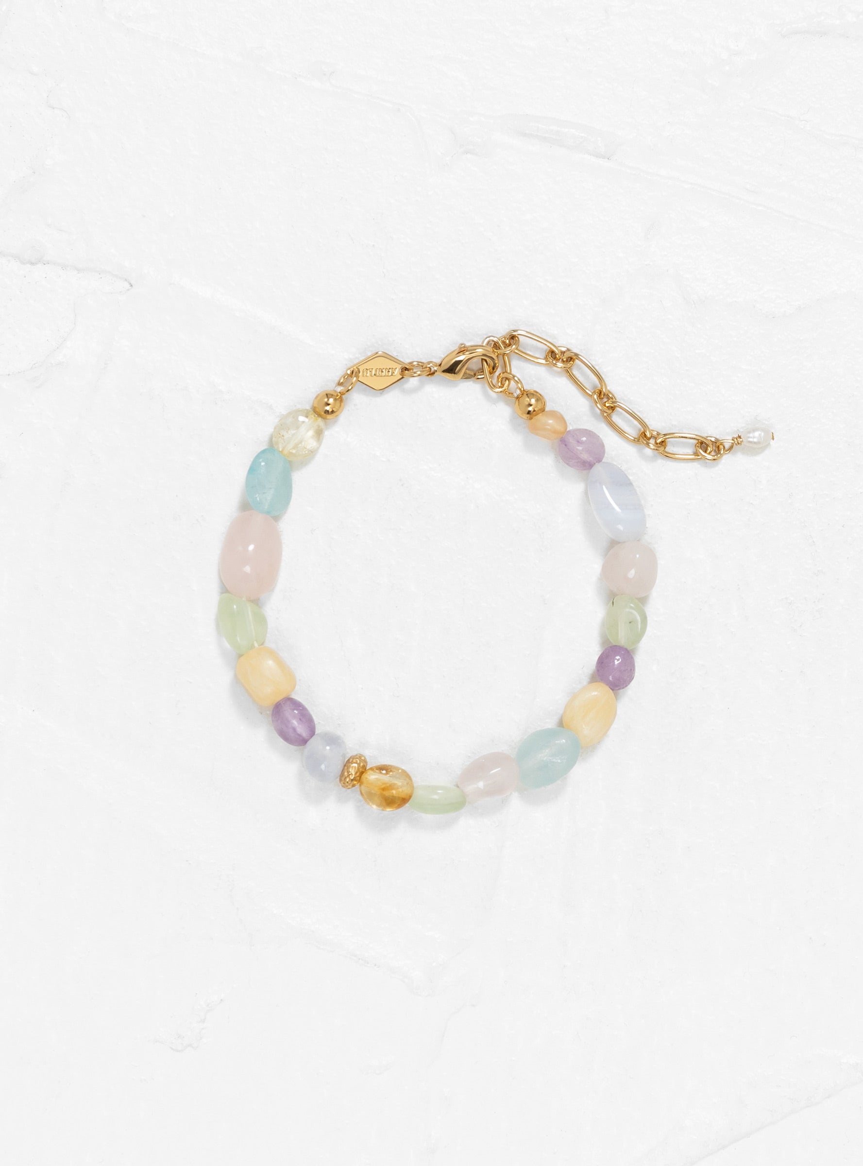 The Candy Lover Bracelet from Anni Lu is detailed with striking multi-coloured glass beads of Amethyst, Jade, Quartz and many others. Crafted in Denmark from brass with an 18-karat gold plating, the bracelet is finished with a lobster clasp and a freshwater rice pearl at the bottom.