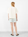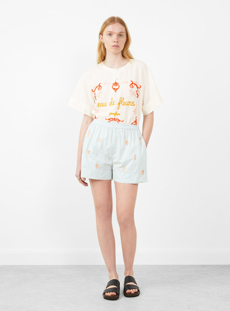 Crafted from a semi-sheer linen-cotton blend, the Canna Top in Eau De Fleurs features intricate hand embroidery, created by skilled artisans in India using traditional techniques. Featuring a band collar, short sleeves, wide hems and side slits, it reflects Laite Works’ poetic approach to craft.