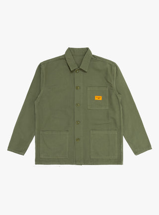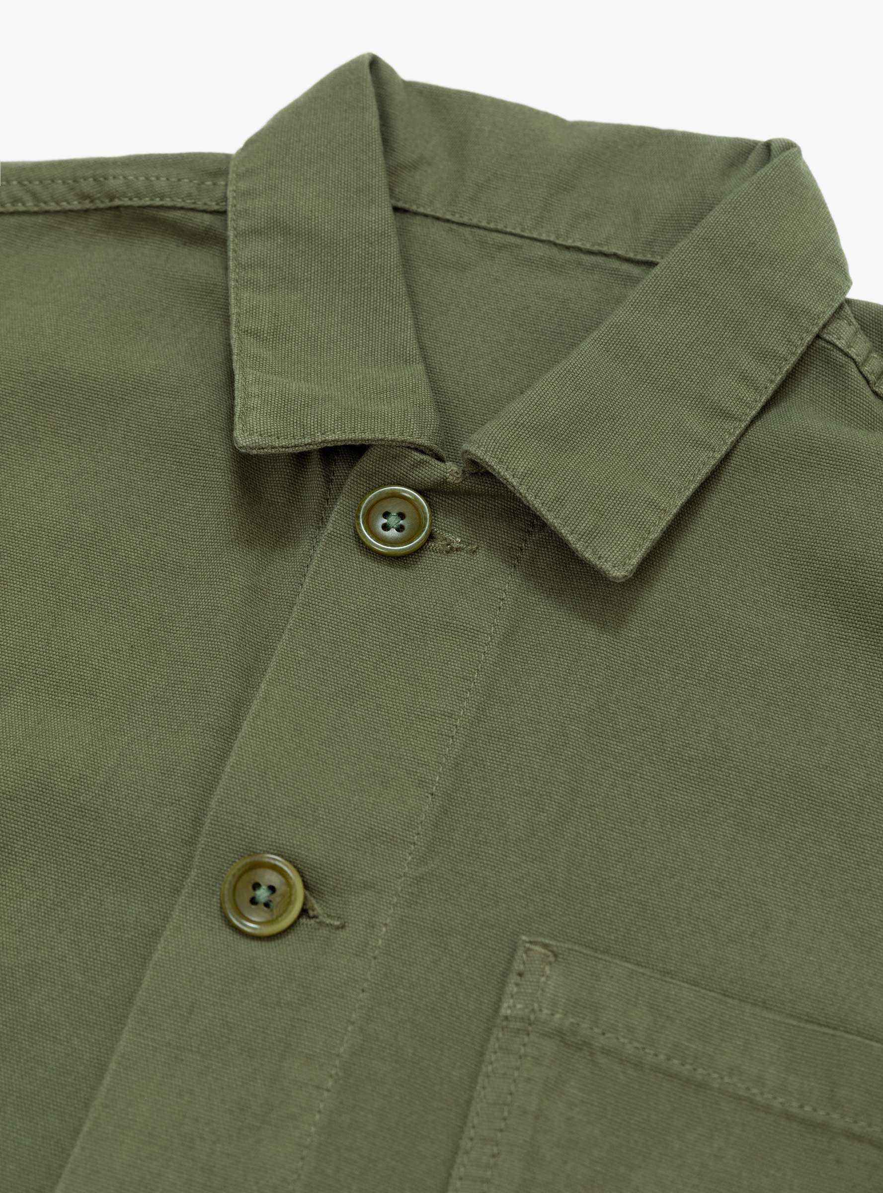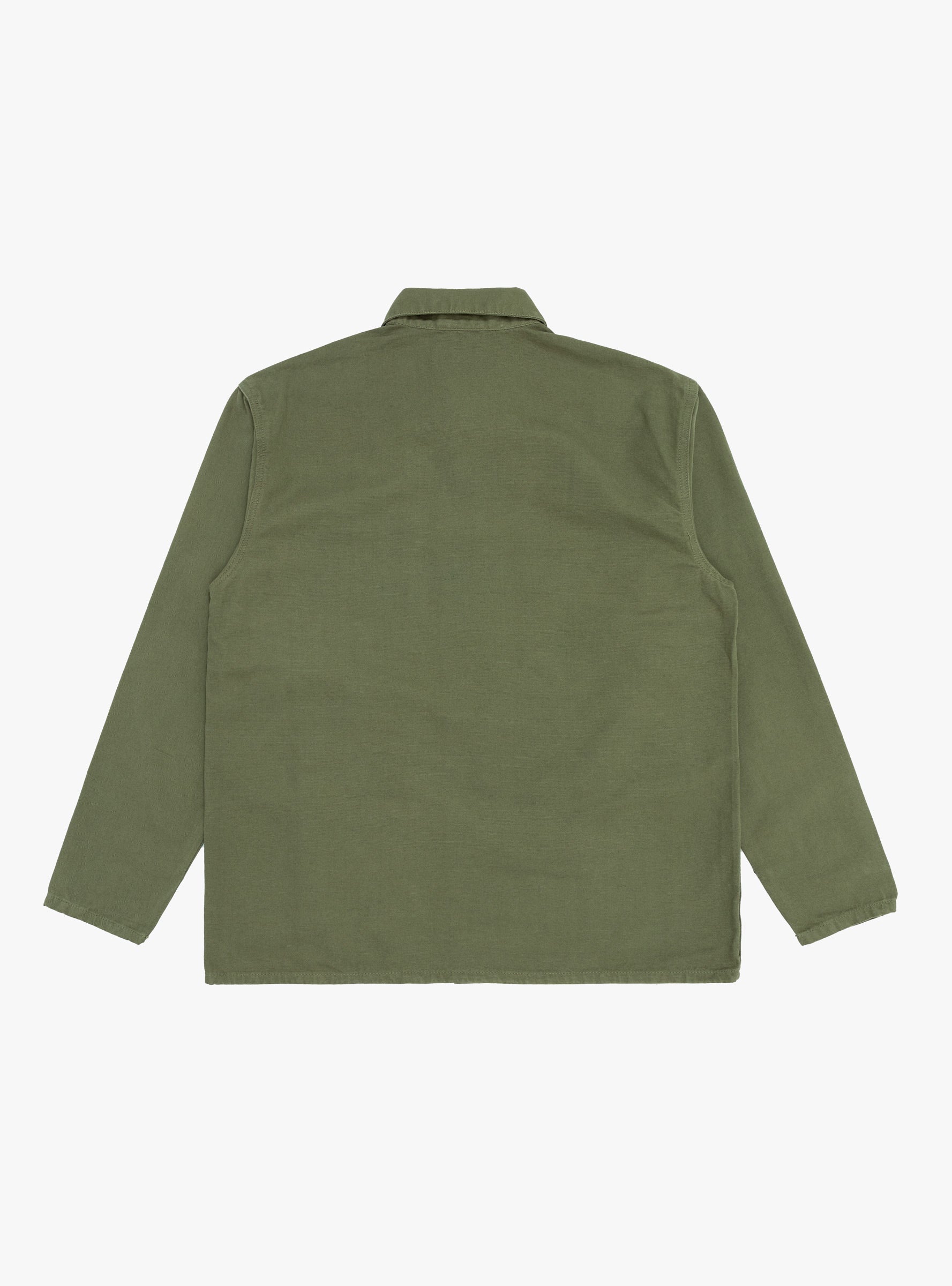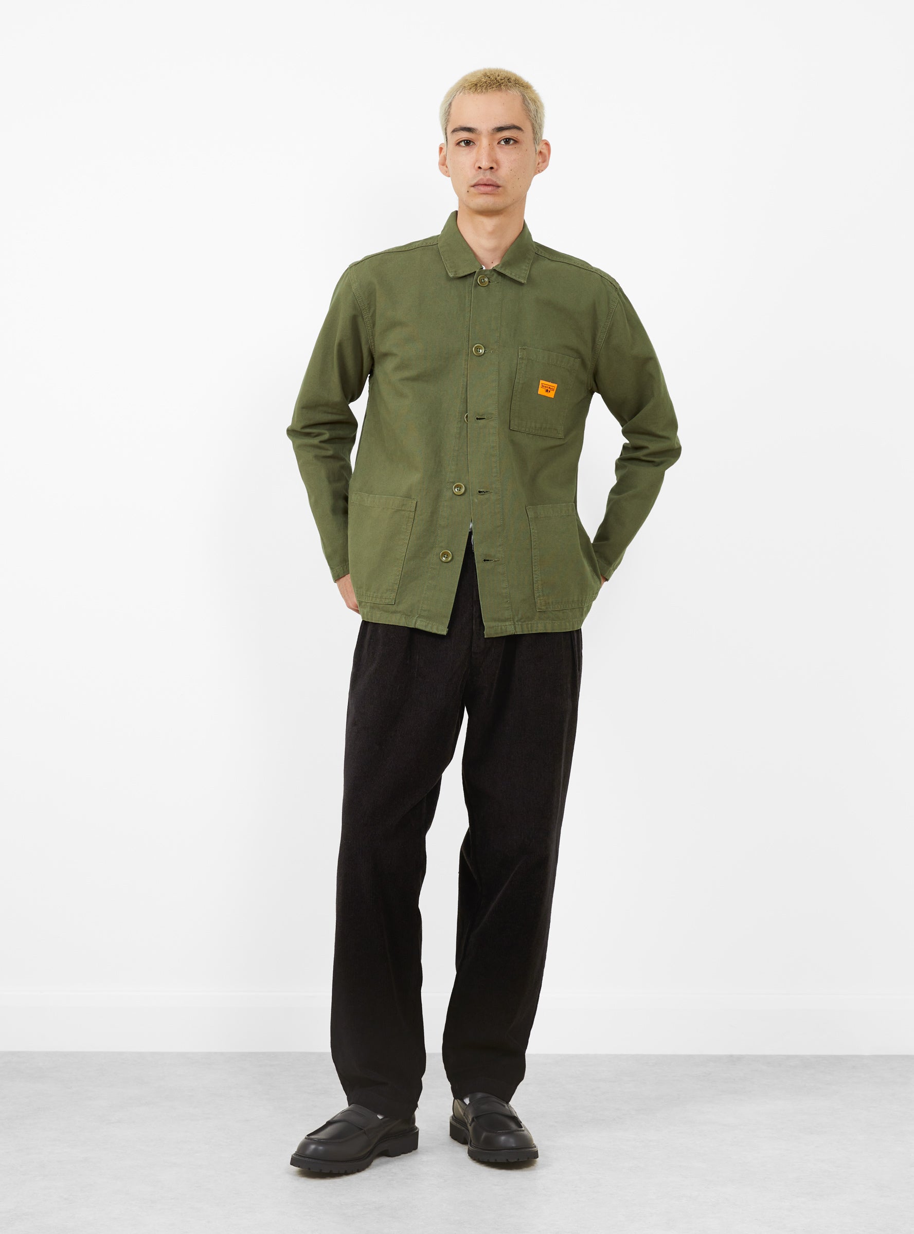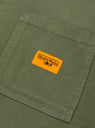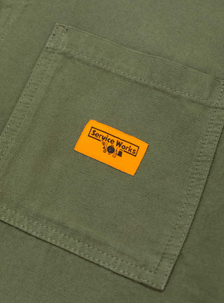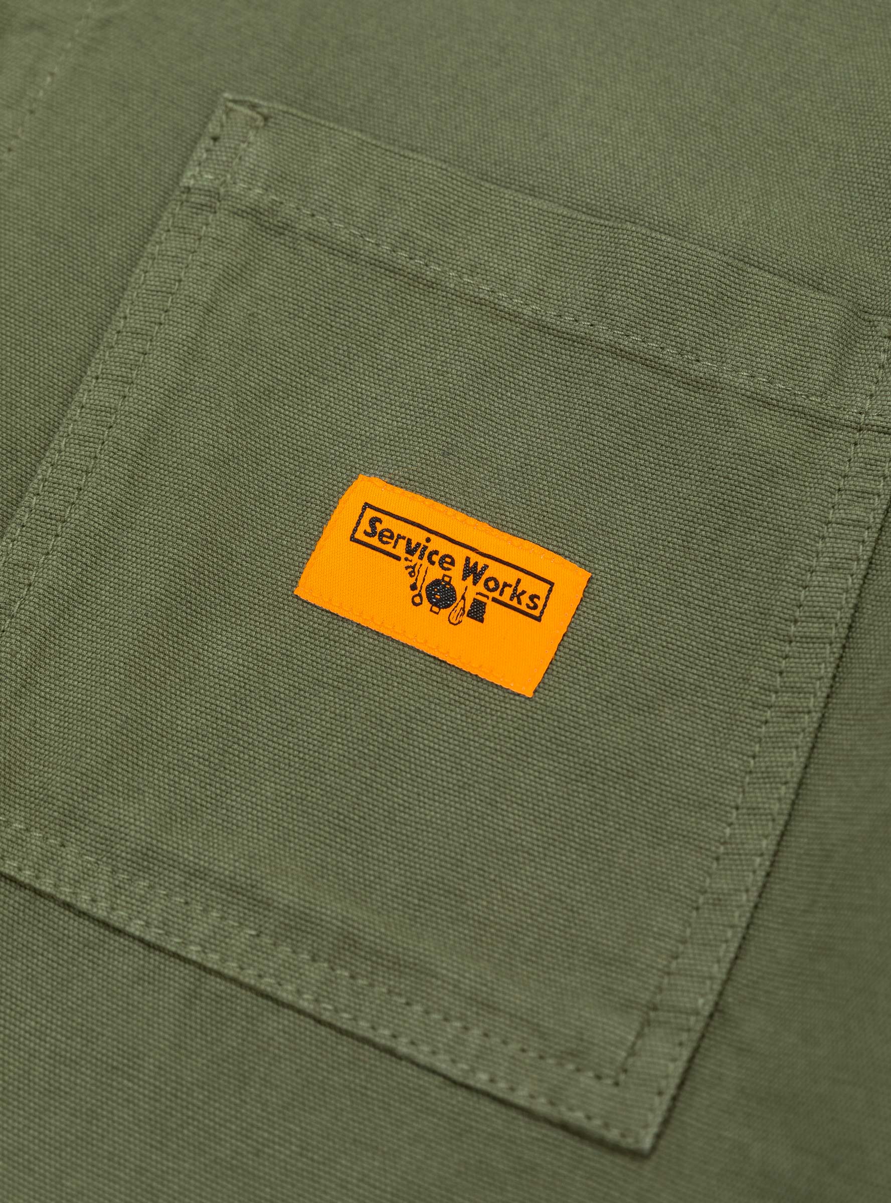 The Canvas Chore Shirt from Service Works comes in Olive and is crafted from 360gsm organic cotton canvas. Offering a regular fit, it's inspired by classic workwear and features a three-pocket design, a five-button closure, and a woven label.