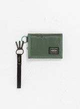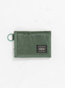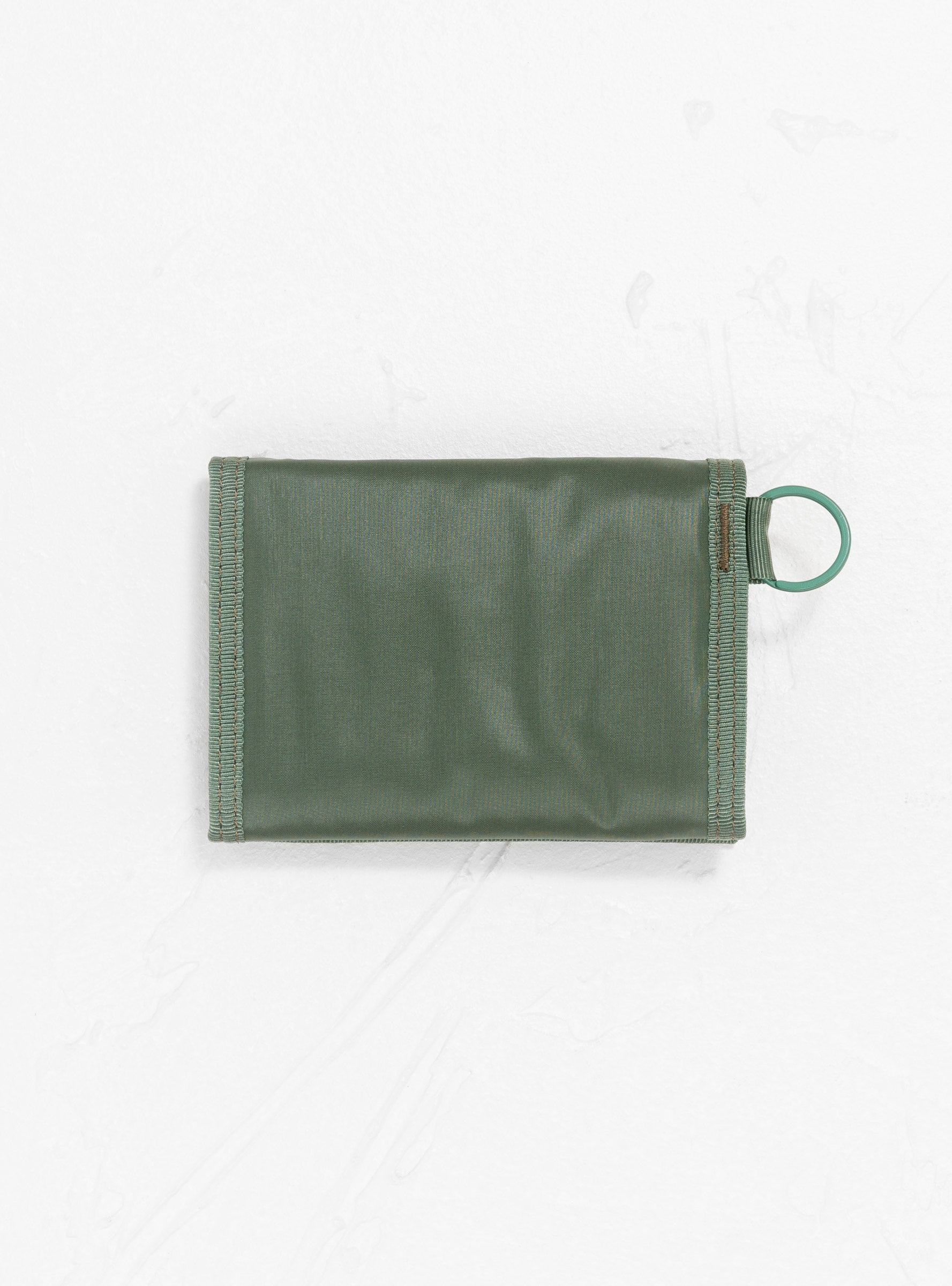 The Capsule Wallet from Porter Yoshida & Co. is made in Japan from a khaki, high shine nylon. Featuring multiple card slots and a bill fold note compartment, it is finished with a number of functional details including a velcro closure and a ring loop, complete with its own lanyard, for attaching to other bags and loops.