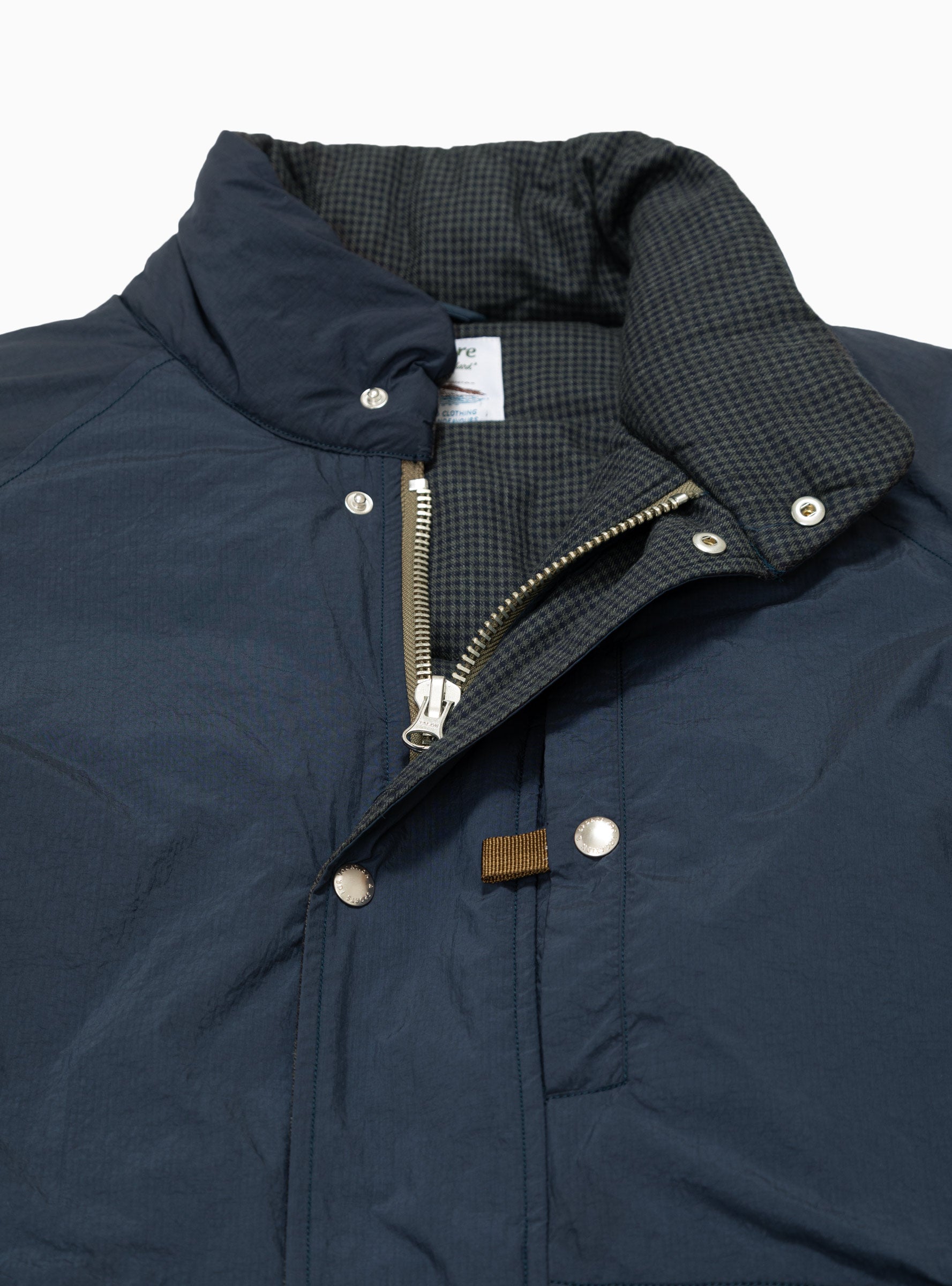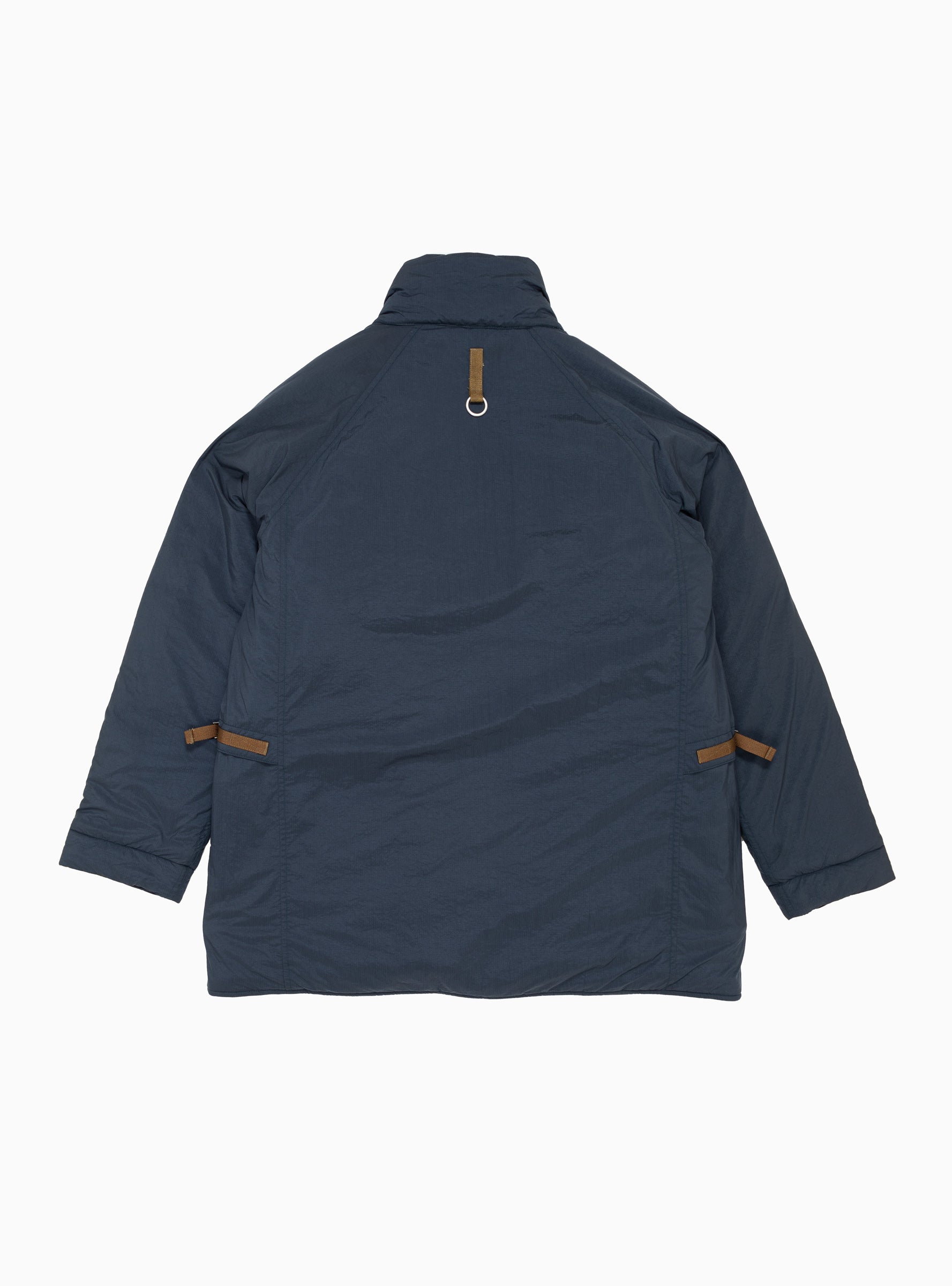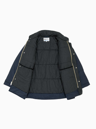 Our take on the classic Car coat, this navy style from Garbstore’s AW23 collection is made from water-repellent Japanese nylon ripstop with Primaloft 180g insulation. Designed for a boxy fit, it features adjustable webbing straps at the waist, an assortment of pockets and a checked cotton lining.