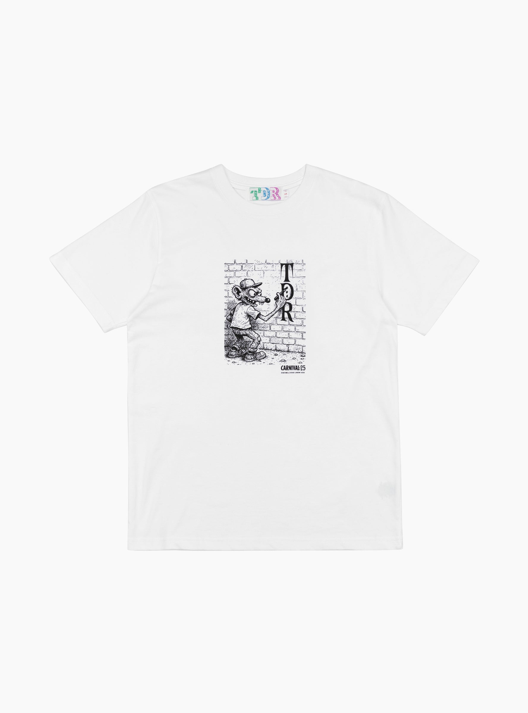 The Carnival '25 T-Shirt in White from TDR is cut from organic cotton and printed in London with a graffiti-style graphic featuring TDR typography and the Carnival '25 date. Produced in limited numbers with an original screen print on the front.