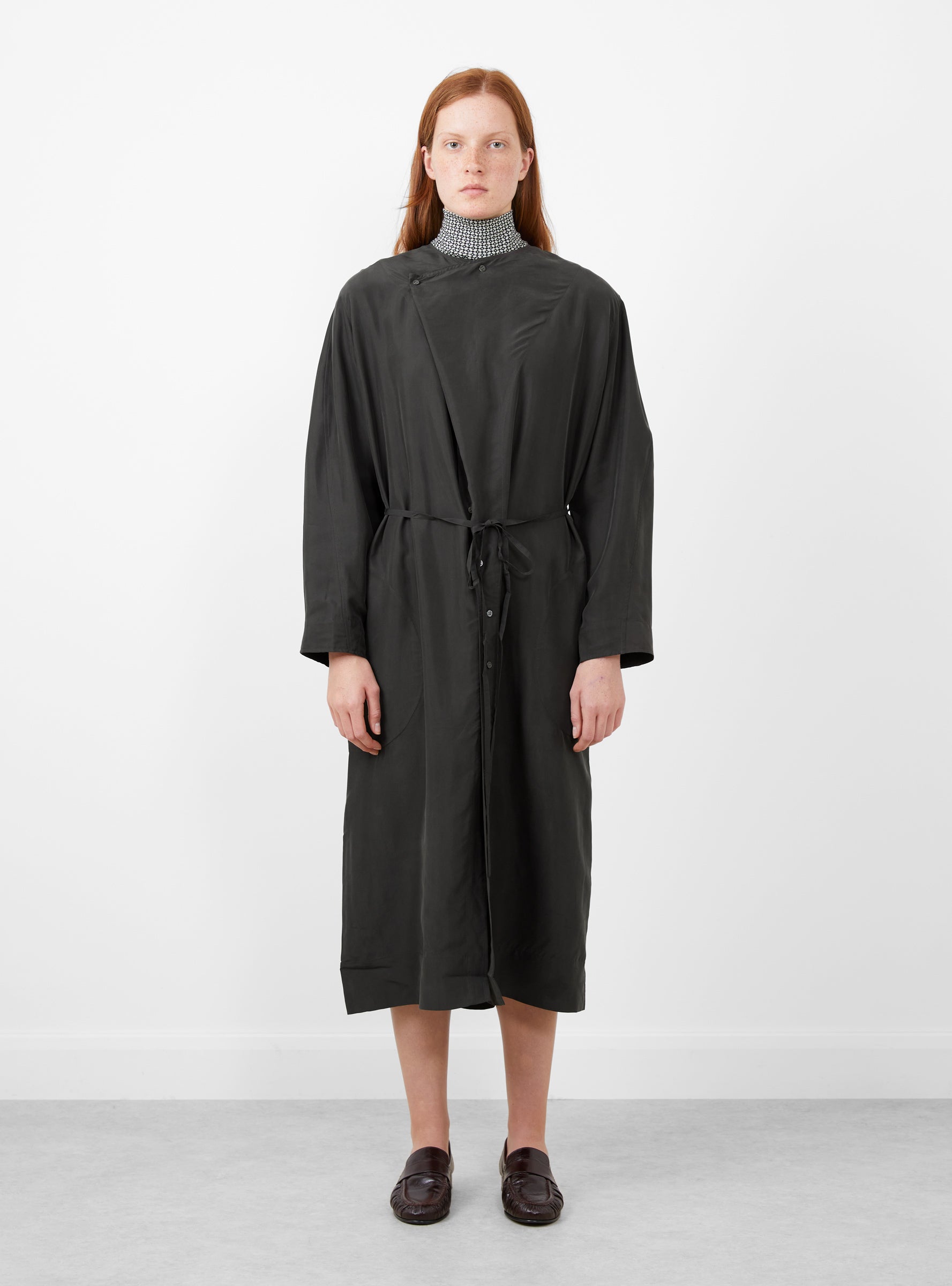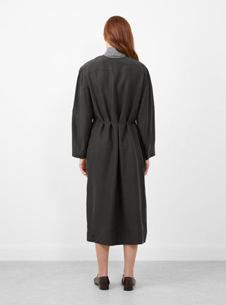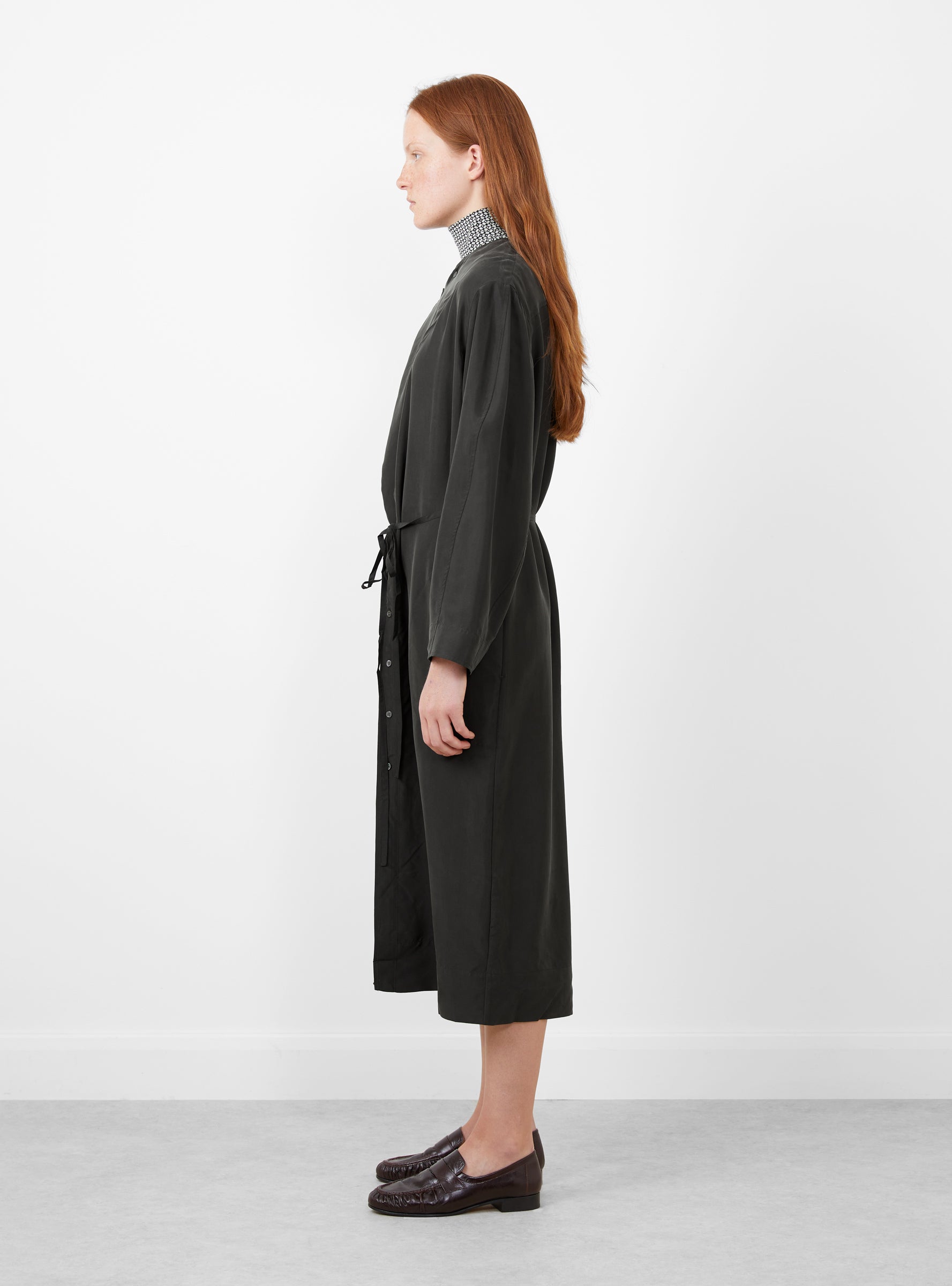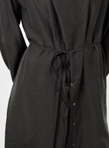 The Cassandre Dress by Soeur arrives in a charcoal colour-way. Cut from 100% Silk, the midi dress falls to a relaxed shape, with dropped shoulders. The striking round neck dress features a smock style closure toward the top and a regular button-down below the waist. A thin tie at the centre creates a delicate gather throughout the garment.