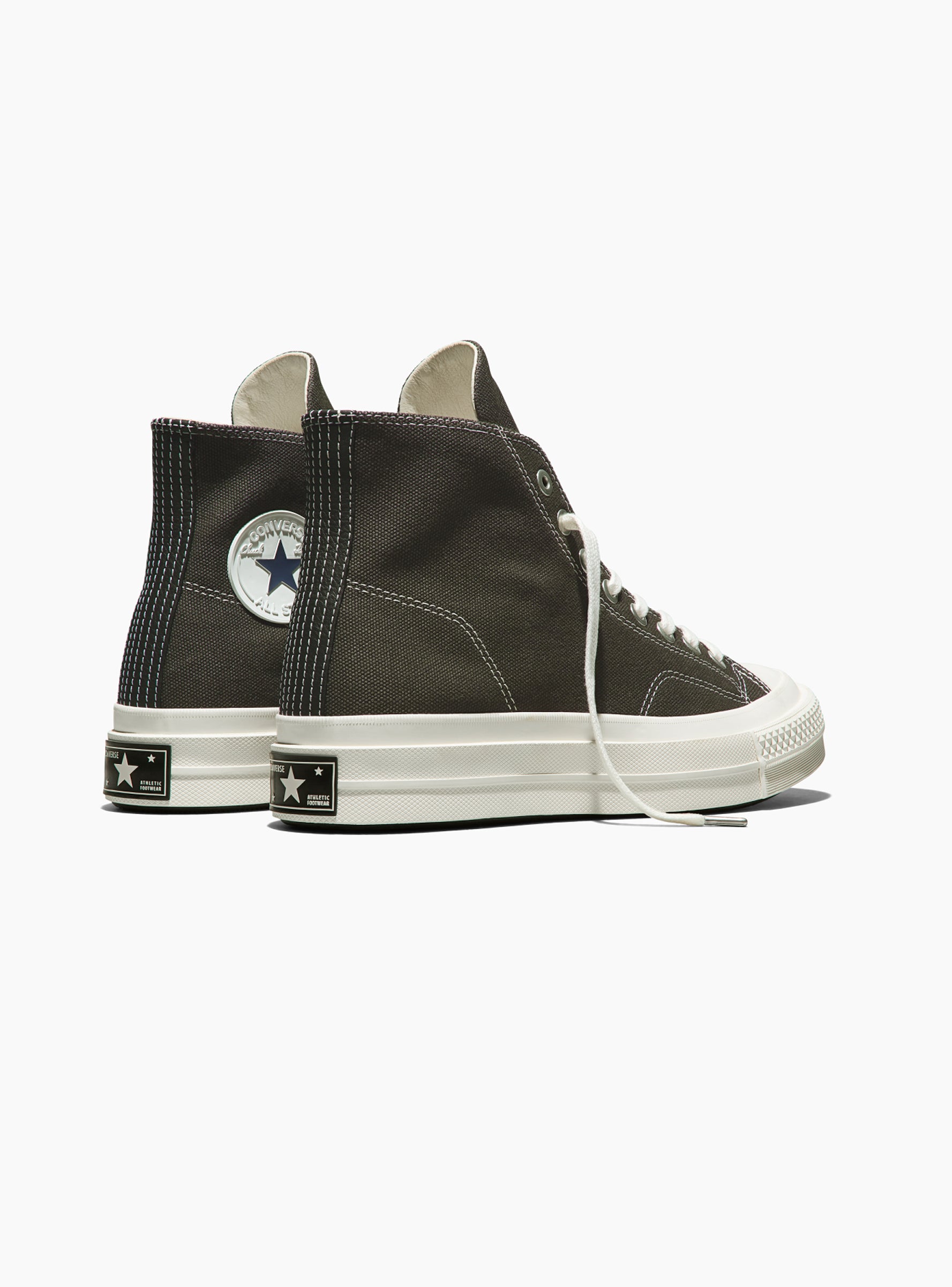 The Chuck Taylor All Star First String Heavyweight Canvas from Converse arrives in Beluga, featuring a black heelstay. This high-top style is finished with a durable Vibram sole and Nike Ambient Air technology outsole, offering enhanced cushioning and a premium take on the classic silhouette.