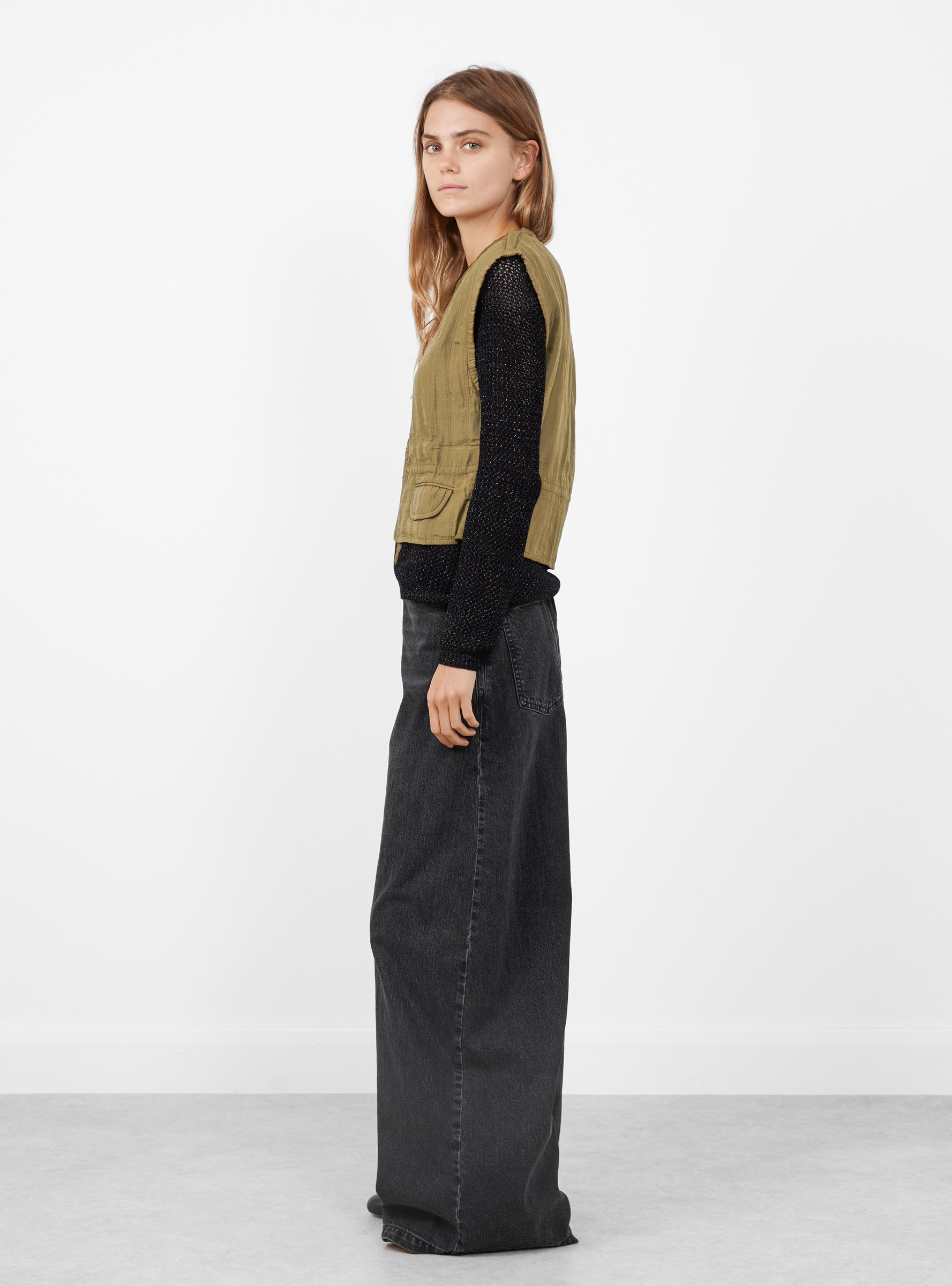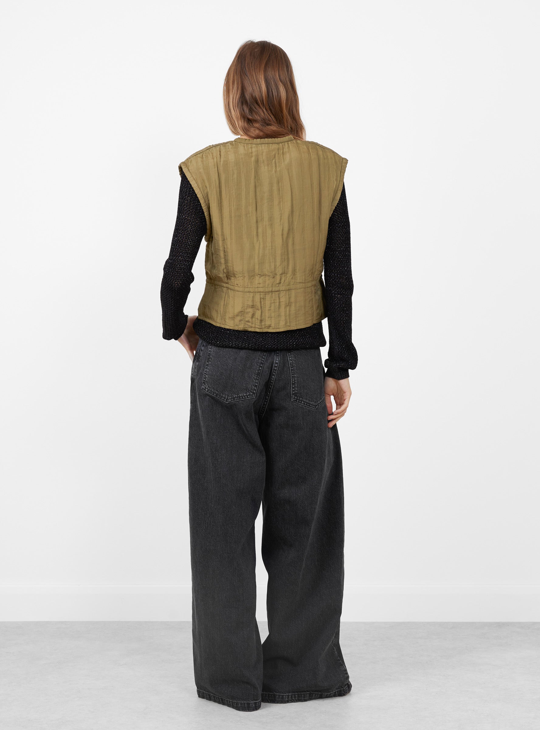 The Clifford Vest in Olive from Rachel Comey is made from lightly padded quilted habotai with a soft cotton lining. It is designed with a rounded neckline, zip closure, and functional side pockets.