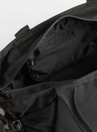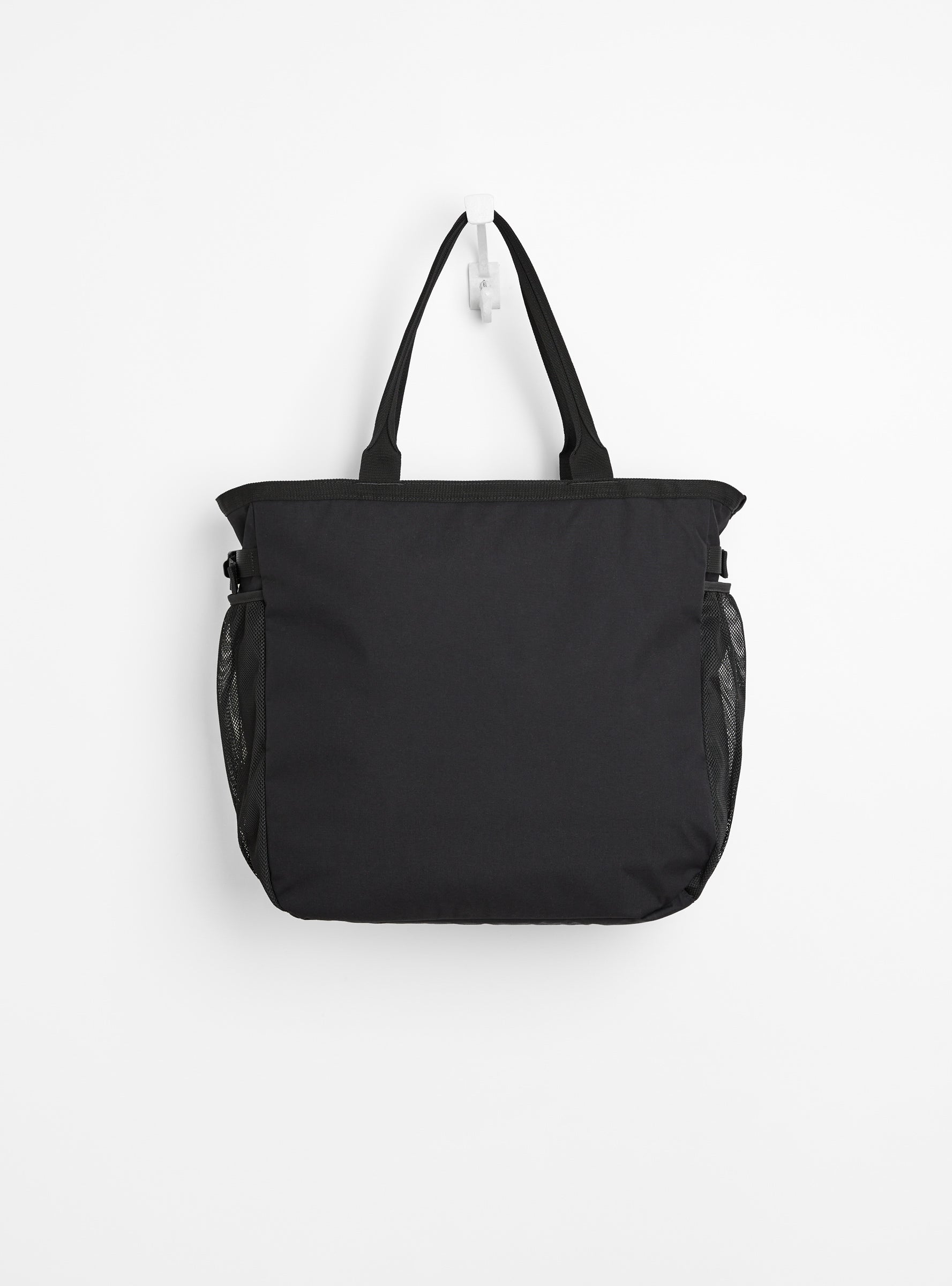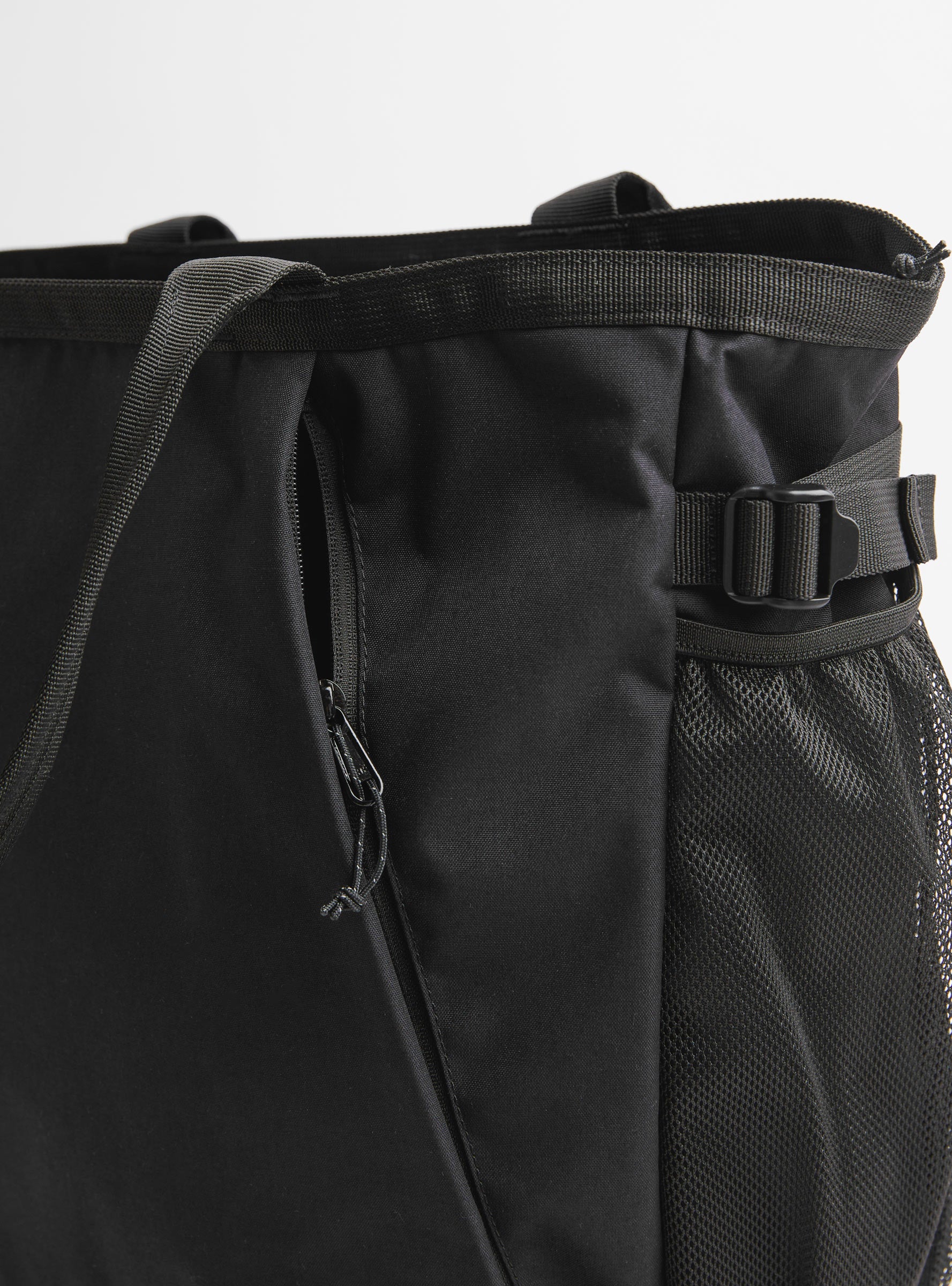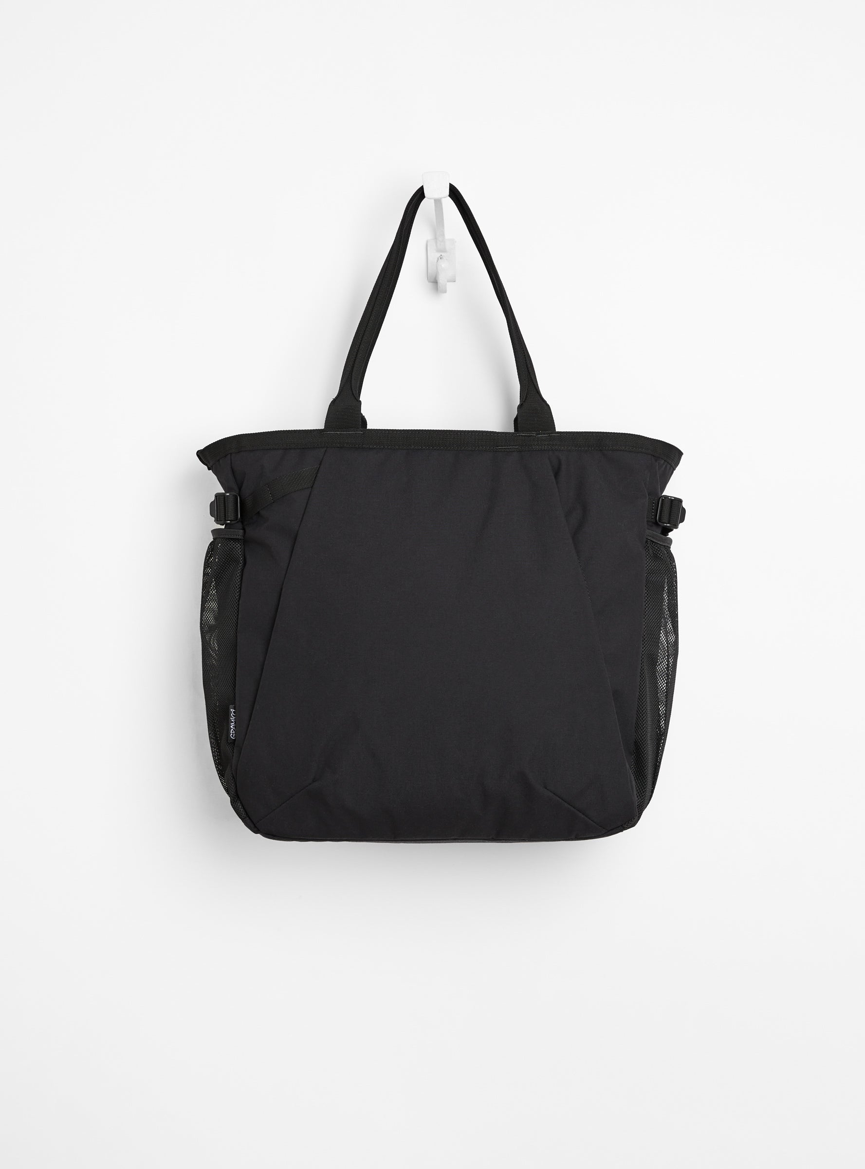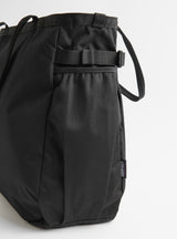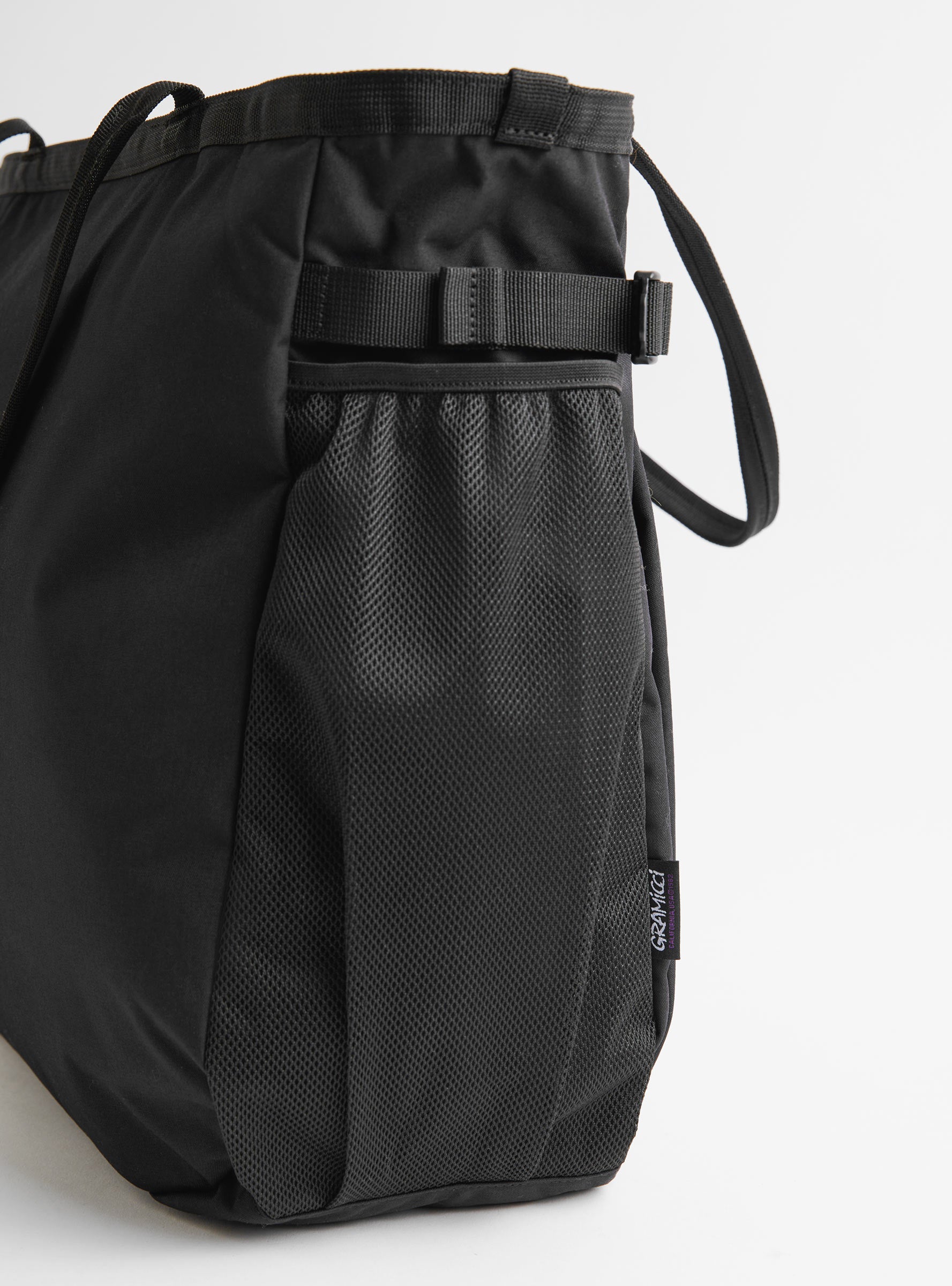 The Cordura Tote Bag from Gramicci arrives in Black. Made from high-density nylon fabric, it features several pockets, including mesh pouches on the side, and offers a spacious 40L main compartment.