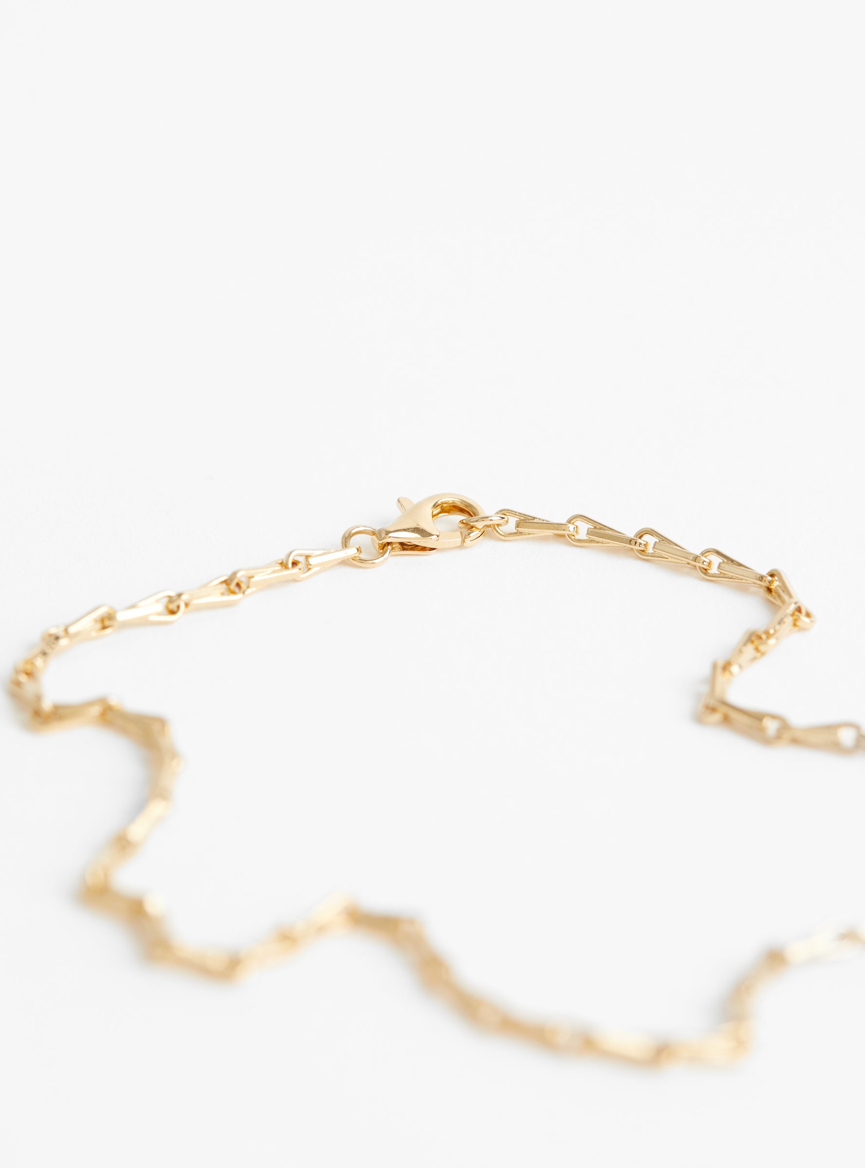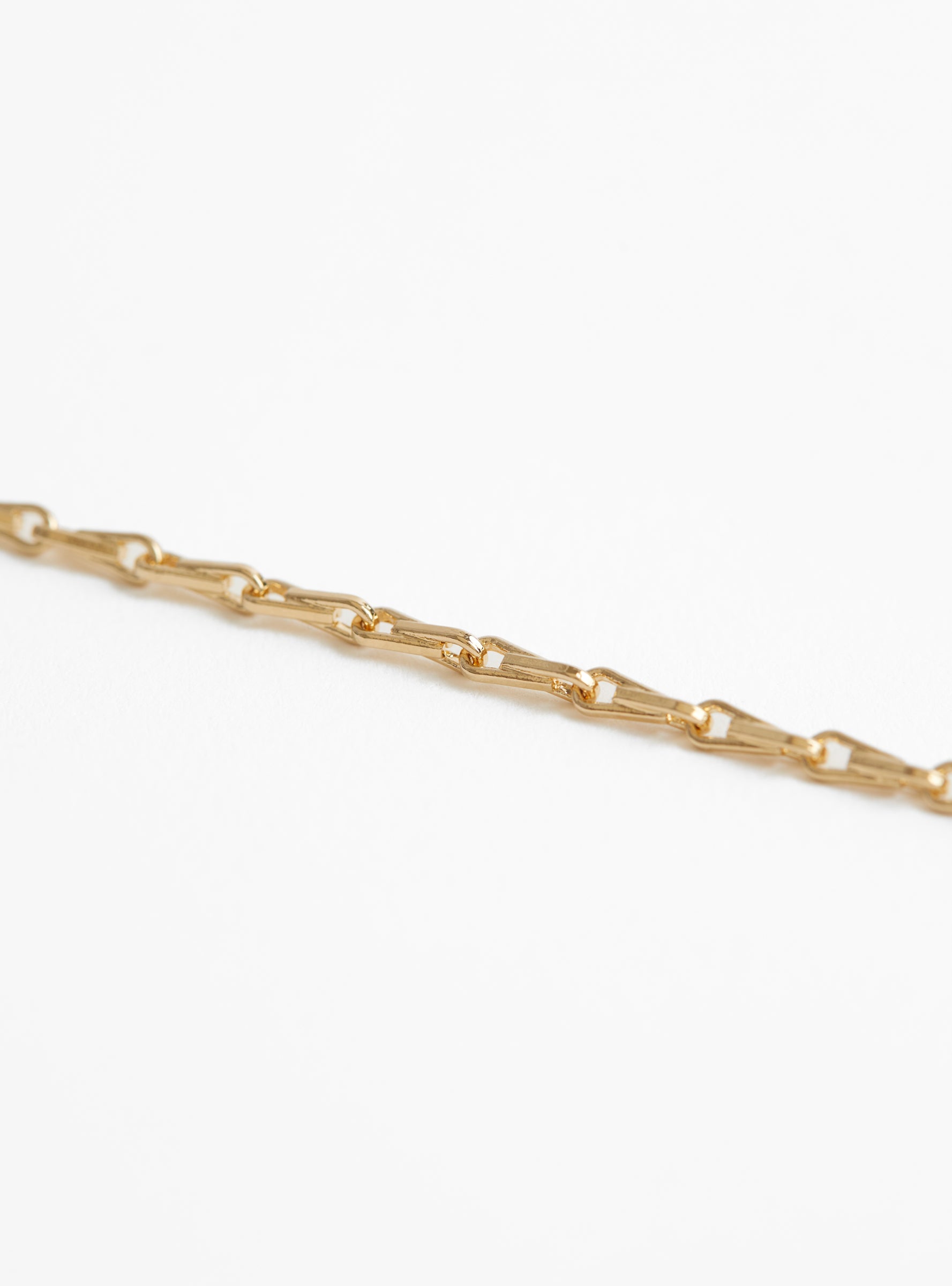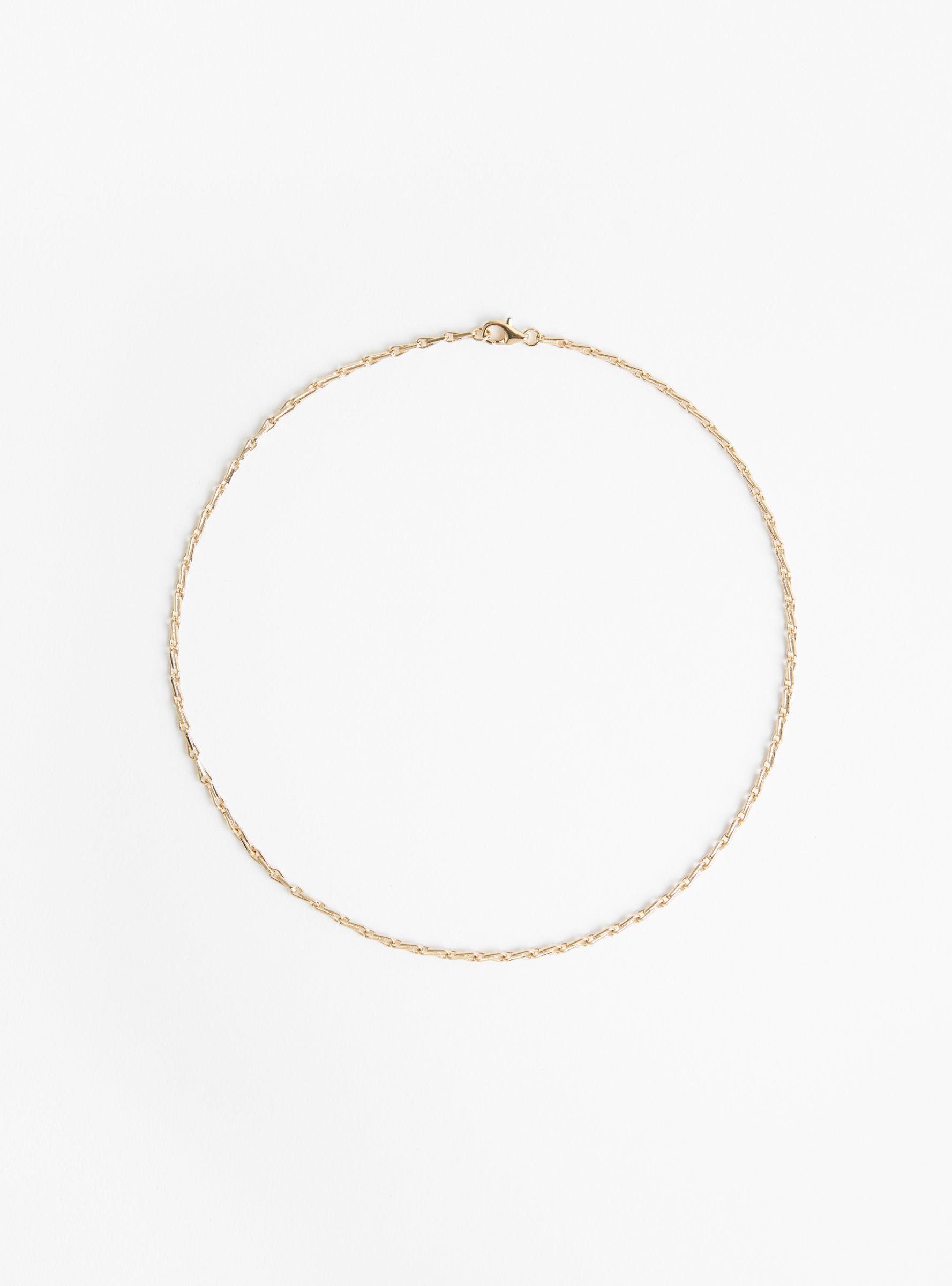 The Corre Chain Necklace from Laura Lombardi comes in Gold. This delicate necklace is crafted from 14k gold-plated brass and features a simple clasp for secure fastening.