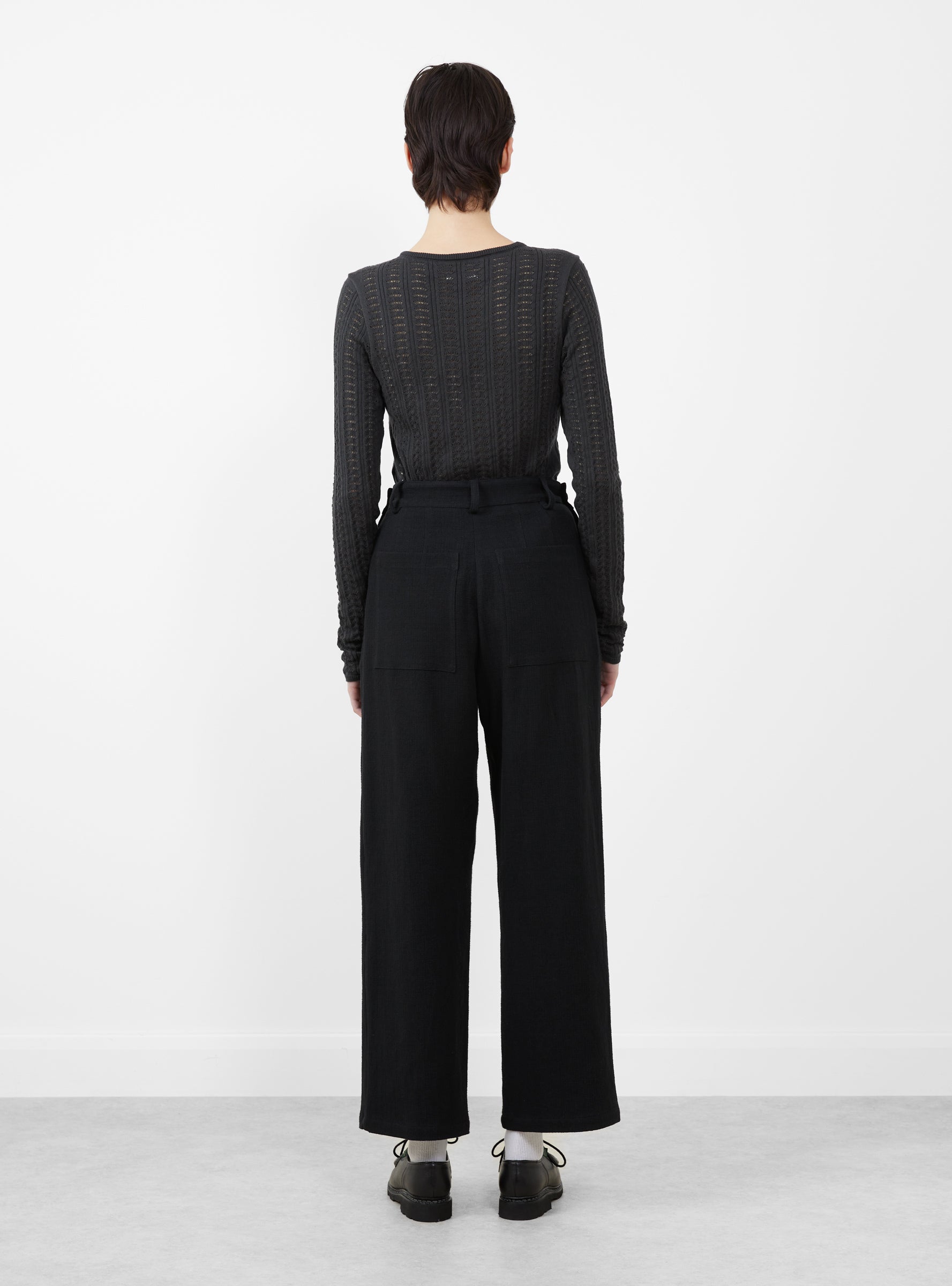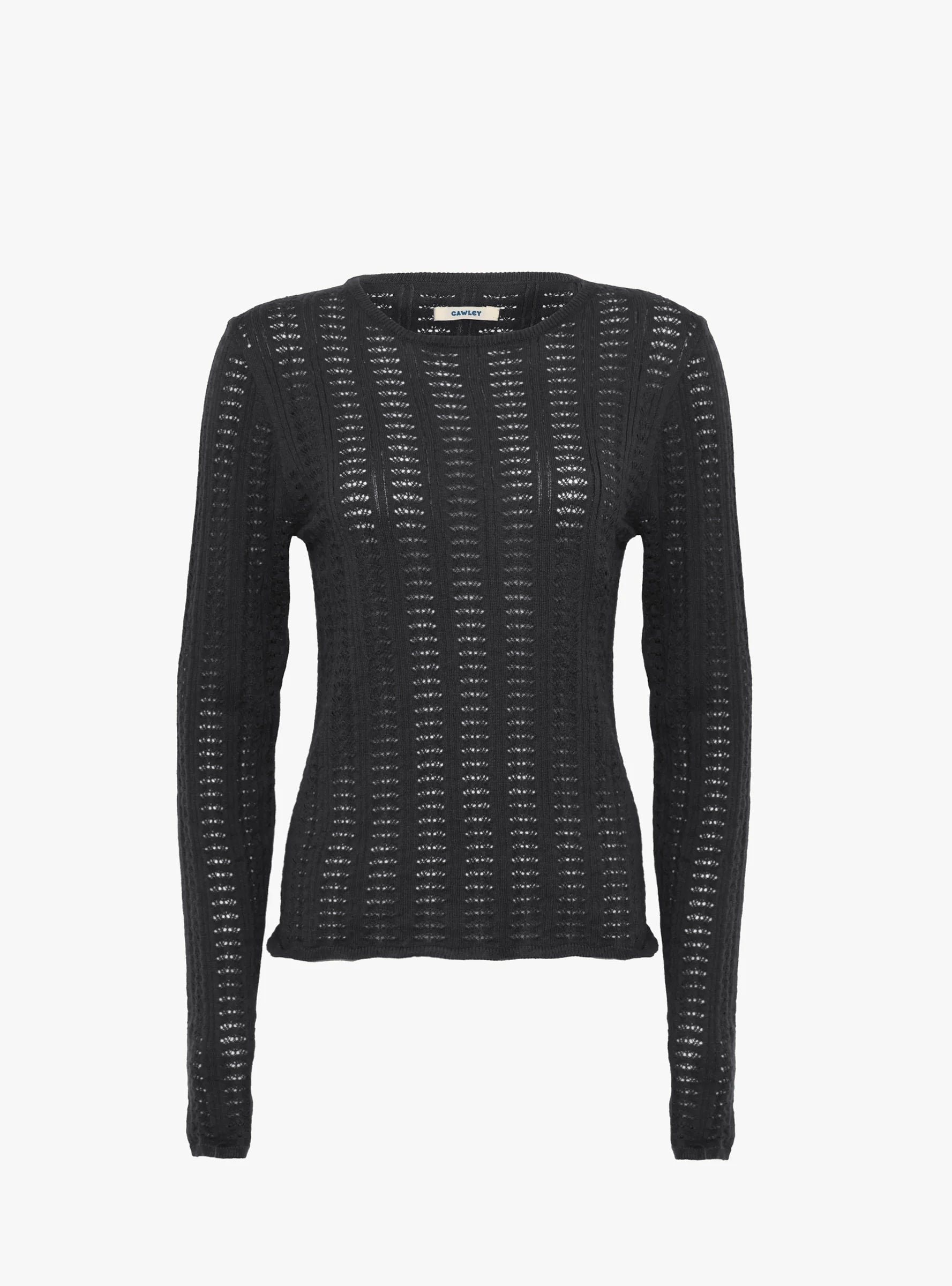 The Cotton Cashmere Long Sleeve Pointelle T Shirt from Cawley comes in Onyx. Made in the UK from a soft cotton and cashmere blend, the top has a lightweight feel with a close, comfortable fit. Fine pointelle detailing runs through the body and sleeves, adding texture while keeping the silhouette clean and easy to layer.