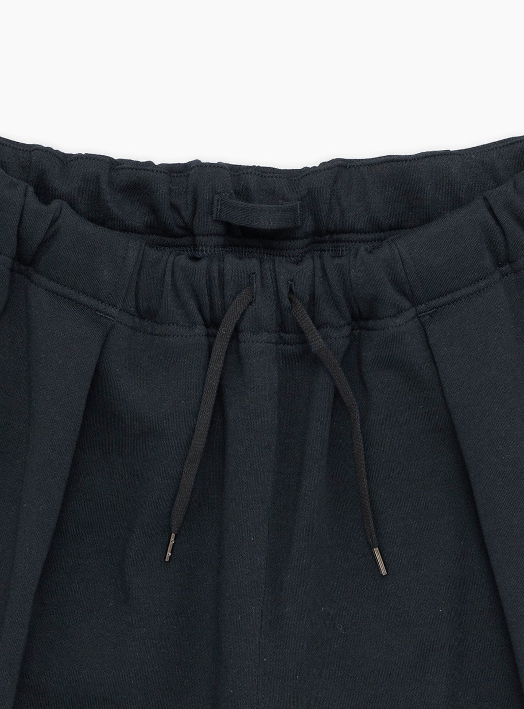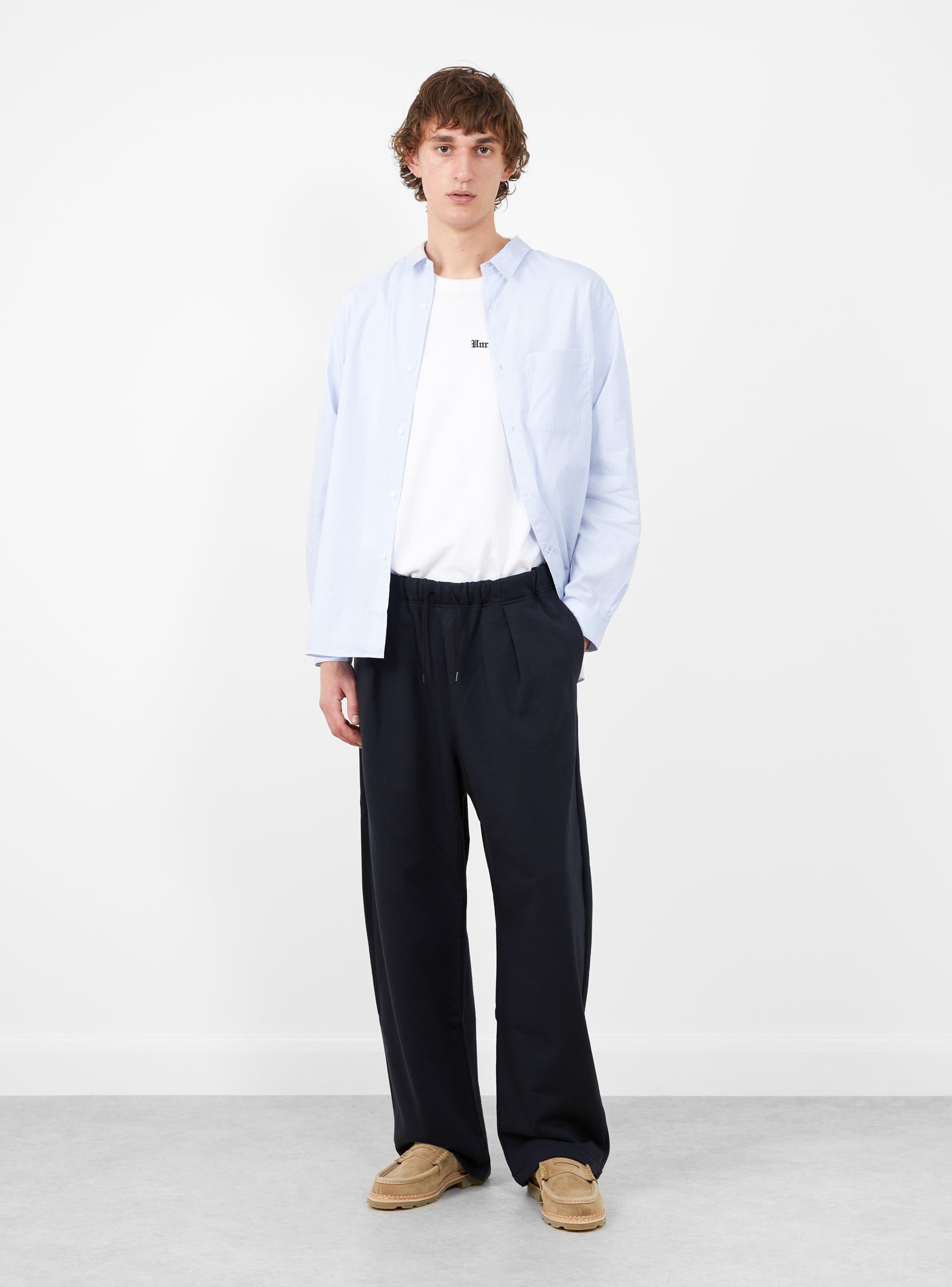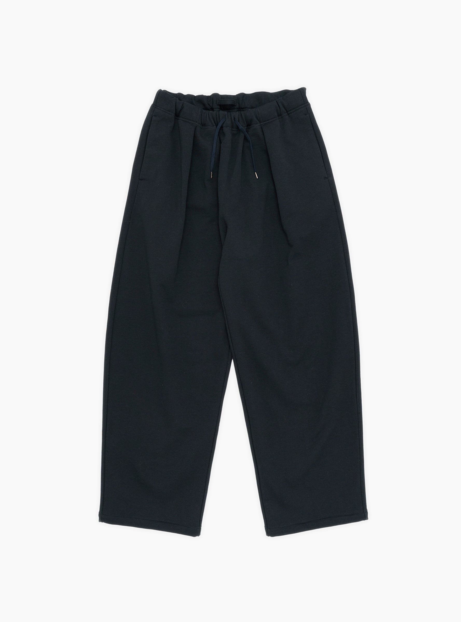 The Cotton Jersey Wide Pants Dark Navy from Still By Hand arrive in a moderately weighted French terry cotton with a soft pile back for comfort. Designed with a widely elasticated drawstring waist, the trousers feature a single inward tuck, curved outseams, and a tapered wide leg. Vertical side pockets and a single back pocket complete the design.