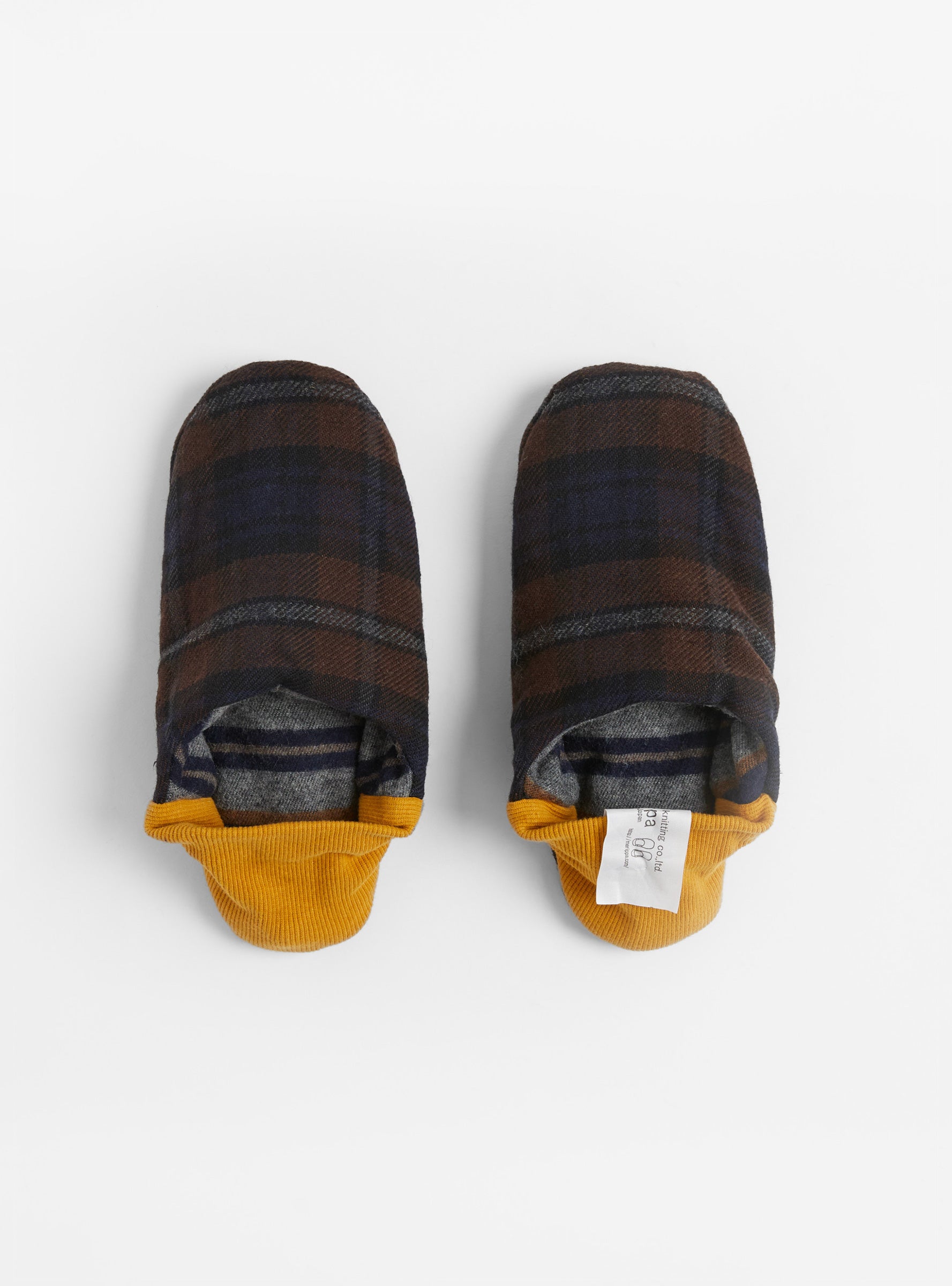 Made in Japan from an ultra-soft cotton blend, these Cotton Wool Border Dark check Yellow slippers from Merippa have collapsible heels for easy wear around the house. They are reversible and packable.