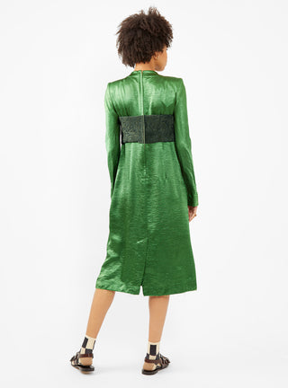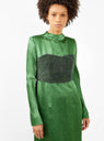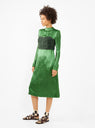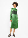 Made in Japan from crushed satin for a crinkled finish, this light-green dress from TOGA PULLA is cut to a figure-skimming silhouette with a mock neck and features flocked panelling at the bust.