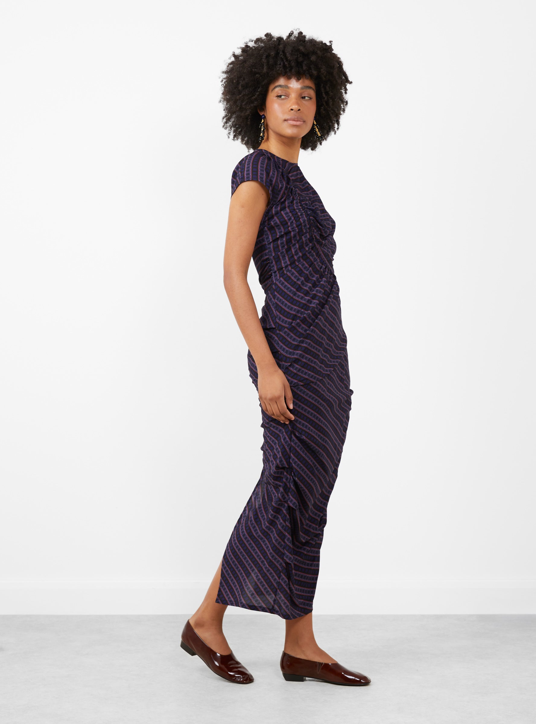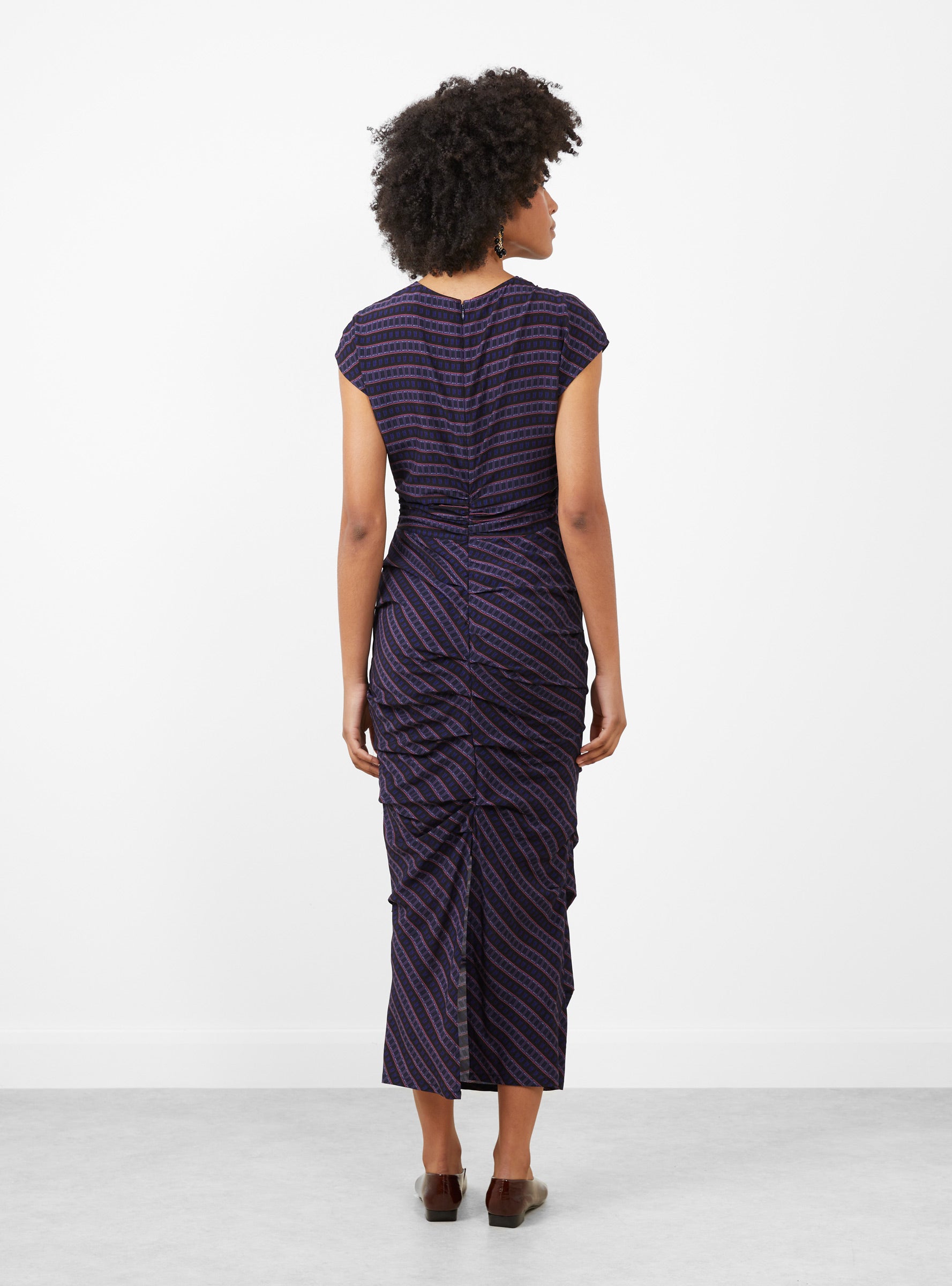 The Delorate Dress from Rachel Comey comes in Midnight and is made from a viscose and spandex blend. This crew neck, short sleeve dress features an asymmetrical gathered and ruched bodice, creating a flattering silhouette, with an invisible zipper at the back for a seamless finish.