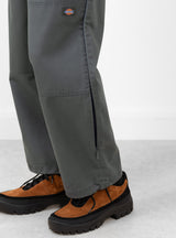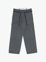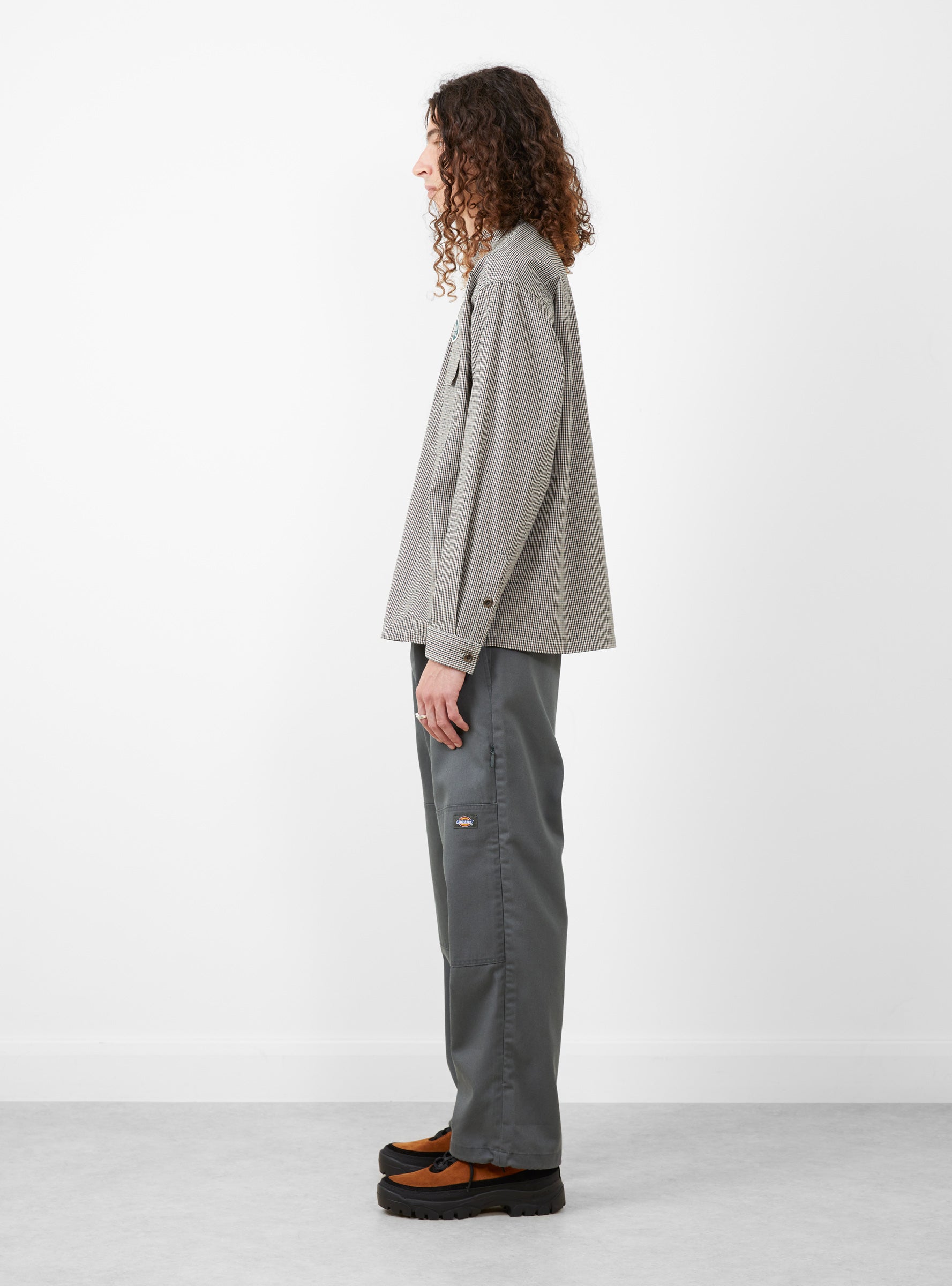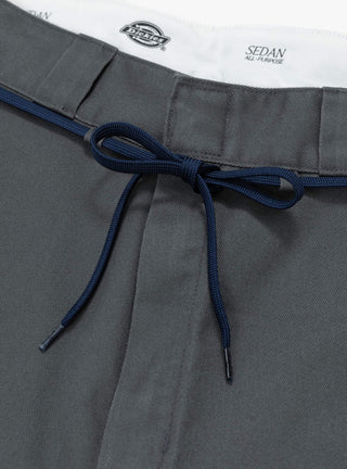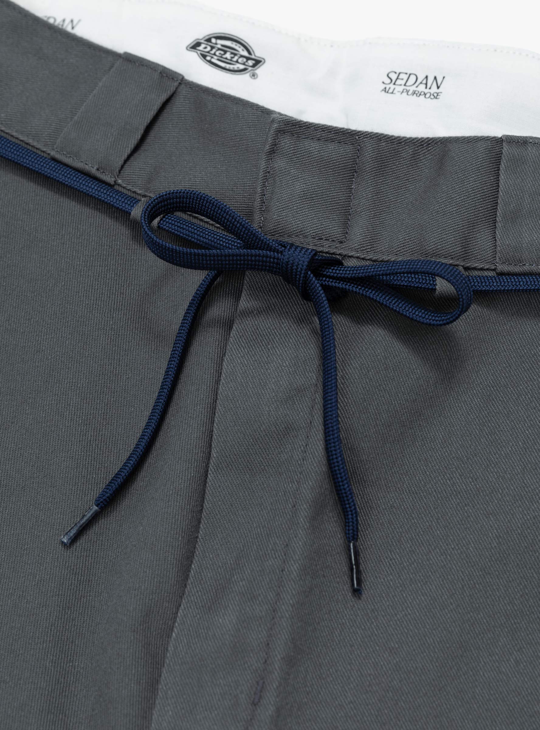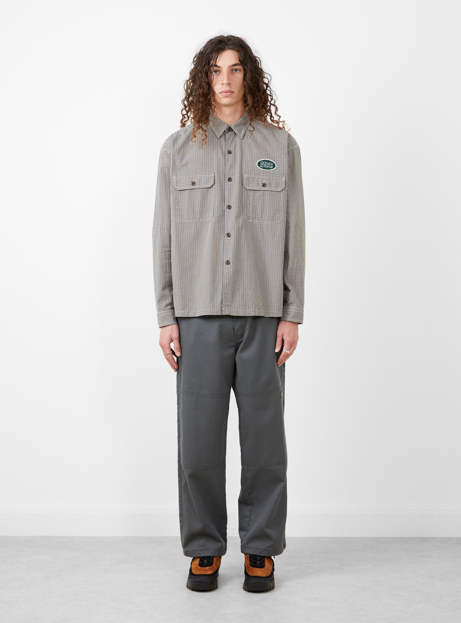 The Sedan x Dickies Double Knees are cut from a charcoal coloured cotton blend. The trousers fall to a relaxed fit with a straight leg and feature a myriad of functional details. A tie at the waist offers styling options, whilst reinforced patches at the knees make for a durable trouser. A zip vent at the side reveals a contrast navy mesh vent, allowing for air or to create a wider look on the trouser. A Dickies patch at the knee rounds off the garment.