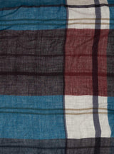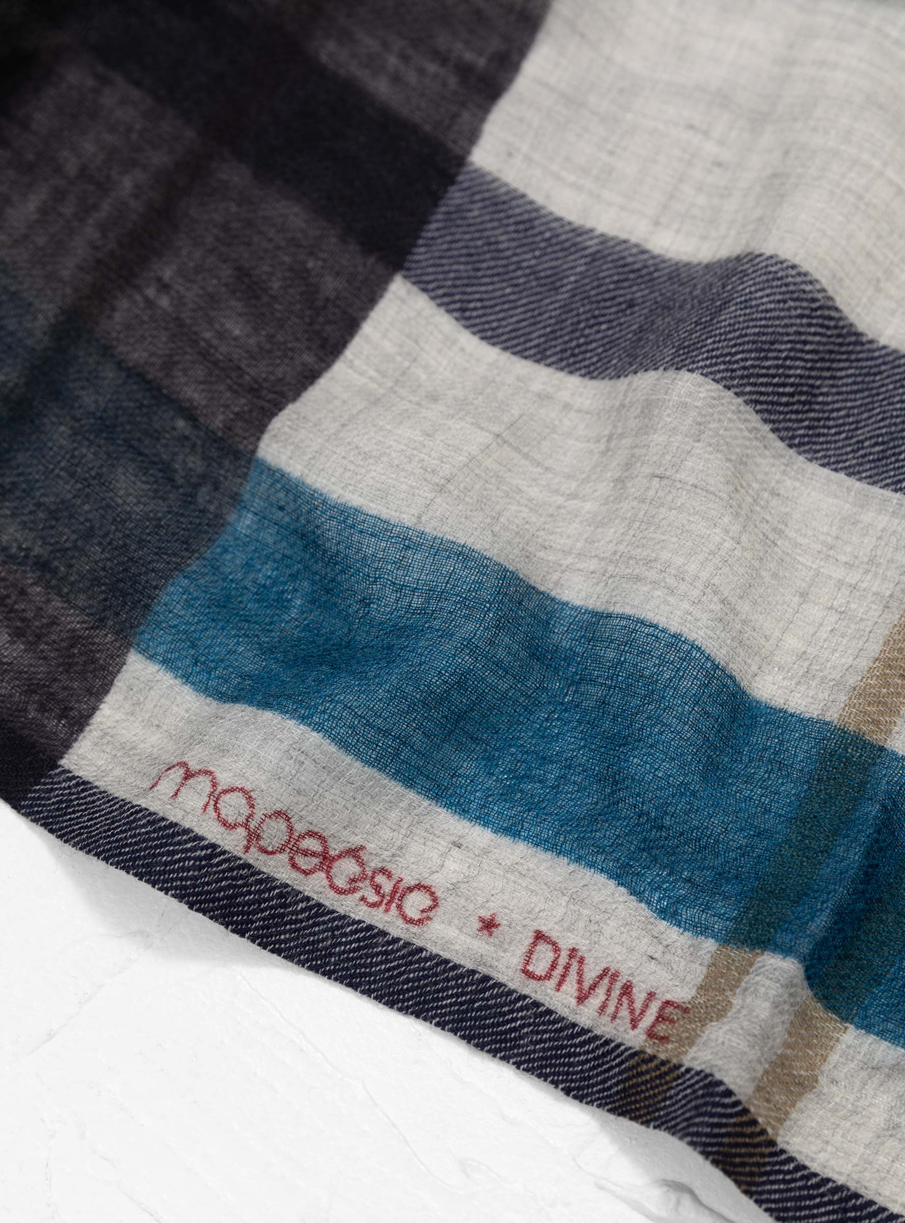 The Divine Scarf from Mapoesie is made by artisans in India from wool. The large scale winter warmer is printed with a mix of checked patterns that blend blue, grey and burgundy.